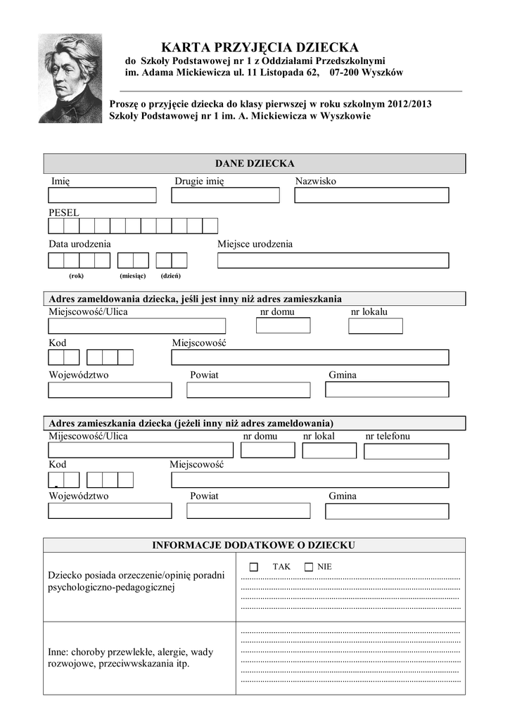 Karta zgłoszenia dziecka do klasy pierwszej szkoły podstawowej