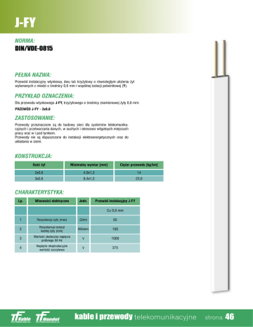 J-FY NORMA: DIN/VDE-0815 PE¸NA NAZWA: Przewód instalacyjny wtynkowy, dwu lub trzy˝y∏owy o równoleg∏ym u∏o˝eniu ˝y∏ wykonanych z miedzi o Êrednicy 0,6 mm i wspólnej izolacji polwinitowej (Y). PRZYK¸AD OZNACZENIA: Dla przewodu wtynkowego J-FY, trzy˝y∏owego o Êrednicy znamionowej ˝y∏y 0,6 mm: PRZEWÓD J-FY - 3x0,6 ZASTOSOWANIE: Przewody przeznaczone sà do budowy sieci dla systemów telekomunikacyjnych i przetwarzania danych, w suchych i okresowo wilgotnych miejscach pracy oraz w i pod tynkiem. Przewody nie sà dopuszczone do instalacji elektroenergetycznych oraz do uk∏adania w ziemi. KONSTRUKCJA: IloÊç ˝y∏ Minimalny wymiar [mm] Ci´˝ar przewodu [kg/km] 2x0,6 4,9x1,2 14 3x0,6 8,4x1,2 23,0 CHARAKTERYSTYKA: Lp. W∏asnoÊci elektryczne Jedn. Przewód instalacyjny J-FY Cu 0,6 mm 1 Rezystancja ˝y∏y (max) Ω/km 65 2 Rezystancja izolacji ka˝dej ˝y∏y (min) MΩxkm 100 3 WartoÊç skuteczna napi´cia próbnego 50 Hz V 1000 4 Napi´cie eksploatacyjne wartoÊç szczytowa V 375 kable i przewody telekomunikacyjne strona 46 J-YY... Bd NORMA: DIN/VDE-0815 PE¸NA NAZWA: Kabel instalacyjny (J), skr´cony p´czkowo (Bd), zawierajàcy jako elementy skr´cane, czwórki gwiazdowe o przewodach miedzianych ˝y∏ o Êrednicy 0,6 mm z izolacjà polwinitowà (Y) oraz pow∏okà poliwinitowà (Y). PRZYK¸AD OZNACZENIA: Kabla instalacyjnego J-YY... Bd, dwudziestoparowego o Êrednicy przewodu miedzianego ˝y∏y 0,6 mm: KABEL J-YY - 20x2x0,6 Bd ZASTOSOWANIE: Kable przeznaczone sà do budowy sieci dla systemów telekomunikacyjnych i przetwarzania danych w suchych i wilgotnych miejscach eksploatacji jak równie˝ i pod tynkiem, na wolnym powietrzu przy sta∏ym zamocowaniu. Kable nie sà dopuszczone do instalacji elektroenergetycznych oraz do uk∏adania w ziemi. KONSTRUKCJA: IloÊç par Max. wymiar zewn´trzny [mm] Masa kabla [kg/km] 2x2x0,6 9,5 38,5 4x2x0,6 6,1 58,7 6x2x0,6 7,0 76,8 10x2x0,6 8,3 110,5 20x2x0,6 11,0 191,5 30x2x0,6 13,1 282,2 50x2x0,6 16,1 435,3 60x2x0,6 17,4 510,7 80x2x0,6 20,0 678,4 100x2x0,6 22,0 826,3 kable i przewody telekomunikacyjne strona 47 J-Y(St)Y... Bd NORMA: DIN/VDE-0815 PE¸NA NAZWA: Kabel instalacyjny (J), skr´cony p´czkowo (Bd), zawierajàcy jako elementy skr´cane, czwórki gwiazdowe o przewodach miedzianych ˝y∏ o Êrednicy 0,6 mm lub 0,8 mm z izolacjà polwinitowà (Y), posiadajàcy ekran statyczny (St) oraz pow∏ok´ poliwinitowà (Y). PRZYK¸AD OZNACZENIA: Dla kabla instalacyjnego J-Y(St)Y... Bd, trzydziestoparowego o Êrednicy przewodu miedzianego 0,8 mm: KABEL J-Y(St)Y - 30x2x0,8 Bd ZASTOSOWANIE: Kable przeznaczone sà do budowy sieci dla systemów telekomunikacyjnych i przetwarzania danych w suchych i wilgotnych miejscach eksploatacji jak równie˝ w i pod tynkiem oraz na wolnym powietrzu przy sta∏ym zamocowaniu. Kable nie sà dopuszczone do instalacji elektroenergetycznych oraz do uk∏adania w ziemi. KONSTRUKCJA: IloÊç par Ârednica zewn´trzna kabla [mm] Masa kabla [kg/km] 2x2x0,6 2x2x0,8 5,0 6,6 41,8 65,7 4x2x0,6 4x2x0,8 6,1 8,4 62,2 102,9 6x2x0,6 6x2x0,8 7,0 9,8 80,5 137,7 10x2x0,6 10x2x0,8 8,4 11,8 114,3 204,2 20x2x0,6 20x2x0,8 11,1 16,3 195,8 376,6 30x2x0,6 30x2x0,8 13,2 19,5 286,9 550,7 50x2x0,6 50x2x0,8 16,2 24,6 440,3 880,0 60x2x0,6 60x2x0,8 17,5 26,6 515,8 1031,5 80x2x0,6 80x2x0,8 20,1 30,6 684,0 1359,8 100x2x0,6 100x2x0,8 22,1 34,1 832,2 1690,8 kable i przewody telekomunikacyjne strona 48 J-H(St)H... Bd NORMA: DIN/VDE-0815 PE¸NA NAZWA: Kabel instalacyjny (J), skr´cony p´czkowo (Bd), zawierajàcy jako elementy skr´cane, czwórki gwiazdowe o przewodach miedzianych ˝y∏ o Êrednicy 0,6 mm lub 0,8 mm z izolacjà z tworzywa bezhalogenowego (H), posiadajàcy ekran statyczny (St) oraz pow∏ok´ z tworzywa bezhalogenowego (H). PRZYK¸AD OZNACZENIA: Dla kabla instalacyjnego J-H(St)H... Bd, szeÊcioparowego o Êrednicy przewodu miedzianego ˝y∏y 0,6 mm: KABEL J-H(St)H - 6x2x0,6 Bd ZASTOSOWANIE: Kable przeznaczone sà do budowy sieci dla systemów telekomunikacyjnych i przetwarzania danych w suchych i wilgotnych miejscach eksploatacji jak równie˝ w i pod tynkiem. Kable nie sà dopuszczone do instalacji elektroenergetycznych oraz do uk∏adania w ziemi. KONSTRUKCJA: IloÊç par Ârednica zewn´trzna kabla [mm] Masa kabla [kg/km] 2x2x0,6 2x2x0,8 5,5 6,6 47,8 66,8 4x2x0,6 4x2x0,8 6,9 8,4 71,4 104,0 6x2x0,6 6x2x0,8 7,9 9,8 92,0 140,0 10x2x0,6 10x2x0,8 9,3 11,8 130,8 205,2 20x2x0,6 20x2x0,8 12,3 16,3 236,8 377,8 30x2x0,6 30x2x0,8 14,9 19,5 328,0 552,6 50x2x0,6 50x2x0,8 18,6 24,6 519,8 877,4 60x2x0,6 60x2x0,8 20,1 26,6 606,2 1027,0 80x2x0,6 80x2x0,8 22,7 30,6 800,4 1353,8 100x2x0,6 100x2x0,8 25,4 34,1 970,6 1683,7 kable i przewody telekomunikacyjne strona 49 Kabel instalacyjny LP. W∏asnoÊci elektryczne Jednostka J-YY... Bd J-Y(St)Y... Bd J-H(St)H... Bd Ârednica przewodu Cu ˝y∏y [mm] 0,6 0,6 0,8 0,6 0,8 130 73,2 130 73,2 1 Rezystancja p´tli ˝y∏ pary (max) Ω/km 130 2 Rezystancja izolacji ka˝dej ˝y∏y (min) MΩxkm 100 100 100 3 PojemnoÊç robocza dla 1 km przy 800 Hz (max) nF 100*1 100*2 120*2 4 Asymetria pojemnoÊci K dla 100m przy 800 Hz (max) K1 K9-12 pF 300*3 100*4 300*3 100*4 300*3 100*4 5 Napi´cie probiercze wartoÊç skuteczna 50 Hz V 800/...*5) 800/800*5) 800/800*5) 6 Napi´cie robocze wartoÊç szczytowa V 300 300 300 1) WartoÊç ta mo˝e zostaç przekroczona o 20% w przypadku kabli majàcych do 4 par ˝y∏ za wyjàtkiem J-YY... Bd z dwoma parami ˝y∏. 2) WartoÊç ta nie mo˝e zostaç przekroczona o 20% w przypadku kabli majàcych 4 pary ˝y∏. 3) Dla 20% pomiarów, lecz nie mniej ni˝ jednego pomiaru, asymetria mo˝e wynosiç do 500pF. 4) Dla 10% pomiarów, ale nie mniej ni˝ czterech pomiarów, asymetria mo˝e wynosiç do 300pF. 5) Pierwsza liczba dotyczy badania ˝y∏a/˝y∏a, druga liczba dotyczy badaƒ ˝y∏a/ekran. kable i przewody telekomunikacyjne strona 50 J-Y(St)Y... Lg NORMA: DIN/VDE-0815 PE¸NA NAZWA: Kabel instalacyjny (J), skr´cony warstwowo (Lg), zawierajàcy jako elementy skr´c