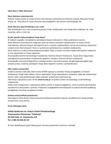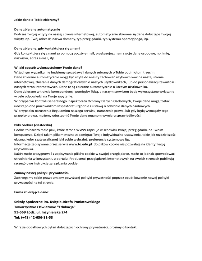 Jakie dane o Tobie zbieramy? Dane zbierane automatycznie Podczas Twojej wizyty na naszej stronie internetowej, automatycznie zbierane są dane dotyczące Twojej wizyty, np. Twój adres IP, nazwa domeny, typ przeglądarki, typ systemu operacyjnego, itp. Dane zbierane, gdy kontaktujesz się z nami Gdy kontaktujesz się z nami za pomocą poczty e-mail, przekazujesz nam swoje dane osobowe, np. imię, nazwisko, adres e-mail, itp. W jaki sposób wykorzystujemy Twoje dane? W żadnym wypadku nie będziemy sprzedawali danych zebranych o Tobie podmiotom trzecim. Dane zbierane automatycznie mogą być użyte do analizy zachowań użytkowników na naszej stronie internetowej, zbierania danych demograficznych o naszych użytkownikach, lub do personalizacji zawartości naszych stron internetowych. Dane te są zbierane automatycznie o każdym użytkowniku. Dane zbierane w trakcie korespondencji pomiędzy Tobą, a naszym serwisem będą wykorzystane wyłącznie w celu odpowiedzi na Twoje zapytanie. W przypadku kontroli Generalnego Inspektoratu Ochrony Danych Osobowych, Twoje dane mogą zostać udostępnione pracownikom Inspektoratu zgodnie z ustawą o ochronie danych osobowych. W przypadku naruszenia Regulaminu naszego serwisu, naruszenia prawa, lub gdy będą wymagały tego przepisy prawa, możemy udostępnić Twoje dane organom wymiaru sprawiedliwości. Pliki cookies (ciasteczka) Cookie to bardzo małe pliki, które strona WWW zapisuje w schowku Twojej przeglądarki, na Twoim komputerze. Dzięki takim plikom można zapamiętać Twoje indywidualne ustawienia, takie jak rozdzielczość ekranu, kolor szaty graficznej jaki sobie wybrałeś, preferencje systemowe itp. Informacje zapisywane przez serwis www.to.edu.pl do plików cookie nie pozwalają na identyfikację użytkownika. Każdy może zrezygnować z zapisywania plików cookie w swojej przeglądarce, może to jednak spowodować utrudnienia w korzystaniu z portalu. Producenci przeglądarek internetowych na swoich stronach publikują szczegółowe instrukcje zarządzania cookie. Zmiany naszej polityki prywatności. Zastrzegamy sobie prawo zmiany powyższej polityki prywatności poprzez opublikowanie nowej polityki prywatności na tej stronie. Firma zbierająca dane: Szkoły Społeczne im. Księcia Józefa Poniatowskiego Towarzystwo Oświatowe "Edukacja" 93-569 Łódź, ul. Inżynierska 2/4 Tel: (+48) 42-636-81-53 W razie dodatkowych pytań dotyczących ochrony prywatności, prosimy o kontakt.