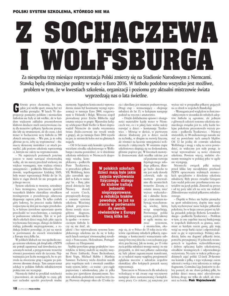 POLSKI SYSTEM SZKOLENIA, KTÓREGO NIE MA Z SOCHACZEWA I WOLFSBURGA Za niespe³na trzy miesi¹ce reprezentacja Polski zmierzy siê na Stadionie Narodowym z Niemcami. Stawk¹ bêd¹ eliminacyjne punkty w walce o Euro 2016. W futbolu podobno wszystko jest mo¿liwe, problem w tym, ¿e w kwestiach szkolenia, organizacji i poziomu gry aktualni mistrzowie œwiata wyprzedzaj¹ nas o lata œwietlne. G ³ównie przez ekonomiê, bo tam, gdzie jest wielki sport, musz¹ byæ te¿ wielkie pieni¹dze. W latach 70. dysproporcje pomiêdzy polskim i niemieckim futbolem nie by³y a¿ tak wielkie, ale w ka¿dym wiêkszym zak³adzie przemys³owym klubowi dzia³acze mieli zarezerwowane etaty dla trenerów i pi³karzy. Spo³eczne pieni¹dze la³y siê strumieniem, ale do czasu, i dziœ trener w Sochaczewie uczy futbolu za 300 z³otych miesiêcznie. – Wie pan, ja to robiê g³ównie po to, ¿eby siê wypromowaæ – t³umaczy skruszony instruktor i a¿ strach pomyœleæ, jaki poziom szkolenia reprezentuj¹ ci, którym nie zale¿y na wypromowaniu. – Na najni¿szych poziomach jesteœmy jeszcze w stanie nawi¹zaæ równorzêdn¹ walkê, ale im starszy przedzia³ wiekowy, im wiêksze wymagania, tym wiêksza ró¿nica umiejêtnoœci – podkreœla Miros³aw Dawidowski, wspó³organizator £ódzkiej SMS, by³y trener reprezentacji Polski do lat 16, która w ci¹gu dwóch lat nie przegra³a ani jednego meczu. System szkolenia to trenerzy, zawodnicy i baza treningowa, tymczasem spoœród wszystkich klubów ekstraklasy oœrodkiem treningowym z prawdziwego zdarzenia dysponuje raptem jeden. To tylko czubek góry lodowej, bo przecie¿ nauka futbolu rozpoczyna siê dziœ ju¿ na etapie przedszkola, w którym ¿ywio³owe uprawianie sportu przechodzi we wszechstronne, a nastêpnie w podstawowe szkolenie. Tyle ¿e w polskich szko³ach dzieci maj¹ byle jakie zajêcia wychowania fizycznego, dlatego do klubów trafiaj¹ jednostki nieprzygotowane, a redukcja braków powoduje, ¿e ju¿ na starcie w porównaniu do swoich rówieœników z Europy trac¹ kilka lat. W polskich klubach nie ma ujednoliconego systemu szkolenia, jak dot¹d nikt z PZPN nie potrafi zapanowaæ nad dowolnoœci¹ stosowanych metod, a przygotowanie trenerów równie¿ pozostawia wiele do ¿yczenia. Najwa¿niejsza jest liczba trenuj¹cych, bo to pozwala na stworzenie grup i siêganie po pañstwowe skromne dotacje. Tym samym temat selekcji w polskim futbolu m³odzie¿owym praktycznie nie wystêpuje. Niemiecki futbol to przyk³ad rzetelnoœci i pracowitoœci, ale nieodleg³e to czasy, gdy nasi zachodni s¹siedzi prze¿ywali trudne 18 22 LIPCA 2014 PI£KA NO¯NA momenty. Sygna³em koniecznoœci wprowa- cia i okreœlany jest mianem podstawowego. dzenia zmian by³ koszmarny wystêp repre- Drugi etap – wzmacniaj¹cy – obejmuje zentacji w turnieju Euro 2000, rozgrywa- m³odzie¿ do lat 15, w kolejnym nastêpuje nym w Holandii i Belgii. Wówczas zespó³ podzia³ na wyczyn i amatorstwo. prowadzony przez Ericha Ribbecka zaj¹³ – Dziêki dok³adnemu opisowi i dostêpostatnie miejsce w grupie. Wprawdzie kolej- noœci materia³ów ka¿dy trener w Niemny selekcjoner Rudi Voeller w Korei dopro- czech wie, co i w jakiej fazie wieku nale¿y wadzi³ Niemców do tytu³u wicemistrza rozwijaæ u dzieci – kontynuuje Tyszkieœwiata (bia³o-czerwoni nie wyszli wtedy wicz. – Mówi¹c w skrócie, w pierwszym z grupy), ale po turnieju Euro 2004 wysz³o okresie k³adziony jest u dzieci nacisk na jaw, ¿e niemiecki kolos stoi na glinianych na technikê, w drugim na rozwój fizyczny, nogach. ale równie¿ na ³¹czenie umiejêtnoœci tech– Od 14 lat mam sta³y kontakt z przedsta- nicznych i taktycznych. W ostatnim etapie wicielami oœrodka szkoleniowego w Wolfs- szkoleniowcy skupiaj¹ siê na doskonaleniu, burgu i mo¿na powiedzieæ, ¿e w dziedzinie g³ównie poprzez grê. W kwestiach motoryszkolenia m³odzie¿y w Niemczech dyspo- ki dostosowanie skali wysi³ku zale¿ne jest nujê wiedz¹ komod poziomu rozwoju pleksow¹ – podkreœla fizjologicznego m³oPiotr Tyszkiewicz, dego pi³karza, dlateW polskich szko³ach w przesz³oœci pi³karz go has³o: dziecko to VfL Wolfsburg, który nie jest ma³y doros³y dzieci maj¹ byle jakie jako zawodnik spêcz³owiek, sta³o siê zajêcia wychowania dzi³ za £ab¹ w sumie mottem przewodfizycznego, dlatego piêæ lat. – Baty, jakie nim dla niemieckich do klubów trafiaj¹ przed dziesiêciu laty trenerów. Zreszt¹ ci jednostki Niemcy dostali ostatni musz¹ mieæ od rezerw Czech, wy¿sze wykszta³cenieprzygotowane, przyspieszy³y decyzjê nie i aktualne licena redukcja braków o zmianie systemu cje, a tym samym napowoduje, ¿e ju¿ na szkolenia. Wczeœniej bywaj¹ wszechstronstarcie w porównaniu jednak przeprowan¹ wiedzê, któr¹ do swoich dzona zosta³a szczewci¹¿ uzupe³niaj¹. rówieœników z Europy gó³owa diagnoza, Porównuj¹c polski po której wnioski bysystem, je¿eli takowy trac¹ kilka lat. ³y zgodne – w nowow ogóle mo¿na naczesnym futbolu lizwaæ systemem, czy siê nie iloœæ, ale z niemieckim, okajakoœæ i bez wprowadzenia systemu kom- zuje siê, ¿e w Polsce do 15 roku ¿ycia w³apleksowego szkolenia nie da siê w kolej- œciwie zaje¿d¿amy m³odych pi³karzy, zaponych latach nawi¹zaæ równorzêdnej rywali- minaj¹c o koniecznoœci wzmacniania subzacji z Francuzami, Holendrami, Portugal- stancji fizycznej dziecka i oszczêdzaniu jego czykami czy Hiszpanami. sfery psychicznej. Jak na ironiê, po 15 roku Szybko powo³ano grupê praktyków i teo- ¿ycia polska m³odzie¿ trenuje mniej i to nie retyków, w której znaleŸli siê miêdzy inny- przypadek, ¿e dziœ nasi pi³karze zadowalaj¹ mi Pierre Littbarski, Franz Beckenbauer, siê byle jakimi zagranicznymi transferami, Berti Vogts, Michael Skibbe i Matthias ¿e co tydzieñ mamy w¹tpliw¹ przyjemnoœæ Sammer. Fachowcy wielu dziedzin usiedli ogl¹dania meczów z udzia³em zespo³ów przy wspólnym stole i stworzyli zunifiko- ekstraklasy albo kolejnych po