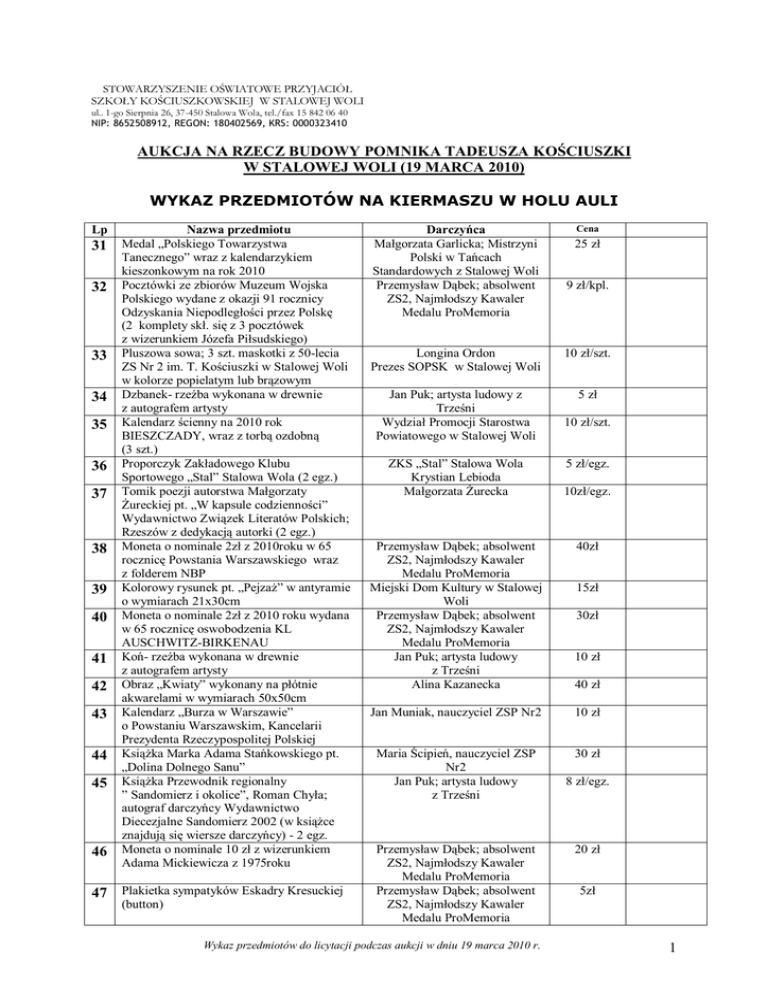 STOWARZYSZENIE OŚWIATOWE PRZYJACIÓŁ SZKOŁY KOŚCIUSZKOWSKIEJ W STALOWEJ WOLI ul.. 1-go Sierpnia 26, 37-450 Stalowa Wola, tel./fax 15 842 06 40 NIP: 8652508912, REGON: 180402569, KRS: 0000323410 AUKCJA NA RZECZ BUDOWY POMNIKA TADEUSZA KOŚCIUSZKI W STALOWEJ WOLI (19 MARCA 2010) WYKAZ PRZEDMIOTÓW NA KIERMASZU W HOLU AULI Lp 31 32 33 34 35 36 37 38 39 40 41 42 43 44 45 46 Nazwa przedmiotu Medal „Polskiego Towarzystwa Tanecznego” wraz z kalendarzykiem kieszonkowym na rok 2010 Pocztówki ze zbiorów Muzeum Wojska Polskiego wydane z okazji 91 rocznicy Odzyskania Niepodległości przez Polskę (2 komplety skł. się z 3 pocztówek z wizerunkiem Józefa Piłsudskiego) Pluszowa sowa; 3 szt. maskotki z 50-lecia ZS Nr 2 im. T. Kościuszki w Stalowej Woli w kolorze popielatym lub brązowym Dzbanek- rzeźba wykonana w drewnie z autografem artysty Kalendarz ścienny na 2010 rok BIESZCZADY, wraz z torbą ozdobną (3 szt.) Proporczyk Zakładowego Klubu Sportowego „Stal” Stalowa Wola (2 egz.) Tomik poezji autorstwa Małgorzaty Żureckiej pt. „W kapsule codzienności” Wydawnictwo Związek Literatów Polskich; Rzeszów z dedykacją autorki (2 egz.) Moneta o nominale 2zł z 2010roku w 65 rocznicę Powstania Warszawskiego wraz z folderem NBP Kolorowy rysunek pt. „Pejzaż” w antyramie o wymiarach 21x30cm Moneta o nominale 2zł z 2010 roku wydana w 65 rocznicę oswobodzenia KL AUSCHWITZ-BIRKENAU Koń- rzeźba wykonana w drewnie z autografem artysty Obraz „Kwiaty” wykonany na płótnie akwarelami w wymiarach 50x50cm Kalendarz „Burza w Warszawie” o Powstaniu Warszawskim, Kancelarii Prezydenta Rzeczypospolitej Polskiej Książka Marka Adama Stańkowskiego pt. „Dolina Dolnego Sanu” Książka Przewodnik regionalny ” Sandomierz i okolice”, Roman Chyła; autograf darczyńcy Wydawnictwo Diecezjalne Sandomierz 2002 (w książce znajdują się wiersze darczyńcy) - 2 egz. Moneta o nominale 10 zł z wizerunkiem Adama Mickiewicza z 1975roku 47 Plakietka sympatyków Eskadry Kresuckiej (button) Darczyńca Małgorzata Garlicka; Mistrzyni Polski w Tańcach Standardowych z Stalowej Woli Przemysław Dąbek; absolwent ZS2, Najmłodszy Kawaler Medalu ProMemoria Cena 25 zł 9 zł/kpl. Longina Ordon Prezes SOPSK w Stalowej Woli 10 zł/szt. Jan Puk; artysta ludowy z Trześni Wydział Promocji Starostwa Powiatowego w Stalowej Woli 5 zł ZKS „Stal” Stalowa Wola Krystian Lebioda Małgorzata Żurecka Przemysław Dąbek; absolwent ZS2, Najmłodszy Kawaler Medalu ProMemoria Miejski Dom Kultury w Stalowej Woli Przemysław Dąbek; absolwent ZS2, Najmłodszy Kawaler Medalu ProMemoria Jan Puk; artysta ludowy z Trześni Alina Kazanecka 10 zł/szt. 5 zł/egz. 10zł/egz. 40zł 15zł 30zł 10 zł 40 zł Jan Muniak, nauczyciel ZSP Nr2 10 zł Maria Ścipień, nauczyciel ZSP Nr2 Jan Puk; artysta ludowy z Trześni 30 zł Przemysław Dąbek; absolwent ZS2, Najmłodszy Kawaler Medalu ProMemoria Przemysław Dąbek; absolwent ZS2, Najmłodszy Kawaler Medalu ProMemoria Wykaz przedmiotów do licytacji podczas aukcji w dniu 19 marca 2010 r. 8 zł/egz. 20 zł 5zł 1 Lp 48 Nazwa przedmiotu Doniczka wykonana z gipsu z ozdobnym wizerunkiem twarzy dziecka 49 Plakat malowany na płótnie z uchwytami 50 51 52 53 54 bambusowymi przedstawiającymi mecz piłki nożnej Książka Andrzeja Zahorskiego pt.: ”Ignacy Wyssogota Zakrzewski Prezydent Warszawy”, Państwowy Instytut Wydawniczy 1979r. z dedykacją i autografem darczyńcy Wiatrak- rzeźba wykonana w drewnie z autografem artysty Obraz na płótnie z uchwytami bambusowymi przedstawiający wycieczkę górską Książka Lucyna Łysiak-Kosowska „Parafia Trześń i okolice podczas wojen światowych”, Gorzyce 2008r. Książka pt. „Społeczeństwo i Rodzina”. Stalowowolskie Studia Katolickiego Uniwersytetu Lubelskiego Jana Pawła II. Nr 20, Stalowa Wola 2009 55 Kolorowy rysunek pt. „Martwa natura” 56 w antyramie 21x30cm Banknot o nominale 100zł z 1986r z wizerunkiem Ludwika Waryńskiego 57 Banknot o niminale 50zł z 1988r. z wizerunkiem Karola Świerczewskiego 58 Moneta o nominale 2 zł z 2010r. Polskiej 59 60 61 62 Reprezentacji Olimpijskiej Vancouver 2010 wraz z folderem NBP Książka ks. Krzysztofa Pastuszaka pt.: ”Halinka…Radość życia.Joy of life”. Wydawnictwo Jedność Kielce Kolorowy rysunek pt. „Lilie” w antyramie 40x30cm Kolorowy rysunek pt. „Wiosna” w antyramie 30x40cm Komplet monet obiegowych PRL zawierający 12 monet 63 Moneta wydana specjalnie UNICEF – 64 4dobre dukaty, Honorowany w Polsce do 01.06.2010r. Moneta o nominale 10 zł z wizerunkiem Bolesława Prusa z 1982r. 65 Kolorowy rysunek pt. „Kwiaty” w antyramie 66 67 30x40cm Książka pt. „Dróżki św.Józefa,Parafia św. Józefa, Rzeszów- Staromieście” z dodatkiem jest długopis z nadrukiem „Jezus Moim Panem” Książka Marka Czachorowskiego „Europytania” z autografem autora Darczyńca Warsztaty Terapii Zajęciowej w Stalowej Woli przy MOPS, dyrektor Ewa Ziajko Warsztaty Terapii Zajęciowej w Stalowej Woli przy MOPS, dyrektor Ewa Ziajko Prof. dr hab. Marian Marek Drozdowski; Komisja Biografistyki Polskiego Towarzystwa Historycznego w Warszawie Jan Puk; artysta ludowy z Trześni Warsztaty Terapii Zajęciowej w stlowej Woli przy MOPS, dyrektor Ewa Ziajko Jan Puk; artysta ludowy z Trześni Cena 10 zł 20 zł 20 zł 10 zł 20 zł 5 zł Proboszcz Parafii św. Floriana w Stalowej Woli; ks. prałat dr Marian Balicki, również poeta 10 zł Miejski Dom Kultury w Stalowej Woli Przemysław Dąbek; absolwent ZS2, Najmłodszy Kawaler Medalu ProMemoria Przemysław Dąbek; absolwent ZS2, Najmłodszy Kawaler Medalu ProMemoria 15 zł Przemysław Dąbek; absolwent ZS2, Najmłodszy Kawaler Medalu ProMemoria Proboszcz Parafii św. Floriana w Stalowej Woli; ks. prałat dr Marian Balicki, również poeta Miejski Dom Kultury w Stalowej Woli Miejski Dom Kultury w Stalowej Woli Przemysław Dąbek; absolwent ZS2, Najmłodszy Kawaler Medalu ProMemoria Przemysław Dąbek; absolwent ZS2, Na