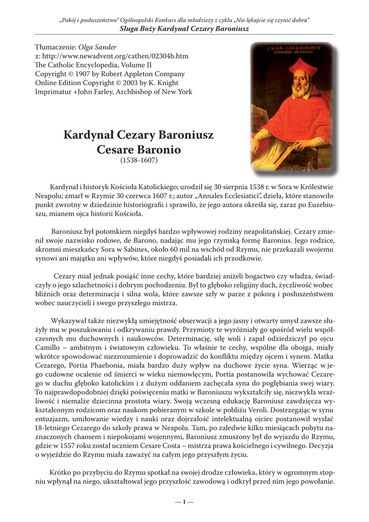 „Pokój i posłuszeństwo” Ogólnopolski Konkurs dla młodzieży z cyklu „Nie lękajcie się czynić dobra” Sługa Boży Kardynał Cezary Baroniusz Tłumaczenie: Olga Sander z: http://www.newadvent.org/cathen/02304b.htm The Catholic Encyclopedia, Volume II Copyright © 1907 by Robert Appleton Company Online Edition Copyright © 2003 by K. Knight Imprimatur +John Farley, Archbishop of New York Kardynał Cezary Baroniusz Cesare Baronio (1538-1607) Kardynał i historyk Kościoła Katolickiego; urodził się 30 sierpnia 1538 r. w Sora w Królestwie Neapolu; zmarł w Rzymie 30 czerwca 1607 r.; autor „Annales Ecclesiatici”, dzieła, które stanowiło punkt zwrotny w dziedzinie historiografii i sprawiło, że jego autora określa się, zaraz po Euzebiuszu, mianem ojca historii Kościoła. Baroniusz był potomkiem niegdyś bardzo wpływowej rodziny neapolitańskiej. Cezary zmienił swoje nazwisko rodowe, de Barono, nadając mu jego rzymską formę Baronius. Jego rodzice, skromni mieszkańcy Sora w Sabines, około 60 mil na wschód od Rzymu, nie przekazali swojemu synowi ani majątku ani wpływów, które niegdyś posiadali ich przodkowie. Cezary miał jednak posiąść inne cechy, które bardziej aniżeli bogactwo czy władza, świadczyły o jego szlachetności i dobrym pochodzeniu. Był to głęboko religijny duch, życzliwość wobec bliźnich oraz determinacja i silna wola, które zawsze szły w parze z pokorą i posłuszeństwem wobec nauczycieli i swego przyszłego mistrza. Wykazywał także niezwykłą umiejętność obserwacji a jego jasny i otwarty umysł zawsze służyły mu w poszukiwaniu i odkrywaniu prawdy. Przymioty te wyróżniały go spośród wielu współczesnych mu duchownych i naukowców. Determinację, siłę woli i zapał odziedziczył po ojcu Camillo – ambitnym i światowym człowieku. To właśnie te cechy, wspólne dla obojga, miały wkrótce spowodować niezrozumienie i doprowadzić do konfliktu między ojcem i synem. Matka Cezarego, Portia Phaebonia, miała bardzo duży wpływ na duchowe życie syna. Wierząc w jego cudowne ocalenie od śmierci w wieku niemowlęcym, Portia postanowiła wychować Cezarego w duchu głęboko katolickim i z dużym oddaniem zachęcała syna do pogłębiania swej wiary. To najprawdopodobniej dzięki poświęceniu matki w Baroniuszu wykształciły się, niezwykła wrażliwość i niemalże dziecinna prostota wiary. Swoją wczesną edukację Baroniusz zawdzięcza wykształconym rodzicom oraz naukom pobieranym w szkole w pobliżu Veroli. Dostrzegając w synu entuzjazm, umiłowanie wiedzy i nauki oraz dojrzałość intelektualną ojciec postanowił wysłać 18-letniego Cezarego do szkoły prawa w Neapolu. Tam, po zaledwie kilku miesiącach pobytu naznaczonych chaosem i niepokojami wojennymi, Baroniusz zmuszony był do wyjazdu do Rzymu, gdzie w 1557 roku został uczniem Cesare Costa – mistrza prawa kościelnego i cywilnego. Decyzja o wyjeździe do Rzymu miała zaważyć na całym jego przyszłym życiu. Krótko po przybyciu do Rzymu spotkał na swojej drodze człowieka, który w ogromnym stopniu wpłynął na niego, ukształtował jego przyszłość zawodową i odkrył przed nim jego powołanie. —1— „Pokój i posłuszeństwo” Ogólnopolski Konkurs dla młodzieży z cyklu „Nie lękajcie się czynić dobra” Sługa Boży Kardynał Cezary Baroniusz Tym człowiekiem był Filip Neri, ksiądz znany ze swojej głębokiej religijności, niezwykle silnej wiary i bezgranicznego miłosierdzia. Duchowny, który swoją postawą inspirował księży i osoby świeckie do działania na rzecz ubogich i chorych, formując ich w niewielką grupę zajmującą się pracą charytatywną w kościele w San Girolamo della Carita. Należy dostrzec wagę tego spotkania. Baroniusz, który objawił się światu jako wspaniały historyk, prawdopodobnie nigdy nie zaistniałby w tej roli gdyby nie Filip, któremu zaimponował poważny student prawa pełen prostoty i niewinnego stosunku do życia. Znajdując w nim pojętnego ucznia i zapalonego słuchacza Filip postanowił, że włączy go do stworzonej przez siebie grupy. Dla Cezarego nie oznaczało to przerwania studiów, jednak we wszystkich innych aspektach życia podporządkował się bezgranicznie woli Filipa. Poświęcenie i całkowite oddanie Filipowi spowodowało, że na znak wyrzeczenia się dotychczasowego życia i chęci postępowania zgodnie z nakazami swojego mistrza, Baroniusz spalił tomik wierszy swojego autorstwa w języku włoskim a wkrótce później podobny los spotkał jego dyplom doktorski. Przez trzy lata Cezary, w swym zapale i gorliwości, pragnął zostać zakonnikiem ale Filip odwiódł go od tego zamiaru. Coraz bardziej niepokojący dla Baroniusza stawał się gorzki żal i niezrozumienie ojca, który w dążeniach i wyborach syna dostrzegał jedynie głupotę i rozczarowanie ojcowskich ambicji wobec dziecka. Camillo obawiał się także wygaśnięcia rodu, bowiem nadzieja na jego „wspaniałe odrodzenie” pokładana była w jedynym synu. Ojciec i syn byli stanowczy i nieustępliwi. Na znak dezaprobaty dla „poczynań” syna, Camillo przestał wspomagać go finansowo, choć owa pomoc otrzymywana z domu była raczej znikoma. Od tej pory Baroniusz zmuszony był korzystać z gościnności przyjaciół Filipa. Przez 6 lat Cezary przebywał wśród wspólnoty w San Girolamo – centrum Kongregacji Oratorium. Od Filipa otrzymywał wskazówki i instrukcje w nauce oraz duchowe wsparcie i pomoc. Na jego prośbę poświęcał też cały swój wolny czas pracy dobroczynnej na rzecz chorych i ubogich. W roku 1558 Filip powierzył mu ważną funkcję wygłaszania kazań podczas często odbywających się zebrań w ciągu tygodnia w kościele w San Girolamo. W 1564 roku Baroniusz otrzymał święcenia kapłańskie i postanowił opuścić wspólnotę stworzoną przez Filipa. Jednak jego umiłowanie życia religijnego było tak silne i zakorzeniło się w nim tak głęboko, że złoży