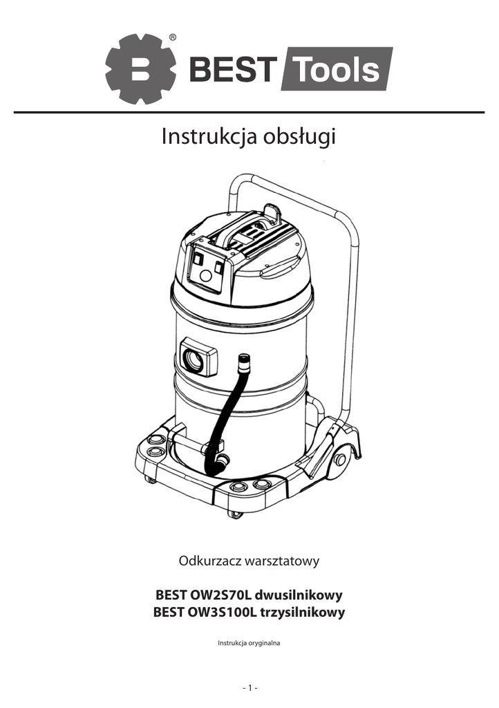 Instrukcja obsługi Odkurzacz warsztatowy BEST OW2S70L dwusilnikowy BEST OW3S100L trzysilnikowy Instrukcja oryginalna -1- Gratulujemy i dziękujemy, że zdecydowali się Państwo na zakup niniejszego produktu, dając dowód na to, że nie akceptują Państwo żadnych kompromisów: Liczy się najwyższa jakość. Poniższa instrukcja została stworzona z myślą o kompleksowym zaprezentowaniu Państwu jakości i wysokiej wydajności urządzenia. Sugerujemy uważne zapoznanie się z całą instrukcją przed rozpoczęciem użytkowania urządzenia. Oznakowanie CE znajdujące się na produkcie oznacza, że urządzenie zostało zbudowane zgodnie z europejskimi normami bezpieczeństwa. Producent zastrzega sobie prawo do wprowadzania zmian do niniejszej publikacji bez uprzedzenia w ramach ulepszania produktów. Niniejsza instrukcja nie może być powielana w całości lub w części bez zgody producenta. Spis treści 1. Schemat montażu i instalacji odkurzacza - str. 3 2. Parametry techniczne - str. 3 3. Właściwości produktu - str. 4 4. Bezpieczne użytkowanie urządzenia - str. 4 5. Instrukcja użytkowania - str. 6 6. Konserwacja - str. 8 7. Prawidłowa utylizacja produktu - str. 8 8. Dokument przedstawiający treść Deklaracji Zgodności CE - str. 9 9. Gwarancja - str. 9 -2- 1. Schemat montażu i instalacji odkurzacza OW2S70L OW3S100L zaczepy mocujące 2. Parametry techniczne Odkurzacz warsztatowy: OW2S70L BEST OW3S100L BEST Moc (W) 2x 1000 3x 1000 Układ chłodzenia Chłodzenie powietrzem Chłodzenie powietrzem Siła ssąca (kPa) 20-21 20-21 Pojemność (l) 70 100 Średnica zbiornika (mm) 420 420 Przepływ powietrza (l/s) 108 108 Napięcie znamionowe (V) 220-240 220-240 Maks. moc urządzenia podłączonego do gniazda zanikowego (W) 2000 - Długość kabla (m) 4,5 4,5 -3- 3. Właściwości produktu: 1. Odkurzacz do pracy na mokro i na sucho 2. Wyposażony w 2 silniki o mocy 1000W każdy (OW2S70L) lub 3 silniki o mocy 1000W każdy (OW3S1000L). Uruchomienie kolejnego silnika powoduje silniejsze ssanie. 3. Otwory w podstawie do łatwego osadzania w nich akcesoriów 4. Estetyczny wygląd. Nadaje się do hoteli, biur, innych miejsc użyteczności publicznej. 5. Pojemnik ze stali nierdzewnej. 6. Posiada gniazdo zanikowe. 4. Bezpieczne użytkowanie urządzenia Specjalne wskazówki dotyczące bezpieczeństwa 1. Kiedy zbiornik jest nadmiernie wypełniony wodą, a urządzenie zaczyna pracować, wówczas moc ssania zanika. Urządzenie wytwarza hałas, który wskazuje, że silnik pracuje z wysoką prędkością. W tej sytuacji należy odłączyć zasilanie i usunąć wodę za pomocą węża spustowego. Włączyć urządzenie, a zacznie ono pracować normalnie. 2. Podłączać tylko do odpowiedniego gniazda z napięcie 220-240 V, 50 Hz. 3. Jeśli przewód zasilający jest uszkodzony należy zlecić jego wymianę producentowi lub jego przedstawicielowi serwisowemu, lub też innym osobom o podobnych kwalifikacjach w celu uniknięcia zagrożenia. 4. Urządzenie to nie jest przeznaczone do użytkowania przez osoby (w tym dzieci) o ograniczonych zdolnościach fizycznych, czuciowych lub psychicznych, albo o ograniczonym doświadczeniu i wiedzy, chyba że będą one nadzorowane lub zostaną poinstruowane na temat użytkowania urządzenia przez osobę odpowiedzialną za ich bezpieczeństwo. 5. Dzieci powinny być nadzorowane, aby nie bawiły się urządzeniem. 6. Przed czyszczeniem i konserwacją urządzenia należy wyjąć wtyczkę z gniazdka. 1. Sprawdzić przed uruchomieniem, czy napięcie zasilania jest takie samo jak w opisie na etykiecie. 2. Nie używać urządzenia w środowisku wybuchowym i w pobliżu łatwopalnych materiałów, aby iskra z silnika nie stała się przyczyną pożaru. -4- 3. Nie zatykać otworu wlotowego powietrza, gdyż może to doprowadzić do przegrzania i uszkodzenia silnika. 4. Nie należy zbierać odkurzaczem przedmiotów łatwopalnych i wybuchowych, takich jak żarzące się papierosy, benzyna, itp. Nie zbierać odkurzaczem ostrych przedmiotów. 5. Nie zbierać odkurzaczem substancji, które łatwo przylegają do filtra, takich jak proszek wapienny, zaprawa i proszek grafitowy, gdyż zablokują przepływ powietrza i spowodują uszkodzenie silnika. 6. Przed konserwacją oraz po użyciu wyłączyć urządzenie i wyjąć wtyczkę za każdym razem po jego użyciu lub po naprawie. 7. Nie zostawiać odkurzacza w miejscach silnie nasłonecznionych, lub w pobliżu urządzeń emitujących duże ilości ciepła, aby uniknąć odkształceń części plastikowych. 8. Nie przemieszczać odkurzacza ciągnąć za wąż, nie deptać go, ani nie ciągnąć za niego, aby go nie uszkodzić. 9. Nie zanurzać pojemnika w wodzie, ani nie płukać go wodą, aby woda nie dostała się do elementów elektrycznych i nie spowodowała nieszczęśliwego wypadku. Należy użyć miękkiej szmatki i wykręcić ją mocno, aby pozbyć się nadmiaru wody, i dopiero wtedy lekko przetrzeć pojemnik. 10. Podczas odkurzania schodów należy stosować dodatkowe zabezpieczenie, aby odkurzacz nie spadł na skutek ruchów węża. -5- 6. Instrukcja użytkowania 1. Połączenie Włożyć złącze węża do otworu wlotowego powietrza, tak jak pokazano na rysunku i upewnić się, że jest ono dobrze umocowane. Podłączyć wybrane akcesoria, tak jak pokazuje rysunek. Akcesoria opcjonalne 2. Przed uruchomieniem urządzenia sprawdzić, czy filtr przeciwpyłowy jest na swoim miejscu. 3. Przed użyciem urządzenia na mokro należy usunąć wszystko z pojemnika, oraz wyjąć filtr przeciwpyłowy. 4. Włożyć wtyczkę do gniazdka zasilania. 5. Wcisnąć włącznik, aby urządzenie zaczęło pracować. W celu włączenia kolejnego silnika wcisnąć następny włącznik. Odkurzacz OW2S70L może pracować z włączonym jednym (1000W) lub dwoma (2 x 1000W) silnikami. Odkurzacz OW3S100L może pracować z włączonym jednym (1000W), dwoma (2 x 1000W) lub trzema (3X1000W) silnikami. -6- 6. Odkurzacz OW2S70L wyposażony jest w gniazdo zan