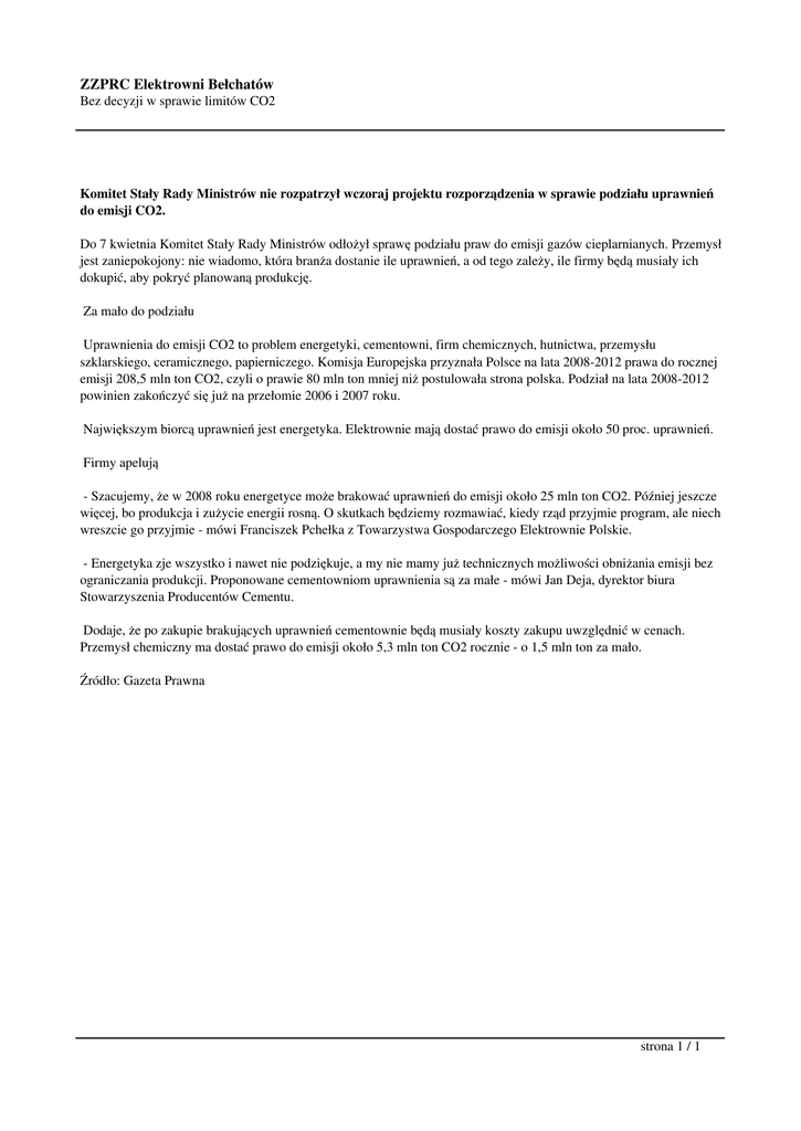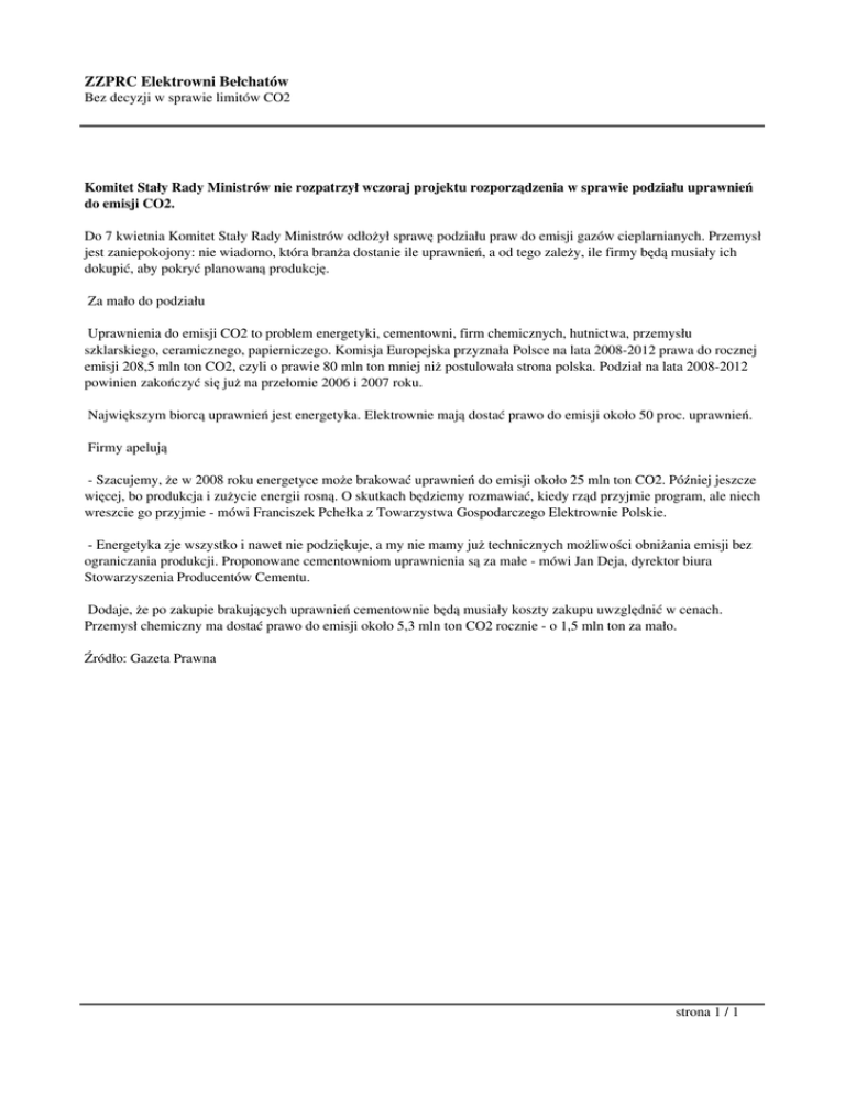 ZZPRC Elektrowni Bełchatów Bez decyzji w sprawie limitów CO2 Komitet Stały Rady Ministrów nie rozpatrzył wczoraj projektu rozporządzenia w sprawie podziału uprawnień do emisji CO2. Do 7 kwietnia Komitet Stały Rady Ministrów odłożył sprawę podziału praw do emisji gazów cieplarnianych. Przemysł jest zaniepokojony: nie wiadomo, która branża dostanie ile uprawnień, a od tego zależy, ile firmy będą musiały ich dokupić, aby pokryć planowaną produkcję. Za mało do podziału Uprawnienia do emisji CO2 to problem energetyki, cementowni, firm chemicznych, hutnictwa, przemysłu szklarskiego, ceramicznego, papierniczego. Komisja Europejska przyznała Polsce na lata 2008-2012 prawa do rocznej emisji 208,5 mln ton CO2, czyli o prawie 80 mln ton mniej niż postulowała strona polska. Podział na lata 2008-2012 powinien zakończyć się już na przełomie 2006 i 2007 roku. Największym biorcą uprawnień jest energetyka. Elektrownie mają dostać prawo do emisji około 50 proc. uprawnień. Firmy apelują - Szacujemy, że w 2008 roku energetyce może brakować uprawnień do emisji około 25 mln ton CO2. Później jeszcze więcej, bo produkcja i zużycie energii rosną. O skutkach będziemy rozmawiać, kiedy rząd przyjmie program, ale niech wreszcie go przyjmie - mówi Franciszek Pchełka z Towarzystwa Gospodarczego Elektrownie Polskie. - Energetyka zje wszystko i nawet nie podziękuje, a my nie mamy już technicznych możliwości obniżania emisji bez ograniczania produkcji. Proponowane cementowniom uprawnienia są za małe - mówi Jan Deja, dyrektor biura Stowarzyszenia Producentów Cementu. Dodaje, że po zakupie brakujących uprawnień cementownie będą musiały koszty zakupu uwzględnić w cenach. Przemysł chemiczny ma dostać prawo do emisji około 5,3 mln ton CO2 rocznie - o 1,5 mln ton za mało. Źródło: Gazeta Prawna strona 1 / 1