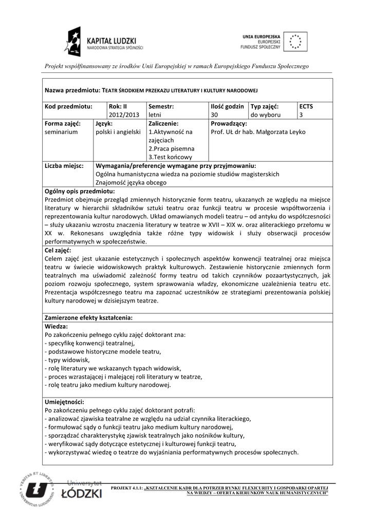 Projekt współfinansowany ze środków Unii Europejskiej w ramach Europejskiego Funduszu Społecznego Nazwa przedmiotu: TEATR ŚRODKIEM PRZEKAZU LITERATURY I KULTURY NARODOWEJ Kod przedmiotu: Rok: II 2012/2013 Forma zajęć: Język: seminarium polski i angielski Semestr: Ilość godzin Typ zajęć: ECTS letni 30 do wyboru 3 Zaliczenie: Prowadzący: 1.Aktywność na Prof. UŁ dr hab. Małgorzata Leyko zajęciach 2.Praca pisemna 3.Test końcowy Liczba miejsc: Wymagania/preferencje wymagane przy przyjmowaniu: Ogólna humanistyczna wiedza na poziomie studiów magisterskich Znajomość języka obcego Ogólny opis przedmiotu: Przedmiot obejmuje przegląd zmiennych historycznie form teatru, ukazanych ze względu na miejsce literatury w hierarchii składników sztuki teatru oraz funkcji teatru w procesie współtworzenia i reprezentowania kultur narodowych. Układ omawianych modeli teatru – od antyku do współczesności – służy ukazaniu wzrostu znaczenia literatury w teatrze w XVII – XIX w. oraz aliterackiego przełomu w XX w. Rekonesans uwzględnia także różne typy widowisk i służy obserwacji procesów performatywnych w społeczeństwie. Cel zajęć: Celem zajęć jest ukazanie estetycznych i społecznych aspektów konwencji teatralnej oraz miejsca teatru w świecie widowiskowych praktyk kulturowych. Zestawienie historycznie zmiennych form teatralnych ma uświadomić zależność formy teatru od takich czynników pozaartystycznych, jak poziom rozwoju społecznego, system sprawowania władzy, ekonomiczne uzależnienia teatru etc. Prezentacja współczesnego teatru ma zapoznać uczestników ze strategiami prezentowania polskiej kultury narodowej w dzisiejszym teatrze. Zamierzone efekty kształcenia: Wiedza: Po zakończeniu pełnego cyklu zajęć doktorant zna: -‐ specyfikę konwencji teatralnej, -‐ podstawowe historyczne modele teatru, -‐ typy widowisk, -‐ rolę literatury we wskazanych typach widowisk, -‐ proces wzrastającej i malejącej roli literatury w teatrze, -‐ rolę teatru jako medium kultury narodowej. Umiejętności: Po zakończeniu pełnego cyklu zajęć doktorant potrafi: -‐ analizować zjawiska teatralne ze względu na udział czynnika literackiego, -‐ formułować sądy o funkcji teatru jako medium kultury narodowej, -‐ sporządzać charakterystykę zjawisk teatralnych jako nośników kultury, -‐ weryfikować sądy dotyczące estetycznej i kulturowej funkcji teatru, -‐ wykorzystywać wiedzę o teatrze do wyjaśniania performatywnych procesów społecznych. PROJEKT 4.1.1: „KSZTAŁCENIE KADR DLA POTRZEB RYNKU FLEXICURITY I GOSPODARKI OPARTEJ NA WIEDZY – OFERTA KIERUNKÓW NAUK HUMANISTYCZNYCH” Projekt współfinansowany ze środków Unii Europejskiej w ramach Europejskiego Funduszu Społecznego Inne kompetencje (postawy): W wyniku przeprowadzonych zajęć student przyswoi sobie następujące postawy: -‐ aktywną postawę wobec poznawania specyfiki innych kultur, -‐ otwartość na odmienność kulturową i praktyki kulturowe innych społeczeństw, -‐ postępowanie zgodne z wymogiem tolerancji wobec innych, -‐ pozytywne postrzeganie procesów wymiany kulturowej, -‐ wrażliwość na wartości estetyczne i etyczne sztuki. Sposób sprawdzenia osiągnięcia efektów zamierzonych: 1. Praca pisemna związana z tematem seminarium 2. Pisemny tekst końcowy sprawdzający podstawową wiedzę studenta w zakresie terminologii oraz wiadomości faktograficznych zdobytych na zajęciach 3. W trakcie zajęć student będzie musiał odpowiadać na pytania, dyskutować, argumentować w formie zajęć kontaktowych w języku obcym. Szczegółowy opis przedmiotu (treści programowe): 1. „Przez ich przedstawienia poznacie ich…” Estetyczny i społeczny aspekt konwencji teatralnej. -‐ definicja konwencji teatralnej, -‐ funkcja konwencji teatralnych, -‐ konwencja teatralna jako rodzaj kodu komunikacyjnego, -‐ przykłady konwencji teatralnych. 2. Teatr w świecie widowisk. -‐ specyfika przedstawienia teatralnego, -‐ rytuał a teatr, -‐ teatr a performance społeczne, -‐ model teatru a zachowania codzienne. 3. Dramat i rytuał w antycznym teatrze greckim. -‐ rytuał jako źródło teatru antycznego, -‐ narodziny dramatu, -‐ semantyka przestrzeni teatru antycznego, -‐ konwencja teatralna w starożytnej Grecji. PROJEKT 4.1.1: „KSZTAŁCENIE KADR DLA POTRZEB RYNKU FLEXICURITY I GOSPODARKI OPARTEJ NA WIEDZY – OFERTA KIERUNKÓW NAUK HUMANISTYCZNYCH” Projekt współfinansowany ze środków Unii Europejskiej w ramach Europejskiego Funduszu Społecznego 4. Model świata w średniowiecznych widowiskach teatralnych a kultury narodowe. -‐ liturgia a ponowne narodziny teatru, -‐ uniwersalizacja teatru liturgicznego, -‐ sztywna konwencja teatru liturgicznego, -‐ teatr świecki – ucieczka od konwencji. 5. Relacje między dramatem a teatrem: hiszpański teatr „złotego wieku”. -‐ narodowe źródła teatru hiszpańskiego, -‐ dramat jako wyraz kultury narodowej, -‐ dramat hiszpański jako czynnik transferu kulturowego. 6. Relacje między dramatem a teatrem: teatr elżbietańskiej Anglii. -‐ narodowe źródła teatru angielskiego, -‐ dramat szekspirowski jako wyraz kultury narodowej, -‐ dramat szekspirowski jako czynnik transferu kulturowego. 7. Relacje między dramatem a teatrem: francuski teatr klasycystyczny. -‐ adaptacja poetyki klasycznej w warunkach monarchii absolutnej, -‐ francuski teatr klasycystyczny jako przykład kultury klasowej, -‐ normatywny charakter poetyki klasycystycznej, -‐ tragedia klasycystyczna jako przykład chybionego transferu kulturowego. 8. Teatr a kultura mieszczańska w XVIII wieku (Anglia, Francja). -‐ teatr jako miejsce identyfikacji społecznej, -‐ przezwyciężenie dualizmu gatunkowego dramatu, -‐ ponadnarodowy charakter teatru mieszczańskiego, -‐ teatr mieszczański jako przykład kultury masowej. 9. Kształtowanie niemieckiego modelu teatru narodowego w XVIII-‐XIX w