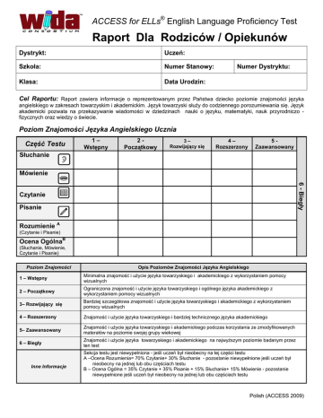ACCESS for ELLs® English Language Proficiency Test Raport Dla Rodziców / Opiekunów Dystrykt: Uczeń: Szkoła: Numer Stanowy: Klasa: Data Urodzin: Numer Dystryktu: Cel Raportu: Raport zawiera informacje o reprezentowanym przez Państwa dziecko poziomie znajomości języka angielskiego w zakresach towarzyskim i akademickim. Język towarzyski służy do codziennego porozumiewania się. Język akademicki pozwala na przekazywanie wiadomości w dziedzinach nauki o języku, matematyki, nauk przyrodniczo fizycznych oraz wiedzy o świecie. Poziom Znajomości Języka Angielskiego Ucznia Część Testu 1– Wstępny 2Początkowy 3– Rozwijający się 4– Rozszerzony 5Zaawansowany Słuchanie Mówienie 6 - Biegły Czytanie Pisanie Rozumienie A (Czytanie i Pisanie) Ocena OgólnaB (Słuchanie, Mówienie, Czytanie i Pisanie) Poziom Znajomoścl Opis Poziomów Znajomości Języka Angielskiego 1 – Wstępny Minimalna znajomość i użycie języka towarzyskiego i akademickiego z wykorzystaniem pomocy wizualnych 2 – Początkowy Ograniczona znajomość i użycie języka towarzyskiego i ogólnego języka akademickiego z wykorzystaniem pomocy wizualnych 3– Rozwijający się Bardziej szczegółowa znajomość i użycie języka towarzyskiego i akademickiego z wykorzystaniem pomocy wizualnych 4 – Rozszerzony Znajomość i użycie języka towarzyskiego i bardziej technicznego języka akademickiego 5– Zaawansowany Znajomość i użycie języka towarzyskiego i akademickiego podczas korzystania ze zmodyfikowanych materałów na poziomie swojej grupy wiekowej 6 – Biegły Znajomość i użycie języka towarzyskiego i akademickiego na najwyższym poziomie badanym przez ten test Inne Informacje Sekcja testu jest niewypełniona - jeśli uczeń był nieobecny na tej części testu A –Ocena Rozumienia= 70% Czytanie+ 30% Słuchanie - pozostanie niewypełnione jeśli uczeń był nieobecny na jednej lub obu częściach testu B – Ocena Ogólna = 35% Czytanie + 35% Pisanie + 15% Słuchanie+ 15% Mówienie - pozostanie niewypełnione jeśli uczeń był nieobecny na jednej lub obu częściach testu Polish (ACCESS 2009)