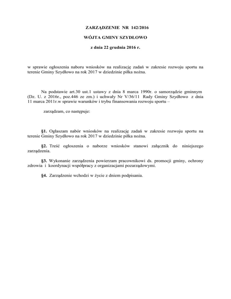 ZARZĄDZENIE NR 142/2016 WÓJTA GMINY SZYDŁOWO z dnia 22 grudnia 2016 r. w sprawie ogłoszenia naboru wniosków na realizację zadań w zakresie rozwoju sportu na terenie Gminy Szydłowo na rok 2017 w dziedzinie piłka nożna. Na podstawie art.30 ust.1 ustawy z dnia 8 marca 1990r. o samorządzie gminnym (Dz. U. z 2016r., poz.446 ze zm.) i uchwały Nr V/36/11 Rady Gminy Szydłowo z dnia 11 marca 2011r.w sprawie warunków i trybu finansowania rozwoju sportu – zarządzam, co następuje: §1. Ogłaszam nabór wniosków na realizację zadań w zakresie rozwoju sportu na terenie Gminy Szydłowo na rok 2017 w dziedzinie piłka nożna. §2. Treść ogłoszenia o naborze wniosków stanowi załącznik do zarządzenia. niniejszego §3. Wykonanie zarządzenia powierzam pracownikowi ds. promocji gminy, ochrony zdrowia i koordynacji współpracy z organizacjami pozarządowymi. §4. Zarządzenie wchodzi w życie z dniem podpisania. Załącznik do zarządzenia Nr 142/2016 Wójta Gminy Szydłowo z dnia 22 grudnia 2016 r. w sprawie ogłoszenia naboru wniosków na realizację zadań w zakresie rozwoju sportu na terenie Gminy Szydłowo na rok 2017 w dziedzinie piłka nożna. Wójt Gminy Szydłowo ogłasza nabór wniosków na realizację zadań w zakresie rozwoju sportu na terenie Gminy Szydłowo na rok 2017 w dziedzinie piłka nożna I. Nazwa zadania. Rozwój sportu na terenie gminy Szydłowo w 2017 roku w dziedzinie piłka nożna. II. Wysokość środków finansowych przeznaczonych na realizację zadania Na realizację przedsięwzięć w zakresie rozwoju sportu w 2017 roku planuje się przeznaczyć kwotę 230.000,00 zł. III. Termin realizacji zadania Termin realizacji zadania ustala się od dnia podpisania umowy do dnia 15 grudnia 2017 roku. IV. Warunki i zasady przyznawania dotacji: 1. Zasady i tryb postępowania określa uchwała Nr V/36/11 Rady Gminy Szydłowo z dnia 11 marca 2011r. w sprawie warunków i trybu finansowania rozwoju sportu. 2. Kwota przyznanej dotacji może być niższa od wnioskowanej, w takim przypadku przed zawarciem umowy wnioskodawca dokonuje korekty kosztorysu przedsięwzięcia. 3. Wójt Gminy Szydłowo może odmówić podmiotowi wyłonionemu w naborze wniosków przyznania dotacji i podpisania umowy, gdy okaże się, iż rzeczywisty zakres realizowanego zadania znacząco odbiega od opisanego we wniosku, podmiot lub jego reprezentanci utracą zdolność do czynności prawnych, zostaną ujawnione nieznane wcześniej okoliczności podważające wiarygodność merytoryczną lub finansową wnioskodawcy. 4. W przypadku rezygnacji podmiotu lub odmowy podpisania umowy przez Wójta Gminy Szydłowo z przyczyn opisanych powyżej, Wójt Gminy może zarezerwowane środki przeznaczyć na udzielenie dotacji w ramach ogłoszenia nowego naboru wniosków na realizację zadania. 5. Dotacja ze środków publicznych nie będzie przyznawana na wydatki niezwiązane bezpośrednio z realizacją zadania. 6. Za wkład własny przyjmuje się środki finansowe oraz wkład poza finansowy (np. praca wolontariuszy). 7. Dotacja może być przyznana klubowi/stowarzyszeniu sportowemu działającemu na terenie Gminy Szydłowo niezaliczanemu do sektora finansów publicznych i niedziałającemu w celu osiągnięcia zysków i realizującemu cel publiczny z zakresu sportu określony §3 ust.3 uchwały Nr V/36/11 Rady Gminy Szydłowo z dnia 11 marca 2011r.w sprawie warunków i trybu finansowania rozwoju sportu. 8. Szczegółowe warunki realizacji zadania reguluje umowa zawarta pomiędzy Gminą, a Klubem/Stowarzyszeniem. V. Termin i sposób składania wniosków: 1. Wniosek należy składać na właściwym formularzu stanowiącym załącznik nr 1 do uchwały Nr V/36/11 Rady Gminy Szydłowo z dnia 11 marca 2011r. w sprawie warunków i trybu finansowania rozwoju sportu. 2. Wniosek wraz z wymaganymi załącznikami należy złożyć w zamkniętej kopercie w nieprzekraczalnym terminie do dnia 9 stycznia 2017 r. do godz. 15.30 włącznie z adnotacją: „Nabór wniosków – Rozwój sportu na terenie gminy Szydłowo w 2017 roku w dziedzinie piłka nożna” osobiście w sekretariacie Urzędu Gminy Szydłowo, Jaraczewo 2, 64930 Szydłowo, pokój nr 8 lub za pośrednictwem poczty (decyduje data stempla pocztowego). Wnioski złożone po w/w terminie nie będą rozpatrywane. VI. Wymagane dokumenty Do wniosku należy dołączyć: 1) prawidłowo wypełniony formularz wniosku podpisany przez osoby upoważnione z postanowieniami statutu lub innego aktu są uprawnione do reprezentowania podmiotu i zaciągania w jego imieniu zobowiązań finansowych i zawierania umów. 2) kopię aktualnego odpisu z rejestru lub odpowiednio wyciąg z ewidencji lub inne dokumenty potwierdzające status prany oferenta i umocowanie osób go reprezentujących. 3) sprawozdanie merytoryczne i finansowe (bilans, rachunek wyników lub rachunek zysków i strat, informacja dodatkowa) za poprzedzający rok, w którym składany jest wniosek (nie dotyczy klubów sportowych/stowarzyszeń rozpoczynających działalność); w przypadku gdy w momencie składania wniosku wnioskodawca nie posiada sprawozdania finansowego za rok ostatni, za spełnienie tego wymogu uważa się złożenie sprawozdania za rok przedostatni wraz z oświadczeniem, że po jego sporządzeniu zostanie niezwłocznie dostarczone. 4) wszystkie kserokopie złożonych dokumentów powinny być opatrzone adnotacja „za zgodność z oryginałem”, pieczęcią oraz podpisem upoważnionych osób do reprezentowania wnioskodawcy. VII. Postanowienia końcowe Dodatkowe informacje dostępne są na stanowisku ds. promocji gminy, ochrony zdrowia i koordynacji współpracy z organizacjami pozarządowymi , Urząd Gminy Szydłowo, pokój Nr 5, telefon (0-67) 211-55-15., e-mail: [email protected] Wójt Gminy Szydłowo /-/ Dariusz Chrobak