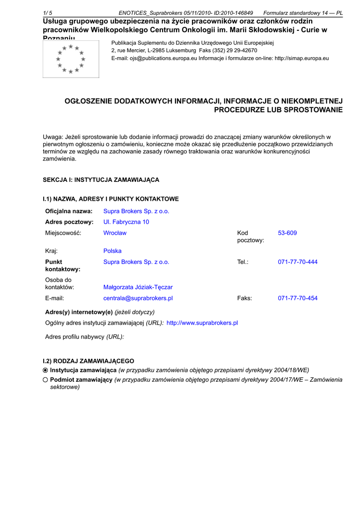 1/ 5 ENOTICES_Suprabrokers 05/11/2010- ID:2010-146849 Formularz standardowy 14 — PL Usługa grupowego ubezpieczenia na życie pracowników oraz członków rodzin pracowników Wielkopolskiego Centrum Onkologii im. Marii Skłodowskiej - Curie w Poznaniu Publikacja Suplementu do Dziennika Urzędowego Unii Europejskiej 2, rue Mercier, L-2985 Luksemburg Faks (352) 29 29-42670 E-mail: [email protected] Informacje i formularze on-line: http://simap.europa.eu OGŁOSZENIE DODATKOWYCH INFORMACJI, INFORMACJE O NIEKOMPLETNEJ PROCEDURZE LUB SPROSTOWANIE Uwaga: Jeżeli sprostowanie lub dodanie informacji prowadzi do znaczącej zmiany warunków określonych w pierwotnym ogłoszeniu o zamówieniu, konieczne może okazać się przedłużenie początkowo przewidzianych terminów ze względu na zachowanie zasady równego traktowania oraz warunków konkurencyjności zamówienia. SEKCJA I: INSTYTUCJA ZAMAWIAJĄCA I.1) NAZWA, ADRESY I PUNKTY KONTAKTOWE Oficjalna nazwa: Supra Brokers Sp. z o.o. Adres pocztowy: Ul. Fabryczna 10 Miejscowość: Wrocław Kraj: Polska Punkt kontaktowy: Supra Brokers Sp. z o.o. Osoba do kontaktów: Małgorzata Józiak-Tęczar E-mail: [email protected] Kod pocztowy: 53-609 Tel.: 071-77-70-444 Faks: 071-77-70-454 Adres(y) internetowy(e) (jeżeli dotyczy) Ogólny adres instytucji zamawiającej (URL): http://www.suprabrokers.pl Adres profilu nabywcy (URL): I.2) RODZAJ ZAMAWIAJĄCEGO Instytucja zamawiająca (w przypadku zamówienia objętego przepisami dyrektywy 2004/18/WE) Podmiot zamawiający (w przypadku zamówienia objętego przepisami dyrektywy 2004/17/WE – Zamówienia sektorowe) 2/ 5 ENOTICES_Suprabrokers 05/11/2010- ID:2010-146849 Formularz standardowy 14 — PL Usługa grupowego ubezpieczenia na życie pracowników oraz członków rodzin pracowników Wielkopolskiego Centrum Onkologii im. Marii Skłodowskiej - Curie w Poznaniu SEKCJA II: PRZEDMIOT ZAMÓWIENIA II.1) OPIS II.1.1) Nazwa nadana zamówieniu przez instytucję zamawiającą (podano w pierwotnym ogłoszeniu) Usługa grupowego ubezpieczenia na życie pracowników oraz członków rodzin pracowników Wielkopolskiego Centrum Onkologii im. Marii Skłodowskiej - Curie w Poznaniu II.1.2) Krôtki opis (podano w pierwotnym ogłoszeniu) Przedmiotem zamówienia jest ubezpieczenie grupowe na życie pracowników oraz członków rodzin pracowników Wielkopolskiego Centrum Onkologii im. Marii Skłodowskiej - Curie w Poznaniu. Przewidywana liczba osób objętych ubezpieczeniem, z uwzględnieniem członków rodzin pracowników: 850 osób (Zamawiający nie gwarantuje, że wszyscy zatrudnieni pracownicy i członkowie rodzin pracowników przystąpią do grupowego ubezpieczenia na życie.) Zamawiający przewiduje zamówienia uzupełniające. II.1.3) Wspólny Słownik Zamówień (CPV) (podano w pierwotnym ogłoszeniu) Słownik główny Główny przedmiot 66510000 Słownik uzupełniający (jeżeli dotyczy) 3/ 5 ENOTICES_Suprabrokers 05/11/2010- ID:2010-146849 Formularz standardowy 14 — PL Usługa grupowego ubezpieczenia na życie pracowników oraz członków rodzin pracowników Wielkopolskiego Centrum Onkologii im. Marii Skłodowskiej - Curie w Poznaniu SEKCJA IV: PROCEDURA IV.1) RODZAJ PROCEDURY IV.1.1) Rodzaj procedury (podano w pierwotnym ogłoszeniu) Otwarta Ograniczona Ograniczona przyspieszona Negocjacyjna Negocjacyjna przyspieszona Dialog konkurencyjny IV.2) INFORMACJE ADMINISTRACYJNE IV.2.1) Numer referencyjny nadany sprawie przez instytucję zamawiającą /podmiot zamawiający (podano w pierwotnym ogłoszeniu, o ile dotyczy) 47/07/10/2010/NU/Poznań IV.2.2) Dane referencyjne ogłoszenia w przypadku ogłoszeń przesłanych drogą elektroniczną (jeżeli są znane): Pierwotne ogłoszenie przesłane przez: SIMAP OJS eSender Login: ENOTICES_Suprabrokers Dane referencyjne ogłoszenia: 2010-133251 (rok i numer dokumentu) IV.2.3) Ogłoszenie, którego dotyczy niniejsza publikacja (jeżeli dotyczy) Numer ogłoszenia w Dz.U.: 2010/S 197-301114 z dnia 09/10/2010 IV.2.4) Data wysłania niniejszego ogłoszenia: 07/10/2010 (dd/mm/rrrr) (dd/mm/rrrr) 4/ 5 ENOTICES_Suprabrokers 05/11/2010- ID:2010-146849 Formularz standardowy 14 — PL Usługa grupowego ubezpieczenia na życie pracowników oraz członków rodzin pracowników Wielkopolskiego Centrum Onkologii im. Marii Skłodowskiej - Curie w Poznaniu SEKCJA VI: INFORMACJE UZUPEŁNIAJĄCE VI.1) OGŁOSZENIE DOTYCZY (o ile ma zastosowanie; zaznaczyć tyle punktów, ile jest to konieczne) Procedury niepełnej Sprostowania Informacji dodatkowych VI.2) INFORMACJE NA TEMAT NIEPEŁNEJ PROCEDURY UDZIELENIA ZAMÓWIENIA (o ile ma zastosowanie; zaznaczyć tyle punktów, ile jest to konieczne) Postępowanie o udzielenie zamówienia została przerwane. Postępowanie o udzielenie zamówienia uznano za nieskuteczne. Zamówienia nie udzielono. Zamówienie może być przedmiotem ponownej publikacji. Wszystkich części Jednej lub więcej części VI.3) INFORMACJE DO POPRAWIENIA LUB DODANIA (o ile dotyczy; należy określić miejsce, w którym tekst lub daty mają być zmienione lub dodane, proszę zawsze podawać odpowiedni numer sekcji i akapitu pierwotnego ogłoszenia) VI.3.1) Zmiana oryginalnej informacji lub publikacja w witrynie TED niezgodna z oryginalnymi informacjami. Zmiana oryginalnej informacji podanej przez instytucję zamawiającą Publikacja w witrynie TED niezgodna z oryginalną informacją, przekazaną przez instytucję zamawiającą W obu przypadkach VI.3.2) Ogłoszenie lub odpowiednia dokumentacja przetargowa W ogłoszeniu pierwotnym W odpowiedniej dokumentacji przetargowej (więcej informacji w odpowiedniej dokumentacji przetargowej) W obu przypadkach (więcej informacji w odpowiedniej dokumentacji przetargowej) VI.3.3) Tekst, który należy poprawić w pierwotnym ogłoszeniu (jeżeli dotyczy) Miejsce, w którym znajduje się zmieniany tekst: Zamiast: Powinno być: _____ _____ _____ VI.3.4) Daty, które należy poprawić w pierwotnym ogłoszeniu (jeżeli dotyczy) Miejsce, w którym znajdują si
