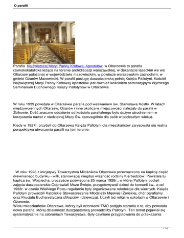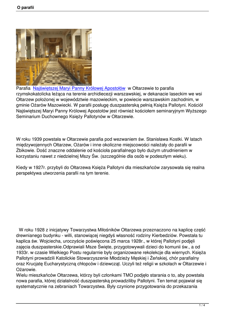 O parafii Parafia Najświętszej Maryi Panny Królowej Apostołów w Ołtarzewie to parafia rzymskokatolicka leżąca na terenie archidiecezji warszawskiej, w dekanacie laseckim we wsi Ołtarzew położonej w województwie mazowieckim, w powiecie warszawskim zachodnim, w gminie Ożarów Mazowiecki. W parafii posługę duszpasterską pełnią Księża Pallotyni. Kościół Najświętszej Maryi Panny Królowej Apostołów jest również kościołem seminaryjnym Wyższego Seminarium Duchownego Księży Pallotynów w Ołtarzewie. W roku 1939 powstała w Ołtarzewie parafia pod wezwaniem św. Stanisława Kostki. W latach międzywojennych Ołtarzew, Ożarów i inne okoliczne miejscowości należały do parafii w Żbikowie. Dość znaczne oddalenie od kościoła parafialnego było dużym utrudnieniem w korzystaniu nawet z niedzielnej Mszy Św. (szczególnie dla osób w podeszłym wieku). Kiedy w 1927r. przybyli do Ołtarzewa Księża Pallotyni dla mieszkańców zarysowała się realna perspektywa utworzenia parafii na tym terenie. W roku 1928 z inicjatywy Towarzystwa Miłośników Ołtarzewa przeznaczono na kaplicę część drewnianego budynku - willi, stanowiącej niegdyś własność rodziny Kierbedziów. Powstała tu kaplica św. Wojciecha, uroczyście poświęcona 25 marca 1928r., w której Pallotyni podjęli zajęcia duszpasterskie.Odprawiali Msze Święte, przygotowywali dzieci do komunii św., a od 1933r. w czasie Wielkiego Postu regularnie były organizowane rekolekcje dla wiernych. Księża Pallotyni prowadzili Katolickie Stowarzyszenie Młodzieży Męskiej i Żeńskiej, chór parafialny oraz Krucjatę Eucharystyczną chłopców i dziewcząt. Uczyli też religii w szkołach w Ołtarzewie i Ożarowie. Wielu mieszkańców Ołtarzewa, którzy byli członkami TMO podjęło starania o to, aby powstała nowa parafia, której działalność duszpasterską prowadziliby Pallotyni. Ten temat pojawiał się systematycznie na zebraniach Towarzystwa. Były czynione przygotowania do przekazania 1/4 O parafii Pallotynom działek pod budowę nowego kościoła. Kaplica w parku okazała się niewystarczająca dla posług miejscowej ludności - była bardzo ciasna, brakowało powietrza i prawie każdej niedzieli zdarzały się omdlenia, istniało również zagrożenie pożarowe. Niektórzy członkowie byli temu przeciwni i ten brak zgody przeciągał ostateczną decyzję. Wreszcie po długich wahaniach na zebraniu TMO 31.05.1934 roku zdecydowano przepisać Kurii Archidiecezjalnej w Warszawie 5 działek z prośbą o wybudowanie kościoła i nominowania na urząd proboszcza kapłana diecezjalnego. Na kilka tygodni przed wybuchem II wojny światowej, po zakończeniu pracy specjalnej komisji, która na polecenie kurii określiła granice parafii, dekretem arcybiskupa Stanisława Galla została erygowana parafia rzymskokatolicka z siedzibą w Ołtarzewie. Do sprawowania posług duszpasterskich przeznaczono kaplicę w parku. Uroczystość wprowadzenia pierwszego proboszcza odbyła się 13 sierpnia 1939 roku. Na tę okazję przygotowano specjalną odezwę do ludności. 8 września 1939 roku w czasie nalotu, kaplica parafialna wraz z mieszkaniem proboszcza spłonęły. Spłonęły też księgi parafialne i inne dokumenty. W czasie okupacji miejscem modlitwy i działalności duszpasterskiej stała się kaplica w Seminarium Pallotynów. Przez pewien czas funkcję kaplicy pełniło prywatne mieszkanie pani Walerii Kaczmarskiej w Ołtarzewie przy ulicy Zamoyskiego 12, potem przeniesiono kaplicę do Ożarowa na teren Huty Szkła. Już w 1940 roku ks. Proboszcz Kozłowski podejmuje starania o budowę świątyni. Próby kupienia starej drewnianej kaplicy z Rokitna nie powiodły się. We wrześniu 1945 roku na funkcję proboszcza parafii ołtarzewskiej z siedzibą w Ożarowie otrzymał nominację ks. Emilian Skrzecz. Nowy proboszcz czyni starania o pozyskanie placu pod budowę kościoła. W sierpniu 1946 roku władze kościelne otrzymały akt nadania ziemi z gospodarstwa poniemieckiego Jana Leinbrandta położonego w Ożarowie. 10 listopada 1946 roku ks. Skrzecz po raz ostatni odprawił Mszę w kaplicy przy ul Zamoyskego. Po tej Mszy procesja ruszyła do nowej kaplicy w Ożarowie. Przez kilka następnych lat istniał swoisty paradoks, parafia znajdowała się na terenie Ożarowa, a jej nazwa brzmiała: parafia pod. wezw. Św. Stanisława Kostki w Ołtarzewie, (zmienił to dopiero dekret Prymasa Polski z marca 1952 roku). Ks. Skrzecz już od wczesnych lat 60-tych starał się pozyskać do pracy duszpasterskiej Księży Pallotynów, jakby przeczuwając to, co miało nastąpić. 1 stycznia 1971 roku parafia Ożarów powróciła do "swych dawnych przyjaciół i dobrodziejów", bowiem ks. Prymas na proboszcza powołał kapłana ze Stowarzyszenia Apostolstwa Katolickiego ks. Jojczyka. Od lipca 1967 roku w Ołtarzewie przy kościele seminaryjnym została powołana do istnienia filia parafii św. Stanisława Kostki. Należały do niej: Ołtarzew Kolonia, Ołtarzew wieś, Koprki i Kaputy. Wspólnota ożarowska nie posiadała własnego cmentarza grzebalnego (zmarłych chowano na cmentarzu w Ołtarzewie). 17 kwietnia 1969 roku rozpoczęto budowę na tym cmentarzu kaplicy. Cofnijmy się do roku 1939. Wówczas to wzniesiono mury seminaryjnego kościoła zaprojektowanego przez Alfonsa Wędrychowskiego, pod którym miała się mieścić sala teatralna. Mimo zawieruchy wojennej budowę kościoła udało się zakończyć w 1948 roku. Mieści się on w głównym budynku Seminarium. 2/4 O parafii 2 męczennika Apostołów, Seminarium, dokonał maja 1948 konsekracji biskup która we wrześniu trwa Wacław kościoła. nieprzerwanie przybyli Majewski do Ołtarzewa do poświęcił dzisiaj. seminaryjny alumni 16. maja ipallotyna rozpoczęła 1953 kościół roku pod się prymas normalna wezwaniem działalność Królowej W do Glemp, -Światowej Wielki zreformowanej prymas Czwartek zawyeksponowaną Oświęcimia. Polski, 1978 Soborze poświęci