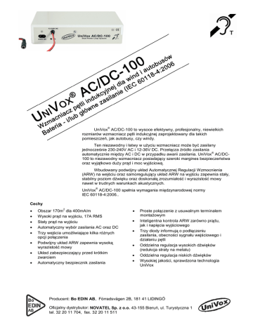 ® UniVox AC/DC-100 to wysoce efektywny, profesjonalny, niewielkich rozmiarów wzmacniacz pętli indukcyjnej zaprojektowany dla takich pomieszczeń, jak autobusy, czy windy. Ten niezawodny i łatwy w użyciu wzmacniacz może być zasilany jednocześnie 230-240V AC i 12-36V DC. Przełącza źródło zasilania ® automatycznie między AC i DC w przypadku awarii zasilania. UniVox AC/DC100 to niezawodny wzmacniacz posiadający szeroki margines bezpieczeństwa oraz wyjątkowo duży prąd i moc wyjściową. Wbudowany podwójny układ Automatycznej Regulacji Wzmocnienia (ARW) na wejściu oraz samoregulujący układ ARW na wyjściu zapewnia stały, stabilny poziom dźwięku oraz doskonałą zrozumiałość i wyrazistość mowy nawet w trudnych warunkach akustycznych. ® UniVox AC/DC-100 spełnia wymagania międzynarodowej normy IEC 60118-4:2006.. Cechy 2 Obszar 170m dla 400mA/m Wysoki prąd na wyjściu, 17A RMS Stały prąd na wyjściu Automatyczny wybór zasilania AC oraz DC Trzy wejścia umożliwiające kilka różnych opcji połączenia Podwójny układ ARW zapewnia wysoką wyrazistość mowy Układ zabezpieczający przed krótkim zwarciem Automatyczny bezpiecznik zasilania Proste połączenie z usuwalnym terminalem montażowym Inteligentna kontrola ARW zarówno prądu, jak i napięcia wyjściowego Trzy diody informują o podłączeniu zasilania, obecności sygnału wejściowego i działaniu pętli Oddzielna regulacja wysokich dźwięków (redukcja straty na metalu) Oddzielna regulacja niskich dźwięków Wysokiej jakości, sprawdzona technologia UniVox Producent: Bo EDIN AB, Förradsvägen 2B, 181 41 LIDINGÖ Oficjalny dystrybutor: NOVATEL Sp. z o.o. 43-155 Bieruń, ul. Turystyczna 1 tel. 32 20 11 704, fax. 32 20 11 511 UniVox® AC/DC-100 Specyfikacja techniczna Zasilanie: 230V AC 50Hz, 3,5-100W 12-36V DC, 3,5-100W Powierzchnia pokrycia: 170m , IEC 60118-4:2006, włączając maksymalne ustawienie 400mA/m Wyjście pętli: 2 Maksymalny prąd Maksymalne napięcie Wyjściowa ARW Charakterystyka częstotliwości Zniekształcenia Połączenie pętli 60App/1ms/1kHz, wyjście zabezpieczone przed spięciem 17A RMS/10ms/1kHz 12A RMS/125ms/1kHz 10V RMS Napięciowa i prądowa regulacja mocy. Napięcie wyjściowe jest obniżane o 10dB po 0,6-1s. Sygnały mowy nie są regulowane. 80-6000Hz (±3dB) <1% Terminal śrubowy Wejścia: Wejście 1, wejście 2, wejście 3 7mV-10V (330Ω/150kΩ terminal śrubowy) 7mV-10V/10kΩ, 7 pin złącze DIN, przeznaczone do pracy z telewizorem przez SCART. Wyposażone w napięcie zasilające phantom (12V DC/30mA) np. do pracy z przedwzmacniaczem. Podwójny układ ARW: Zakres dynamiki Czas ataku Czas powrotu >70dB 2-500ms 0,5-20dB/s Regulatory: Wysokie dźwięki Niskie dźwięki 0-+9dB, potencjometr na panelu przednim 0-+12dB, potencjometr na panelu przednim Wskaźniki optyczne: Zasilanie Sygnał wejściowy Prąd pętli Żółta dioda LED na przednim panelu Czerwona dioda LED na tylnym panelu Zielona dioda LED na tylnym panelu Pozostałe informacje: Wymiary Waga Kolor Numer katalogowy 214x142x55mm (sz. x gł. x wys.) 2 kg Jasnoszara obudowa z ciemnoszarym panelem 212020 Uwaga Układ ARW – czasy zależą od rodzaju dźwięku na wejściu. Jeśli telewizor w autobusie nie posiada wyjścia SCART – przyłóż mikrofon (numer katalogowy 242405) do głośnika telewizora. Wejście 3 nie jest wejściem mikrofonowym z powodu małej czułości. Terminal śrubowy czyni urządzenie łatwym do montażu/demontażu. Planowanie instalacji Przed instalacją upewnij się, że magnetyczny szum tła emitowany przez urządzenia elektroniczne jest mniejszy niż 20dB zgodnie z normą IEC 60118-4:2006. Instalacja w windzie – użyj 1,5mm przewodu pętli, wykonaj 4-8 zwojów na suficie windy lub na zewnątrz, na dachu dźwigu. instalacja w autobusie – zainstaluj dwa przewody 2,5mm na obwodzie autobusu na wysokości dachu. Połącz szeregowo, jako podwójne uzwojenie. Jeśli pomiary nie są satysfakcjonujące połącz przewody równolegle, jako jedno uzwojenie. Unikaj umieszczenia przewodów wejściowych w pobliżu i równolegle do przewodu pętli indukcyjnej. Prostopadłe krzyżowanie przewodów jest dozwolone. Konieczie sprawdź jakość instalacji za pomocą miernika FSM Field Strength Meter zgodnie z normą IEC 60118-4:2006. Producent: Bo EDIN AB, Förradsvägen 2B, 181 41 LIDINGÖ Oficjalny dystrybutor: NOVATEL Sp. z o.o. 43-155 Bieruń, ul. Turystyczna 1 tel. 32 20 11 704, fax. 32 20 11 511