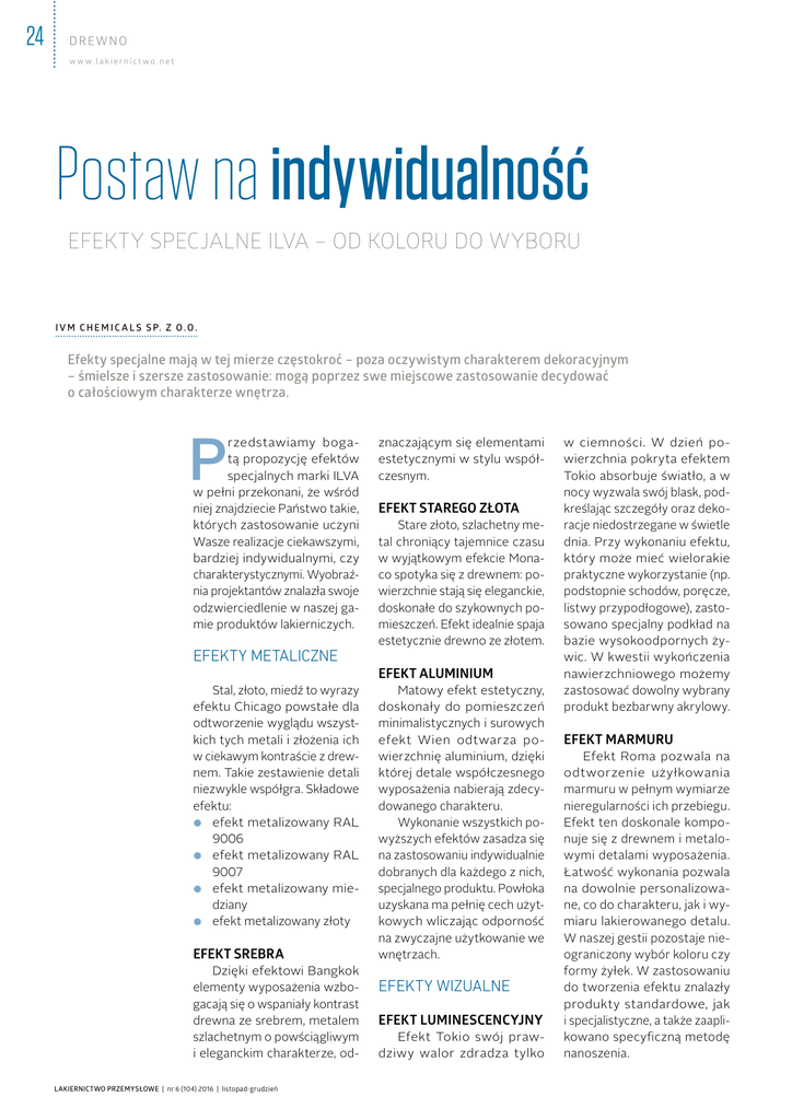 24 DREWNO w w w.lak ier nic t wo.net Postaw na indywidualność EFEKTY SPECJALNE ILVA – OD KOLORU DO WYBORU I V M C H E M I C A L S S P. Z O . O . Efekty specjalne mają w tej mierze częstokroć – poza oczywistym charakterem dekoracyjnym – śmielsze i szersze zastosowanie: mogą poprzez swe miejscowe zastosowanie decydować o całościowym charakterze wnętrza. P rzedstawiamy bogatą propozycję efektów specjalnych marki ILVA w pełni przekonani, że wśród niej znajdziecie Państwo takie, których zastosowanie uczyni Wasze realizacje ciekawszymi, bardziej indywidualnymi, czy charakterystycznymi. Wyobraźnia projektantów znalazła swoje odzwierciedlenie w naszej gamie produktów lakierniczych. EFEKTY METALICZNE Stal, złoto, miedź to wyrazy efektu Chicago powstałe dla odtworzenie wyglądu wszystkich tych metali i złożenia ich w ciekawym kontraście z drewnem. Takie zestawienie detali niezwykle współgra. Składowe efektu: ●● efekt metalizowany RAL 9006 ●● efekt metalizowany RAL 9007 ●● efekt metalizowany miedziany ●● efekt metalizowany złoty EFEKT SREBRA Dzięki efektowi Bangkok elementy wyposażenia wzbogacają się o wspaniały kontrast drewna ze srebrem, metalem szlachetnym o powściągliwym i eleganckim charakterze, odLAKIERNICTWO PRZEMYSŁOWE | nr 6 (104) 2016 | listopad-grudzień znaczającym się elementami estetycznymi w stylu współczesnym. EFEKT STAREGO ZŁOTA Stare złoto, szlachetny metal chroniący tajemnice czasu w wyjątkowym efekcie Monaco spotyka się z drewnem: powierzchnie stają się eleganckie, doskonałe do szykownych pomieszczeń. Efekt idealnie spaja estetycznie drewno ze złotem. EFEKT ALUMINIUM Matowy efekt estetyczny, doskonały do pomieszczeń minimalistycznych i surowych efekt Wien odtwarza powierzchnię aluminium, dzięki której detale współczesnego wyposażenia nabierają zdecydowanego charakteru. Wykonanie wszystkich powyższych efektów zasadza się na zastosowaniu indywidualnie dobranych dla każdego z nich, specjalnego produktu. Powłoka uzyskana ma pełnię cech użytkowych wliczając odporność na zwyczajne użytkowanie we wnętrzach. EFEKTY WIZUALNE EFEKT LUMINESCENCYJNY Efekt Tokio swój prawdziwy walor zdradza tylko w ciemności. W dzień powierzchnia pokryta efektem Tokio absorbuje światło, a w nocy wyzwala swój blask, podkreślając szczegóły oraz dekoracje niedostrzegane w świetle dnia. Przy wykonaniu efektu, który może mieć wielorakie praktyczne wykorzystanie (np. podstopnie schodów, poręcze, listwy przypodłogowe), zastosowano specjalny podkład na bazie wysokoodpornych żywic. W kwestii wykończenia nawierzchniowego możemy zastosować dowolny wybrany produkt bezbarwny akrylowy. EFEKT MARMURU Efekt Roma pozwala na odtworzenie użyłkowania marmuru w pełnym wymiarze nieregularności ich przebiegu. Efekt ten doskonale komponuje się z drewnem i metalowymi detalami wyposażenia. Łatwość wykonania pozwala na dowolnie personalizowane, co do charakteru, jak i wymiaru lakierowanego detalu. W naszej gestii pozostaje nieograniczony wybór koloru czy formy żyłek. W zastosowaniu do tworzenia efektu znalazły produkty standardowe, jak i specjalistyczne, a także zaaplikowano specyficzną metodę nanoszenia. DREWNO w w w.lak ier nic t wo.net EFEKT MASY PERŁOWEJ Dzięki efektowi Bora Bora wyglądającemu jak masa perłowa każdy element wyposażenia stanie się wyjątkowy i naturalnie świetlisty – uzyska wygląd kalejdoskopowy, pełen „oczek” sprawiających, że rezultat końcowy stanie się niezapomniany, o tradycyjnej elegancji. Opracowany specjalnie do wnętrz, podkreśla charakter powierzchni pełnych zakrzywień. Doskonale sprawdza się w pomieszczeniach, takich jak łazienki, sypialnie i salony. Łatwy i wszechstronny w użyciu. Można go uzyskać we wszystkich kolorach, zarówno matowych, jak i z połyskiem. EFEKT BARWNYCH NITEK Efekt Madrid to kolorowe nitki tworzące na powierzchni delikatne, chromatycznie kontrastujące figury lub subtelne połączenia odcieni. Absolutna dowolność regulowania nachylenia i kierunku wzoru umożliwia maksymalne spersonalizowanie końcowego efektu estetycznego. Dokładnie tak jak w przypadku deszczu – kolorowe kropelki mogą prostopadle spadać na powierzchnię, tworząc malutkie i drobne ślady lub prawie równolegle, tworząc długie i cienkie kolorowe cienie. Efekt uzyskany za pomocą zarówno produktów standardowych, produktu specjalnego, jak i specyficznej techniki aplikacyjnej. EFEKTY FAKTURY I PRZESTRZENNE EFEKT JEDWABIU Efekt Paris – czyli efekt welwetu w dotyku - to pokrycie lakierowanego materiału delikatną, jedwabistą w dotyku powłoką. Element wyposażenia nabiera dla zmysłu dotyku wyjątkowo przyjemnego wyrazu. Efekt opracowano w laboratoriach R&D IVM Chemicals bazując na innowacyjnych komponentach mineralnych i żywicznych. Powstały produkt ma zastosowanie przy wytwarzaniu innych, bardziej złożonych efektów. EFEKTY SPĘKAŃ: CRAQUELE I MOZAIKA Efekt Lisbona – oparty na nieregularnym craquele – tworzy nieregularne szczeliny o organicznym kształcie w dominującym kolorze podłoża. Całość przypomina powierzchnię powoli nadgryzaną zębem czasu. Efekt ten pozwala uzyskać skontrastowane stylizacje z nieskończoną ilością możliwości kolorystycznych wraz z regulowaniem stopnia postarzenia (można zastosować patynowanie wprowadzając dodatkową barwę). Efekty Montreal i Sevilla oparte na bardziej regularnej i geometrycznej mozaice - pozwalają na odtworzenie form kolorowych kafelków i pęknię- tego lodu, które rozkładają się na coraz to mniejsze kawałki kontrastujące z ciemnym podłożem. Jak pływający po morzu lód tworzą zatem chromatyczny kontrast i zmienne wzory, którym można nadawać dowolne wielkości i dowolny aspekt przestrzenny. Oba efekty mają charakter trójwymiarowy i tworzy się z użyciem specjalnych produktów wykorzystując niekompatybilność lakierów o różnej charakterystyce chemic