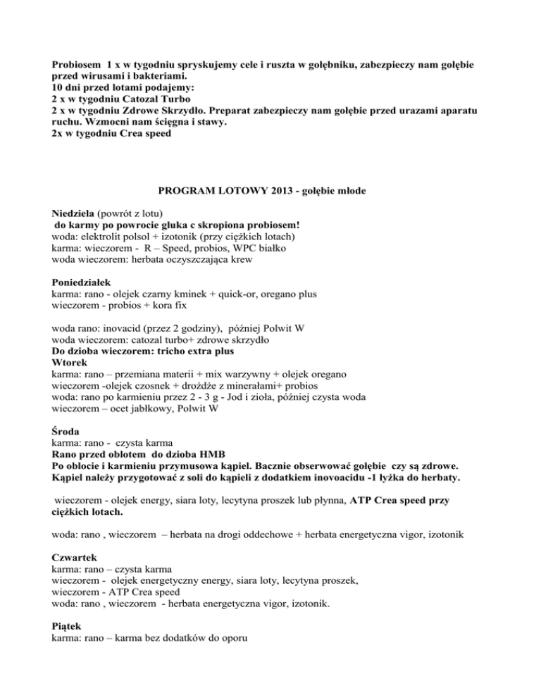 Probiosem 1 x w tygodniu spryskujemy cele i ruszta w gołębniku, zabezpieczy nam gołębie przed wirusami i bakteriami. 10 dni przed lotami podajemy: 2 x w tygodniu Catozal Turbo 2 x w tygodniu Zdrowe Skrzydło. Preparat zabezpieczy nam gołębie przed urazami aparatu ruchu. Wzmocni nam ścięgna i stawy. 2x w tygodniu Crea speed PROGRAM LOTOWY 2013 - gołębie młode Niedziela (powrót z lotu) do karmy po powrocie gluka c skropiona probiosem! woda: elektrolit polsol + izotonik (przy ciężkich lotach) karma: wieczorem - R – Speed, probios, WPC białko woda wieczorem: herbata oczyszczająca krew Poniedziałek karma: rano - olejek czarny kminek + quick-or, oregano plus wieczorem - probios + kora fix woda rano: inovacid (przez 2 godziny), później Polwit W woda wieczorem: catozal turbo+ zdrowe skrzydło Do dzioba wieczorem: tricho extra plus Wtorek karma: rano – przemiana materii + mix warzywny + olejek oregano wieczorem -olejek czosnek + drożdże z minerałami+ probios woda: rano po karmieniu przez 2 - 3 g - Jod i zioła, później czysta woda wieczorem – ocet jabłkowy, Polwit W Środa karma: rano - czysta karma Rano przed oblotem do dzioba HMB Po oblocie i karmieniu przymusowa kąpiel. Bacznie obserwować gołębie czy są zdrowe. Kąpiel należy przygotować z soli do kąpieli z dodatkiem inovoacidu -1 łyżka do herbaty. wieczorem - olejek energy, siara loty, lecytyna proszek lub płynna, ATP Crea speed przy ciężkich lotach. woda: rano , wieczorem – herbata na drogi oddechowe + herbata energetyczna vigor, izotonik Czwartek karma: rano – czysta karma wieczorem - olejek energetyczny energy, siara loty, lecytyna proszek, wieczorem - ATP Crea speed woda: rano , wieczorem - herbata energetyczna vigor, izotonik. Piątek karma: rano – karma bez dodatków do oporu wieczorem - karma bez dodatków do oporu woda: rano – Turbo Mix Ziołowy woda: wieczorem - jod I zioła wieczorem do dzioba jedna kropla HMB- w zależności od warunków lotu - przy ciężkich lotach Sobota PRZED KOSZOWANIEM : NO2 nitro podajemy tylko przy bardzo ciężkich warunkach! karma: czysta karma woda: czysta woda