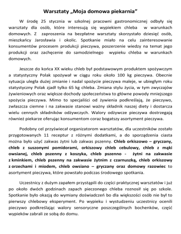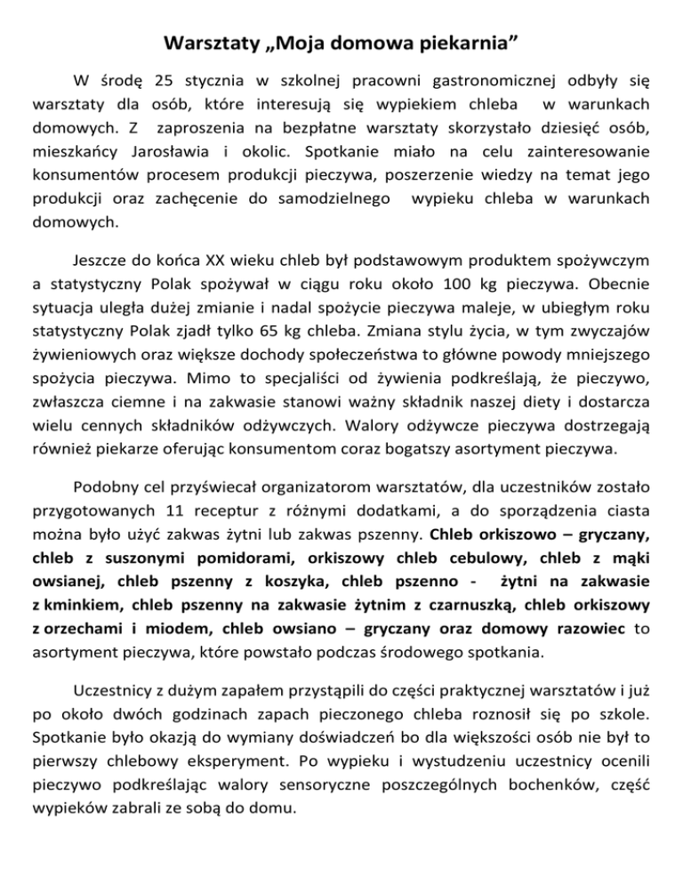Warsztaty „Moja domowa piekarnia” W środę 25 stycznia w szkolnej pracowni gastronomicznej odbyły się warsztaty dla osób, które interesują się wypiekiem chleba w warunkach domowych. Z zaproszenia na bezpłatne warsztaty skorzystało dziesięć osób, mieszkańcy Jarosławia i okolic. Spotkanie miało na celu zainteresowanie konsumentów procesem produkcji pieczywa, poszerzenie wiedzy na temat jego produkcji oraz zachęcenie do samodzielnego wypieku chleba w warunkach domowych. Jeszcze do końca XX wieku chleb był podstawowym produktem spożywczym a statystyczny Polak spożywał w ciągu roku około 100 kg pieczywa. Obecnie sytuacja uległa dużej zmianie i nadal spożycie pieczywa maleje, w ubiegłym roku statystyczny Polak zjadł tylko 65 kg chleba. Zmiana stylu życia, w tym zwyczajów żywieniowych oraz większe dochody społeczeństwa to główne powody mniejszego spożycia pieczywa. Mimo to specjaliści od żywienia podkreślają, że pieczywo, zwłaszcza ciemne i na zakwasie stanowi ważny składnik naszej diety i dostarcza wielu cennych składników odżywczych. Walory odżywcze pieczywa dostrzegają również piekarze oferując konsumentom coraz bogatszy asortyment pieczywa. Podobny cel przyświecał organizatorom warsztatów, dla uczestników zostało przygotowanych 11 receptur z różnymi dodatkami, a do sporządzenia ciasta można było użyć zakwas żytni lub zakwas pszenny. Chleb orkiszowo – gryczany, chleb z suszonymi pomidorami, orkiszowy chleb cebulowy, chleb z mąki owsianej, chleb pszenny z koszyka, chleb pszenno - żytni na zakwasie z kminkiem, chleb pszenny na zakwasie żytnim z czarnuszką, chleb orkiszowy z orzechami i miodem, chleb owsiano – gryczany oraz domowy razowiec to asortyment pieczywa, które powstało podczas środowego spotkania. Uczestnicy z dużym zapałem przystąpili do części praktycznej warsztatów i już po około dwóch godzinach zapach pieczonego chleba roznosił się po szkole. Spotkanie było okazją do wymiany doświadczeń bo dla większości osób nie był to pierwszy chlebowy eksperyment. Po wypieku i wystudzeniu uczestnicy ocenili pieczywo podkreślając walory sensoryczne poszczególnych bochenków, część wypieków zabrali ze sobą do domu. Zachęcamy wszystkich do podobnych doświadczeń w warunkach domowych i do skorzystania ze sprawdzonych receptur które zamieszczamy poniżej. Warsztaty zorganizowały Pani Wioletta Stoch i Pani Urszula Machaj a pomocą uczestnikom służyła Agnieszka Pieczonka z klasy IVż. Opracowanie: U. Machaj, W. Stoch