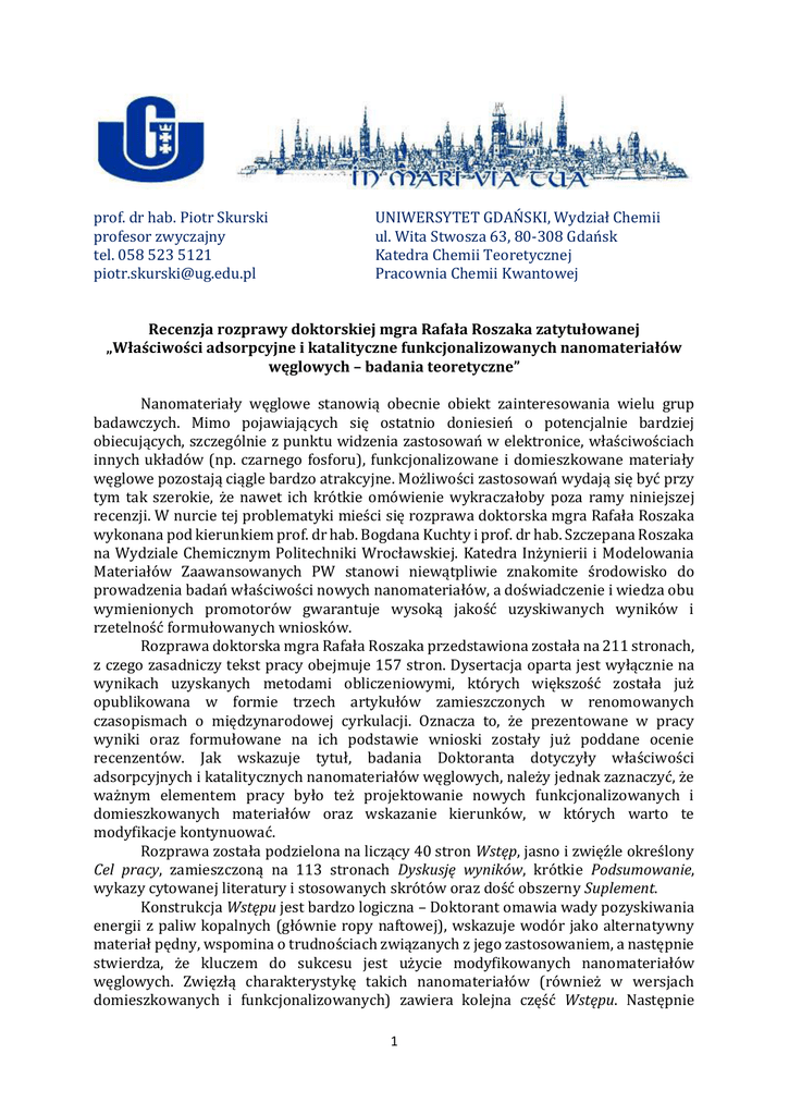 prof. dr hab. Piotr Skurski profesor zwyczajny tel. 058 523 5121 [email protected] UNIWERSYTET GDAŃSKI, Wydział Chemii ul. Wita Stwosza 63, 80-308 Gdańsk Katedra Chemii Teoretycznej Pracownia Chemii Kwantowej Recenzja rozprawy doktorskiej mgra Rafała Roszaka zatytułowanej „Właściwości adsorpcyjne i katalityczne funkcjonalizowanych nanomateriałów węglowych – badania teoretyczne” Nanomateriały węglowe stanowią obecnie obiekt zainteresowania wielu grup badawczych. Mimo pojawiających się ostatnio doniesień o potencjalnie bardziej obiecujących, szczególnie z punktu widzenia zastosowań w elektronice, właściwościach innych układów (np. czarnego fosforu), funkcjonalizowane i domieszkowane materiały węglowe pozostają ciągle bardzo atrakcyjne. Możliwości zastosowań wydają się być przy tym tak szerokie, że nawet ich krótkie omówienie wykraczałoby poza ramy niniejszej recenzji. W nurcie tej problematyki mieści się rozprawa doktorska mgra Rafała Roszaka wykonana pod kierunkiem prof. dr hab. Bogdana Kuchty i prof. dr hab. Szczepana Roszaka na Wydziale Chemicznym Politechniki Wrocławskiej. Katedra Inżynierii i Modelowania Materiałów Zaawansowanych PW stanowi niewątpliwie znakomite środowisko do prowadzenia badań właściwości nowych nanomateriałów, a doświadczenie i wiedza obu wymienionych promotorów gwarantuje wysoką jakość uzyskiwanych wyników i rzetelność formułowanych wniosków. Rozprawa doktorska mgra Rafała Roszaka przedstawiona została na 211 stronach, z czego zasadniczy tekst pracy obejmuje 157 stron. Dysertacja oparta jest wyłącznie na wynikach uzyskanych metodami obliczeniowymi, których większość została już opublikowana w formie trzech artykułów zamieszczonych w renomowanych czasopismach o międzynarodowej cyrkulacji. Oznacza to, że prezentowane w pracy wyniki oraz formułowane na ich podstawie wnioski zostały już poddane ocenie recenzentów. Jak wskazuje tytuł, badania Doktoranta dotyczyły właściwości adsorpcyjnych i katalitycznych nanomateriałów węglowych, należy jednak zaznaczyć, że ważnym elementem pracy było też projektowanie nowych funkcjonalizowanych i domieszkowanych materiałów oraz wskazanie kierunków, w których warto te modyfikacje kontynuować. Rozprawa została podzielona na liczący 40 stron Wstęp, jasno i zwięźle określony Cel pracy, zamieszczoną na 113 stronach Dyskusję wyników, krótkie Podsumowanie, wykazy cytowanej literatury i stosowanych skrótów oraz dość obszerny Suplement. Konstrukcja Wstępu jest bardzo logiczna – Doktorant omawia wady pozyskiwania energii z paliw kopalnych (głównie ropy naftowej), wskazuje wodór jako alternatywny materiał pędny, wspomina o trudnościach związanych z jego zastosowaniem, a następnie stwierdza, że kluczem do sukcesu jest użycie modyfikowanych nanomateriałów węglowych. Zwięzłą charakterystykę takich nanomateriałów (również w wersjach domieszkowanych i funkcjonalizowanych) zawiera kolejna część Wstępu. Następnie 1 Doktorant przechodzi do opisu najważniejszych stosowanych obecnie metod składowania wodoru – zarówno takich, które można by określić jako fizyczne (metoda kriogeniczna, wysokociśnieniowa), jak i chemiczne. Spośród tych drugich, Doktorant ze zrozumiałych względów wyróżnia metody składowania adsorpcyjnego oraz stosowane do tego celu materiały (węglowe, zeolitowe, polimerowe, MOF oraz COF), których użyteczność ocenia konfrontując ich właściwości (m.in. pojemność sorpcyjną) z wymaganiami amerykańskiego Departamentu Energii (DOE). Ponadto, Doktorant charakteryzuje zasadę działania ogniw paliwowych, skupiając się na zagadnieniu redukcji tlenu i efektywności wykorzystywanych do tego celu (w roli katalizatorów) domieszkowanych materiałów węglowych. Omówienie stosowanych w pracy metod badawczych Doktorant zamieścił, dość nietypowo, w końcowej części Wstępu. Autor całkowicie pomija opis metod SCF, MP2, DFT czy CC, odsyłając czytelników do podręczników chemii kwantowej, koncentruje się natomiast na charakterystyce dekompozycji energii oddziaływania oraz krótkim opisie modeli ciągłego rozpuszczalnika. Doktorant formułuje słuszne zarzuty pod adresem metod DFT, jak również zgłasza swoje ograniczone zaufanie do wyników uzyskiwanych w drugim rzędzie rachunku zaburzeń MP (w aspekcie przewidywanych wartości energii oddziaływania w słabych kompleksach). Wybór poziomu obliczeń musi jednak brać pod uwagę wielkość układu oraz możliwości dostępnych maszyn cyfrowych, dlatego Doktorant rozsądnie decyduje się na obliczanie energii oddziaływania metodą MP2 (z korektą błędu superpozycji bazy) oraz na jej dekompozycję w uproszczonym schemacie wariacyjno-perturbacyjnym. Moje zastrzeżenia związane z tą częścią pracy dotyczą braku informacji o stosowanych bazach funkcyjnych (mimo, że dwukrotnie w tym rozdziale Doktorant podkreśla ich znaczenie). W efekcie, przechodząc do dalszej lektury, czytelnik nie ma kompletnie żadnych wskazówek dotyczących tego, jakie bazy zostały wybrane i co skłoniło Doktoranta do ich wyboru. Stosowne informacje pojawiają się dopiero na początku dyskusji wyników. Cel pracy jest ambitny – jest nim zaprojektowanie nowych materiałów węglowych, użytecznych do adsorpcyjnego składowania wodoru oraz katalizowania elektrochemicznej redukcji tlenu. Celem jest zatem nie tylko interpretacja znanych zjawisk, ale zaproponowanie nowych obiektów molekularnych o zadanych właściwościach, co w mojej opinii znacząco podnosi wartość całej rozprawy. Doktorant zdaje sobie sprawę, że niefunkcjonalizowane materiały węglowe nie nadają się do realizacji tego celu, dlatego poszukiwania muszą uwzględniać struktury modyfikowane. Zgodnie z intuicją, nowe funkcjonalizowane materiały powinny wykazywać większą energię oddziaływania z wodorem, co przełoży się na większą pojemność sorpcyjną
