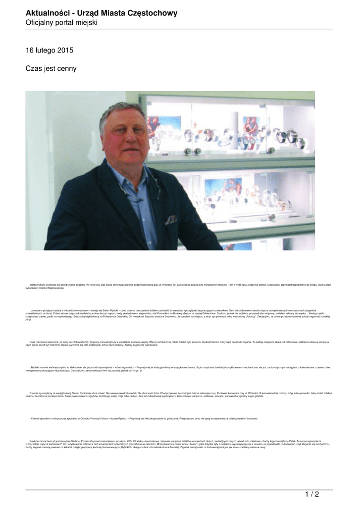 Aktualności - Urząd Miasta Częstochowy Oficjalny portal miejski 16 lutego 2015 Czas jest cenny Stefan Rybicki wychował się wśród tykania zegarów. W 1948 roku jego ojciec otworzył pracownię zegarmistrzowską przy ul. Wolności 19. Za sklepową ścianą było mieszkanie Rybickich. Tam w 1955 roku urodził się Stefan, a jego pokój przylegał bezpośrednio do sklepu. Ojciec Józef był uczniem mistrza Walarowskiego. - Ja wcale o przejęciu tradycji w młodości nie myślałem – śmieje się Stefan Rybicki. – Jako dziecko rzeczywiście lubiłem zachodzić do warsztatu i przyglądać się pracującym czeladnikom. Sam też próbowałem swoich sił przy skomplikowanych mechanizmach (zegarków przewidzianych na złom). Potem jednak przyszedł młodzieńczy okres burzy i naporu, kiedy powiedziałem: zegarmistrz, nie! Poszedłem na Budowę Maszyn na naszej Politechnice. Dyplomu jednak nie zrobiłem, przyszedł stan wojenny, zostałem zabrany do wojska… Kiedy przyszło przejmować zakład, padło na najmłodszego. Brat już był wykładowcą na Politechnice Gdańskiej. On mieszka w Sopocie, siostra w Sosnowcu. Ja zostałem na miejscu, a teraz syn prowadzi sklep internetowy „Rybiccy”. Żałuję tylko, że on nie przeszedł rzetelnej szkoły zegarmistrzowskiej, jak ja. Nasz rozmówca wspomina, że kiedy on zdobywał szlify, tej pracy manualnej było w warsztacie znacznie więcej. Więcej na tokarni się robiło, trzeba było samemu dorabiać bardzo precyzyjne części do zegarka. Tu padają magiczne słowa: oś balansowa, układanie włosa w spiralę (w czym ojciec Józefi był mistrzem). Dzisiaj wymienia się całe podzespoły. Choć stare Delbany, Tissoty są jeszcze naprawiane. - Był taki moment wahnięcia rynku ku elektronice, ale przychodzi opamiętanie – mówi zegarmistrz. - Przynajmniej te tradycyjne firmy wracają ku mechanice. Są to urządzenia bardziej skomplikowane – mechaniczne, ale już z automatycznym naciągiem, z kalendarzem, czasem z tzw. inteligentnym pokazującym fazy księżyca. Cena takich z renomowanych firm zaczyna się gdzieś od 10 tys. zł. O cenie egzemplarzy ze swojej kolekcji Stefan Rybicki nie chce mówić. Nie nazwie nawet ich modeli. Nie chce kusić licha. Choć przyznaje, że zbiór jest dobrze zabezpieczony. Ponieważ kamienica przy ul. Wolności 19 jest własnością rodziny, mógł sobie pozwolić, żeby oddać kolekcji osobne, bezpieczne pomieszczenie. Takie małe muzeum zegarków, do którego wstęp maja tylko zaufani. Jest tam kilkadziesiąt egzemplarzy: kieszonkowe, naręczne, szafkowe, wiszące, jest nawet oryginalny zegar gdański. - Chętnie opowiem o nich podczas spotkania w Ośrodku Promocji Kultury – dodaje Rybicki. – Przyniosę też kilka eksponatów do pokazania. Przepraszam, że to nie będą te najcenniejsze kolekcjonersko i finansowo. Kolekcje zaczął tworzyć jeszcze ojciec Stefana. Przekazał synowi czasomierze z przełomu XIX i XX wieku – kieszonkowe i pierwsze naręczne. Niektóre w kopertach złotych i podwójnych złotych, wśród nich unikatowe, choćby legendarnej firmy Patek. Te cenne egzemplarze rzeczywiście „były na kamieniach”, tzn. łożyskowanie robiono w nich w kamieniach szlachetnych (początkowo w rubinach). Mniej staranne i cenne to tzw. „buksy”, gdzie łożyska były z mosiądzu, wycierającego się z czasem, co powodowało „buksowanie”, czyli ślizganie się mechanizmu. Każdy zegarek zresztą powinien co kilka lat przejść gruntowną kontrolę i konserwację (u „Rybickich” dbają o to brat i chrześniak Artura Barcisia). Zegarek dobrej marki i z limitowanej serii jest jak wino – zadbany rośnie w cenę. 1/2 Aktualności - Urząd Miasta Częstochowy Oficjalny portal miejski - Wraca moda na zegarki mechaniczne, szczególnie męskie – podkreśla Stefan Rybicki. - Bo zegarek to męska biżuteria. Poznając biznesmena czy polityka, trzeba mu patrzeć na przegub ręki, pod mankiet. Ktoś, kto zarabia swoje, np. minister, wręcz powinien mieć dobry zegarek. I to nie jeden. Dlatego mam niechętny stosunek do afery zegarkowej. Pan minister, moim zdaniem, miał prawo sądzić, że nowy zegarek to tylko elegancki drobiazg i mógł zapomnieć o nim w zeznaniu. Tadeusz Piersiak 16 lutego Z cyklu „Kolekcjonerskie rarytasy” Spotkanie ze Stefanem Rybickim - godz. 18 Miejsce: OPK Gaude Mater, ul. Dąbrowskiego 1 Pozostałe aktualności 2/2 Powered by TCPDF (www.tcpdf.org)