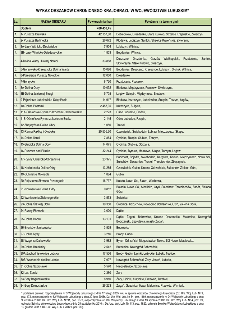 WYKAZ OBSZARÓW CHRONIONEGO KRAJOBRAZU W WOJEWÓDZTWIE LUBUSKIM* Lp. NAZWA OBSZARU Ogółem Powierzchnia (ha) Położenie na terenie gmin 438.453,45 1. 1- Puszcza Drawska 2. 2- Puszcza Barlinecka 3. 3A-Lasy Witnicko-Dębieńskie 7.904 Lubiszyn, Witnica, 4. 3B- Lasy Witnicko-Dzieduszyckie 1.803 Bogdaniec, Witnica, 5. 4-Dolina Warty i Dolnej Noteci 33.888 Deszczno, Drezdenko, Gorzów Wielkopolski, Skwierzyna, Stare Kurowo, Zwierzyn, 6. 5-Gorzowsko-Krzeszycka Dolina Warty 15.086 Bogdaniec, Deszczno, Krzeszyce, Lubiszyn, Słońsk, Witnica, 7. 6-Pojezierze Puszczy Noteckiej 12.000 Drezdenko 8. 7-Gorzycko 9. 8A-Dolina Obry 10. 8B-Dolina Jeziornej Strugi 11. 9-Pojezierze Lubniewicko-Sulęcińskie 12. 10-Dolina Postomii 42.157,80 26.672 8.720 10.092 5.708 14.917 2.457,35 Dobiegniew, Drezdenko, Stare Kurowo, Strzelce Krajeńskie, Zwierzyn Kłodawa, Lubiszyn, Santok, Strzelce Krajeńskie, Zwierzyn, Bledzew, Międzyrzecz, Pszczew, Skwierzyna, Łagów, Sulęcin, Międzyrzecz, Bledzew, Bledzew, Krzeszyce, Lubniewice, Sulęcin, Torzym, Łagów, Krzeszyce, Sulęcin, 2.223 Ośno Lubuskie, Słońsk, 14. 11B-Ośnieńska Rynna z Jeziorem Busko 2.145 Ośno Lubuskie, Rzepin, 15. 12-Zbąszyńska Dolina Obry 1.050 Trzciel 16. 13-Rynna Paklicy i Ołoboku 20.505,30 7.864 Santok, Przytoczna, Pszczew, 13. 11A-Ośniańska Rynna z Jeziorem Radachowskim 17. 14-Dolina Ilanki Przytoczna, Czerwieńsk, Świebodzin, Lubrza, Międzyrzecz, Skąpe, Cybinka, Rzepin, Słubice, Torzym, 18. 15-Słubicka Dolina Odry 14.075 Cybinka, Słubice, Górzyca, 19. 16-Puszcza nad Pliszką 32.244 Cybinka, Bytnica, Maszewo, Skąpe, Torzym, Łagów, 20. 17-Rynny Obrzycko-Obrzańskie 23.375 Babimost, Bojadła, Świebodzin, Kargowa, Kolsko, Międzyrzecz, Nowa Sól, Sulechów, Szczaniec, Trzciel, Trzebiechów, Zbąszynek, 21. 18-Krośnieńska Dolina Odry 13.265 Czerwieńsk, Gubin, Krosno Odrzańskie, Sulechów, Zielona Góra, 22. 19-Gubińskie Mokradła 23. 20-Pojezierze Sławsko-Przemęckie 1.884 16.737 Gubin Kolsko, Nowa Sól, Sława, Wschowa, 24. 21-Nowosolska Dolina Odry 9.852 Bojadła, Nowa Sól, Siedlisko, Otyń, Sulechów, Trzebiechów, Zabór, Zielona Góra, 25. 22-Wzniesienia Zielonogórskie 3.573 Świdnica 26. 23-Dolina Śląskiej Ochli 27. 24-Rynny Pławskie 28. 25-Dolina Bobru 10.350 3.000 13.131 Świdnica, Kożuchów, Nowogród Bobrzański, Otyń, Zielona Góra, Dąbie Dąbie, Żagań, Bobrowice, Krosno Odrzańskie, Małomice, Nowogród Bobrzański, Szprotawa, miasto Żagań, 29. 26-Bronków-Janiszowice 3.529 Bobrowice 30. 27-Dolina Nysy 3.216 Brody, Gubin, 31. 28-Wzgórza Dalkowskie 3.982 Bytom Odrzański, Niegosławice, Nowa, Sól Nowe, Miasteczko, 32. 29-Dolina Brzeźnicy 2.542 Brzeźnica, Nowogród Bobrzański, 33. 30A-Zachodnie okolice Lubska 17.536 34. 30B-Wschodnie okolice Lubska 7.907 Nowogród Bobrzański, Żary, Jasień, Lubsko, 35. 31-Dolina Szprotawki 5.570 Niegosławice, Szprotawa, 36. 32-Las Żarski 2.360 Żary 37. 33-Bory Bogumiłowskie 8.910 Żary, Lipinki, Łużyckie, Przewóz, Trzebiel, 38. 34-Bory Dolnośląskie 26.223 Brody, Gubin, Lipinki, Łużyckie, Lubski, Tuplice, Żagań, Gozdnica, Iłowa, Małomice, Przewóz, Wymiarki, * podstawa prawna: rozporządzenia Nr 3 Wojewody Lubuskiego z dnia 17 lutego 2005 roku w sprawie obszarów chronionego krajobrazu (Dz. Urz. Woj. Lub. Nr 9, poz. 172, rozporządzenie nr 52 Wojewody Lubuskiego z dnia 20 lipca 2006r. Dz. Urz. Woj. Lub. Nr 54, poz. 1189, rozporządzenie nr 24 Wojewody Lubuskiego z dnia 9 września 2008r. Dz. Urz. Woj. Lub. Nr 91, poz. 1373, rozporządzenie nr 1/09 Wojewody Lubuskiego z dnia 13 stycznia 2009r. Dz. Urz. Woj. Lub. Nr 4, poz. 99, uchwała Sejmiku Województwa Lubuskiego z dnia 25 października 2010 r. Dz. Urz. Woj. Lub. Nr 113, poz. 1820, uchwała Sejmiku Województwa Lubuskiego z dnia 19 grudnia 2011 r. Dz. Urz. Woj. Lub. z 2012 r. poz. 98 ).