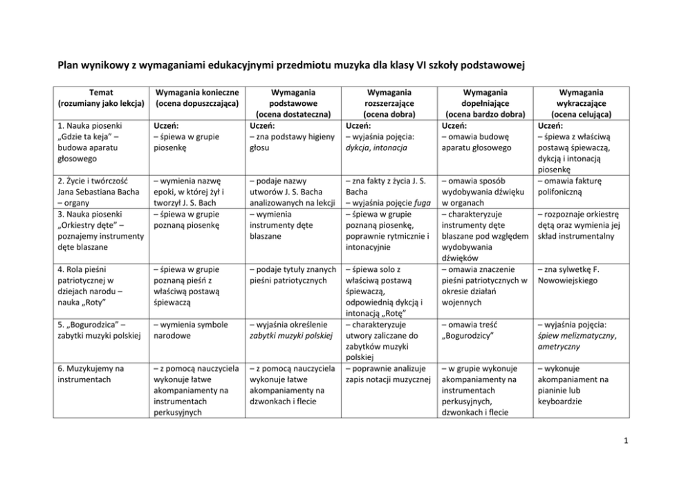 Plan wynikowy z wymaganiami edukacyjnymi przedmiotu muzyka