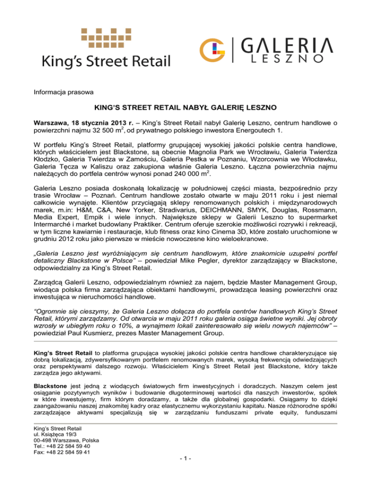 Informacja prasowa KING’S STREET RETAIL NABYŁ GALERIĘ LESZNO Warszawa, 18 stycznia 2013 r. – King’s Street Retail nabył Galerię Leszno, centrum handlowe o powierzchni najmu 32 500 m2, od prywatnego polskiego inwestora Energoutech 1. W portfelu King’s Street Retail, platformy grupującej wysokiej jakości polskie centra handlowe, których właścicielem jest Blackstone, są obecnie Magnolia Park we Wrocławiu, Galeria Twierdza Kłodzko, Galeria Twierdza w Zamościu, Galeria Pestka w Poznaniu, Wzorcownia we Włocławku, Galeria Tęcza w Kaliszu oraz zakupiona właśnie Galeria Leszno. Łączna powierzchnia najmu należących do portfela centrów wynosi ponad 240 000 m2. Galeria Leszno posiada doskonałą lokalizację w południowej części miasta, bezpośrednio przy trasie Wrocław – Poznań. Centrum handlowe zostało otwarte w maju 2011 roku i jest niemal całkowicie wynajęte. Klientów przyciągają sklepy renomowanych polskich i międzynarodowych marek, m.in: H&M, C&A, New Yorker, Stradivarius, DEICHMANN, SMYK, Douglas, Rossmann, Media Expert, Empik i wiele innych. Największe sklepy w Galerii Leszno to supermarket Intermarché i market budowlany Praktiker. Centrum oferuje szerokie możliwości rozrywki i rekreacji, w tym liczne kawiarnie i restauracje, klub fitness oraz kino Cinema 3D, które zostało uruchomione w grudniu 2012 roku jako pierwsze w mieście nowoczesne kino wieloekranowe. „Galeria Leszno jest wyróżniającym się centrum handlowym, które znakomicie uzupełni portfel detaliczny Blackstone w Polsce” – powiedział Mike Pegler, dyrektor zarządzający w Blackstone, odpowiedzialny za King’s Street Retail. Zarządcą Galerii Leszno, odpowiedzialnym również za najem, będzie Master Management Group, wiodąca polska firma zarządzająca obiektami handlowymi, prowadząca leasing powierzchni oraz inwestująca w nieruchomości handlowe. “Ogromnie się cieszymy, że Galeria Leszno dołącza do portfela centrów handlowych King’s Street Retail, którymi zarządzamy. Od otwarcia w maju 2011 roku galeria osiąga świetne wyniki. Jej obroty wzrosły w ubiegłym roku o 10%, a wynajmem lokali zainteresowało się wielu nowych najemców” – powiedział Paul Kusmierz, prezes Master Management Group. King’s Street Retail to platforma grupująca wysokiej jakości polskie centra handlowe charakteryzujące się dobrą lokalizacją, zdywersyfikowanym portfelem renomowanych marek, wysoką frekwencją odwiedzających oraz perspektywami dalszego rozwoju. Właścicielem King’s Street Retail jest Blackstone, który także zarządza jego aktywami. Blackstone jest jedną z wiodących światowych firm inwestycyjnych i doradczych. Naszym celem jest osiąganie pozytywnych wyników i budowanie długoterminowej wartości dla naszych inwestorów, spółek w które inwestujemy, firm którym doradzamy, a także dla globalnej gospodarki. Osiągamy to dzięki zaangażowaniu naszej znakomitej kadry oraz elastycznemu wykorzystaniu kapitału. Nasze różnorodne spółki zarządzające aktywami specjalizują się w zarządzaniu funduszami private equity, funduszami King’s Street Retail ul. Książęca 19/3 00-498 Warszawa, Polska Tel.: +48 22 584 59 40 Fax: +48 22 584 59 41 -1- nieruchomościowymi, hedgingowymi, funduszami sekurytyzacyjnymi oraz zamkniętymi funduszami inwestycyjnymi. Blackstone zapewnia też różnorodne usługi doradcze, w tym doradztwo finansowe, strategiczne, restrukturyzacyjne i reorganizacyjne, a także usługi w zakresie alokacji funduszy. Więcej informacji można znaleźć na www.blackstone.com. Śledź nas na twitter @blackstone. Master Management Group jest wiodącą polską firmą zarządzającą i inwestującą w nieruchomości 2 handlowe, która obecnie zarządza łącznie ponad 370 000 m powierzchni handlowej. Firma posiada ugruntowane relacje z wiodącymi międzynarodowymi najemcami, a jej działania koncentrują się na zapewnianiu klientom jak najlepszych doświadczeń podczas zakupów. Więcej informacji można znaleźć na www.mmgm.pl. Dodatkowych informacji udziela: Questia sp. z o.o. sp. k. Communications Management Consultants Aleksandra Kwiatkowska, [email protected], telefon: +48 22 623 07 00 Marta Miller, [email protected], telefon: +48 22 623 07 00 King’s Street Retail ul. Książęca 19/3 00-498 Warszawa, Polska Tel.: +48 22 584 59 40 Fax: +48 22 584 59 41 -2-