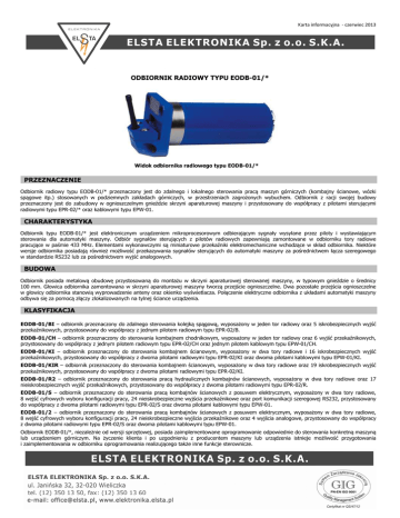 Karta informacyjna - czerwiec 2013 ODBIORNIK RADIOWY TYPU EODB-01/* Widok odbiornika radiowego typu EODB-01/* PRZEZNACZENIE Odbiornik radiowy typu EODB-01/* przeznaczony jest do zdalnego i lokalnego sterowania pracą maszyn górniczych (kombajny ścianowe, wózki spągowe itp.) stosowanych w podziemnych zakładach górniczych, w przestrzeniach zagrożonych wybuchem. Odbiornik z racji swojej budowy przeznaczony jest do zabudowy w ognioszczelnym gnieździe skrzyni aparaturowej maszyny i przystosowany do współpracy z pilotami sterującymi radiowymi typu EPR-02/* oraz kablowymi typu EPW-01. CHARAKTERYSTYKA Odbiornik typu EODB-01/* jest elektronicznym urządzeniem mikroprocesorowym odbierającym sygnały wysyłane przez piloty i wystawiającym sterowania dla automatyki maszyny. Odbiór sygnałów sterujących z pilotów radiowych zapewniają zamontowane w odbiorniku tory radiowe pracujące w paśmie 433 MHz. Elementami wykonawczymi są miniaturowe przekaźniki elektromechaniczne wchodzące w skład odbiornika. Niektóre wersje odbiornika posiadają również możliwość przekazywania sygnałów sterujących do automatyki maszyny za pośrednictwem łącza szeregowego w standardzie RS232 lub za pośrednictwem wyjść analogowych. BUDOWA Odbiornik posiada metalową obudowę przystosowaną do montażu w skrzyni aparaturowej sterowanej maszyny, w typowym gnieździe o średnicy 100 mm. Głowica odbiornika zamontowana w skrzyni aparaturowej maszyny tworzą przejście ognioszczelne. Dwa pozostałe przejścia ognioszczelne w głowicy odbiornika stanowią wyprowadzenie anteny oraz okienko wyświetlacza. Połączenie elektryczne odbiornika z układami automatyki maszyny odbywa się za pomocą złączy zlokalizowanych na tylnej ściance urządzenia. KLASYFIKACJA EODB-01/BI – odbiornik przeznaczony do zdalnego sterowania kolejką spągową, wyposażony w jeden tor radiowy oraz 5 iskrobezpiecznych wyjść przekaźnikowych, przystosowany do współpracy z jednym pilotem radiowym typu EPR-02/B. EODB-01/CH – odbiornik przeznaczony do sterowania kombajnem chodnikowym, wyposażony w jeden tor radiowy oraz 6 wyjść przekaźnikowych, przystosowany do współpracy z jednym pilotem radiowym typu EPR-02/CH oraz jednym pilotem kablowym typu EPW-01/CH. EODB-01/KI – odbiornik przeznaczony do sterowania kombajnem ścianowym, wyposażony w dwa tory radiowe i 16 iskrobezpiecznych wyjść przekaźnikowych, przystosowany do współpracy z dwoma pilotami radiowymi typu EPR-02/KI oraz dwoma pilotami kablowymi typu EPW-01/KI. EODB-01/KIR – odbiornik przeznaczony do sterowania kombajnem ścianowym, wyposażony w dwa tory radiowe oraz 19 iskrobezpiecznych wyjść przekaźnikowych, przystosowany do współpracy z dwoma pilotami radiowymi typu EPR-02/KI. EODB-01/R2 – odbiornik przeznaczony do sterowania pracą hydraulicznych kombajnów ścianowych, wyposażony w dwa tory radiowe oraz 17 nieiskrobezpiecznych wyjść przekaźnikowych, przystosowany do współpracy z dwoma pilotami radiowymi typu EPR-02/R. EODB-01/S – odbiornik przeznaczony do sterowania pracą kombajnów ścianowych z posuwem elektrycznym, wyposażony w dwa tory radiowe, 8 wejść cyfrowych wyboru konfiguracji pracy, 24 nieiskrobezpieczne wyjścia przekaźnikowe oraz port komunikacji szeregowej RS232, przystosowany do współpracy z dwoma pilotami radiowymi typu EPR-02/S oraz dwoma pilotami kablowymi typu EPW-01. EODB-01/2 – odbiornik przeznaczony do sterowania pracą kombajnów ścianowych z posuwem elektrycznym, wyposażony w dwa tory radiowe, 8 wejść cyfrowych wyboru konfiguracji pracy, 24 nieiskrobezpieczne wyjścia przekaźnikowe oraz 4 wyjścia analogowe, przystosowany do współpracy z dwoma pilotami radiowymi typu EPR-02/S oraz dwoma pilotami kablowymi typu EPW-01. Odbiornik EODB-01/*, niezależnie od wersji sprzętowej, posiada zaimplementowane oprogramowanie odpowiednie do sterowania konkretną maszyną lub urządzeniem górniczym. Na życzenie klienta i po uzgodnieniu z producentem maszyny lub urządzenia istnieje możliwość przygotowania i zaimplementowania w odbiorniku oprogramowania realizującego także inne funkcje sterownicze. Karta informacyjna - czerwiec 2013 PODSTAWOWE DANE TECHNICZNE 24 V AC/DC + 10% - 15% 1. Napięcie zasilania Un 2. Maksymalne napięcie wejściowe Um 3. Pobór mocy 30 V ok. 3,5W bez cewek przekaźników 4. Ilość przekaźnikowych wyjść sterujących 5. Parametry iskrobezpiecznego obwodu antenowego Maksymalne napięcie wyjściowe Uo Maksymalny prąd wyjściowy Io Maksymalna indukcyjność zewnętrzna Lo Maksymalna pojemność zewnętrzna Co max. 24 9,1 V 0,1 A 15 mH 22 µF 6. Zasięg sterowania radiowego min. 15 m 7. Transmisja danych szeregowa 8. Tryb transmisji simplex 9. Modulacja FM-FSK 10. Stopień ochrony obudowy IP 54 11. Temperatura otoczenia podczas pracy 12. Masa 0 ÷ +60°C ok. 6,0 kg 13. Grupa, kategoria, rodzaj budowy przeciwwybuchowej I M2 Ex d [ib] I Mb CERTYFIKATY – – – – KDB 04ATEX094U z dnia 27.08.2004 wydany przez Główny Instytut Górnictwa (Nr 1453). KDB 04ATEX094U/1 z dnia 16.01.2007 wydany przez Główny Instytut Górnictwa (Nr 1453). KDB 04ATEX094U/2 z dnia 08.10.2007 wydany przez Główny Instytut Górnictwa (Nr 1453). KDB 04ATEX094U UZUPEŁNIENIE NR 3 wydany przez Główny Instytut Górnictwa (Nr 1453). ODBIORNIK RADIOWY TYPU EODB-01/* – rysunek katalogowy GWARANCJA I SERWIS Zapewniamy kompleksową obsługę w ramach świadczenia usług gwarancyjnych i pogwarancyjnych urządzeń naszej produkcji. Usługi te realizowane są wyłącznie przez producenta lub autoryzowany punkt serwisowy. W sprawie dodatkowych informacji prosimy kontaktować się z producentem.