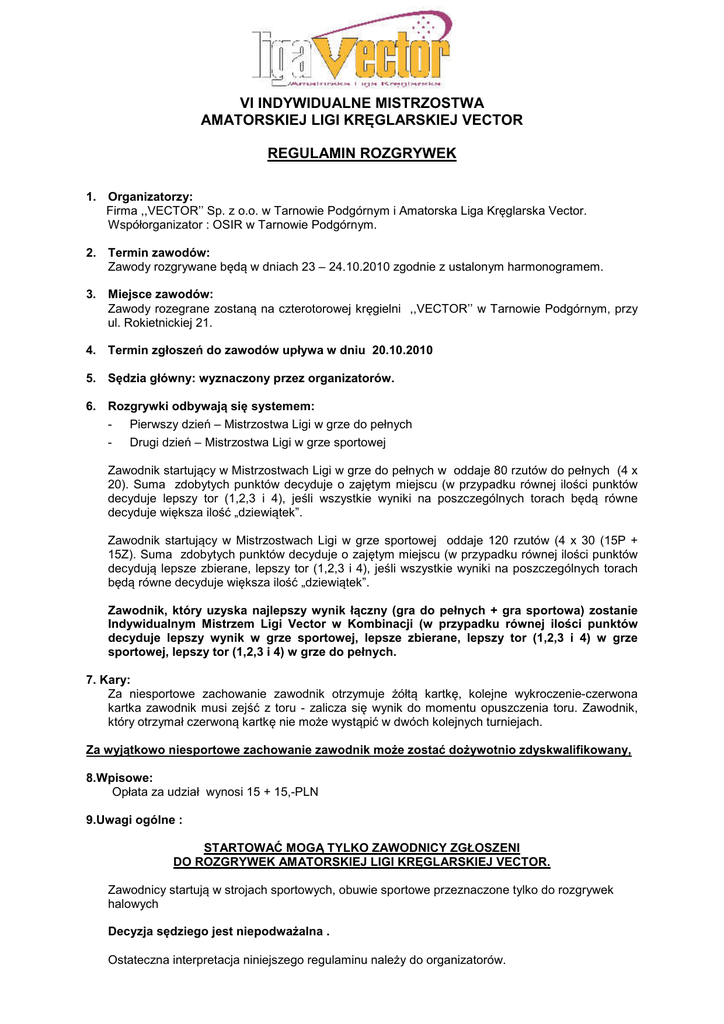 VI INDYWIDUALNE MISTRZOSTWA AMATORSKIEJ LIGI KRĘGLARSKIEJ VECTOR REGULAMIN ROZGRYWEK 1. Organizatorzy: Firma ,,VECTOR’’ Sp. z o.o. w Tarnowie Podgórnym i Amatorska Liga Kręglarska Vector. Współorganizator : OSIR w Tarnowie Podgórnym. 2. Termin zawodów: Zawody rozgrywane będą w dniach 23 – 24.10.2010 zgodnie z ustalonym harmonogramem. 3. Miejsce zawodów: Zawody rozegrane zostaną na czterotorowej kręgielni ,,VECTOR’’ w Tarnowie Podgórnym, przy ul. Rokietnickiej 21. 4. Termin zgłoszeń do zawodów upływa w dniu 20.10.2010 5. Sędzia główny: wyznaczony przez organizatorów. 6. Rozgrywki odbywają się systemem: - Pierwszy dzień – Mistrzostwa Ligi w grze do pełnych Drugi dzień – Mistrzostwa Ligi w grze sportowej Zawodnik startujący w Mistrzostwach Ligi w grze do pełnych w oddaje 80 rzutów do pełnych (4 x 20). Suma zdobytych punktów decyduje o zajętym miejscu (w przypadku równej ilości punktów decyduje lepszy tor (1,2,3 i 4), jeśli wszystkie wyniki na poszczególnych torach będą równe decyduje większa ilość „dziewiątek”. Zawodnik startujący w Mistrzostwach Ligi w grze sportowej oddaje 120 rzutów (4 x 30 (15P + 15Z). Suma zdobytych punktów decyduje o zajętym miejscu (w przypadku równej ilości punktów decydują lepsze zbierane, lepszy tor (1,2,3 i 4), jeśli wszystkie wyniki na poszczególnych torach będą równe decyduje większa ilość „dziewiątek”. Zawodnik, który uzyska najlepszy wynik łączny (gra do pełnych + gra sportowa) zostanie Indywidualnym Mistrzem Ligi Vector w Kombinacji (w przypadku równej ilości punktów decyduje lepszy wynik w grze sportowej, lepsze zbierane, lepszy tor (1,2,3 i 4) w grze sportowej, lepszy tor (1,2,3 i 4) w grze do pełnych. 7. Kary: Za niesportowe zachowanie zawodnik otrzymuje żółtą kartkę, kolejne wykroczenie-czerwona kartka zawodnik musi zejść z toru - zalicza się wynik do momentu opuszczenia toru. Zawodnik, który otrzymał czerwoną kartkę nie może wystąpić w dwóch kolejnych turniejach. Za wyjątkowo niesportowe zachowanie zawodnik może zostać dożywotnio zdyskwalifikowany, 8.Wpisowe: Opłata za udział wynosi 15 + 15,-PLN 9.Uwagi ogólne : STARTOWAĆ MOGĄ TYLKO ZAWODNICY ZGŁOSZENI DO ROZGRYWEK AMATORSKIEJ LIGI KRĘGLARSKIEJ VECTOR. Zawodnicy startują w strojach sportowych, obuwie sportowe przeznaczone tylko do rozgrywek halowych Decyzja sędziego jest niepodważalna . Ostateczna interpretacja niniejszego regulaminu należy do organizatorów.