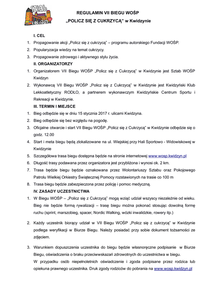 REGULAMIN VII BIEGU WOŚP „POLICZ SIĘ Z CUKRZYCĄ” w Kwidzynie I. CEL 1. Propagowanie akcji „Policz się z cukrzycą” – programu autorskiego Fundacji WOŚP. 2. Popularyzacja wiedzy na temat cukrzycy. 3. Propagowanie zdrowego i aktywnego stylu życia. II. ORGANIZATORZY 1. Organizatorem VII Biegu WOŚP „Policz się z Cukrzycą” w Kwidzynie jest Sztab WOŚP Kwidzyn 2. Wykonawcą VII Biegu WOŚP „Policz się z Cukrzycą” w Kwidzynie jest Kwidzyński Klub Lekkoatletyczny RODŁO, a partnerem wykonawczym Kwidzyńskie Centrum Sportu i Rekreacji w Kwidzynie. III. TERMIN I MIEJSCE 1. Bieg odbędzie się w dniu 15 stycznia 2017 r. ulicami Kwidzyna. 2. Bieg odbędzie się bez względu na pogodę. 3. Oficjalne otwarcie i start VII Biegu WOŚP „Policz się z Cukrzycą” w Kwidzynie odbędzie się o godz. 12.00 4. Start i meta biegu będą zlokalizowane na ul. Wiejskiej przy Hali Sportowo Widowiskowej w Kwidzynie 5. Szczegółowa trasa biegu dostępna będzie na stronie internetowej www.wosp.kwidzyn.pl 6. Długość trasy podawana przez organizatora jest przybliżona i wynosi ok. 2 km. 7. Trasa będzie biegu będzie oznakowana przez Wolontariuszy Sztabu oraz Pokojowego Patrolu Wielkiej Orkiestry Świątecznej Pomocy rozstawionych na trasie co 100 m 8. Trasa biegu będzie zabezpieczona przez policję i pomoc medyczną. IV. ZASADY UCZESTNICTWA 1. W Biegu WOŚP – „Policz się z Cukrzycą” mogą wziąć udział wszyscy niezależnie od wieku. Bieg nie będzie formą rywalizacji – trasę biegu można pokonać stosując dowolną formę ruchu (sprint, marszobieg, spacer, Nordic Walking, wózki inwalidzkie, rowery itp.) 2. Każdy uczestnik biorący udział w VII Biegu WOŚP „Policz się z cukrzycą” w Kwidzynie podlega weryfikacji w Biurze Biegu. Należy posiadać przy sobie dokument tożsamości ze zdjęciem. 3. Warunkiem dopuszczenia uczestnika do biegu będzie własnoręczne podpisanie w Biurze Biegu, oświadczenia o braku przeciwwskazań zdrowotnych do uczestnictwa w biegu. W przypadku osób niepełnoletnich oświadczenie i zgoda podpisane przez rodzica lub opiekuna prawnego uczestnika. Druk zgody rodziców do pobrania na www.wosp.kwidzyn.pl 4. Wszyscy uczestnicy VII Biegu WOŚP „Policz się z Cukrzycą” w Kwidzynie zobowiązani są do stosowania się do poleceń osób odpowiedzialnych za bezpieczeństwo, służb porządkowych oraz obsługi z ramienia Organizatora. 5. Uczestnicy biegu startują na własną odpowiedzialność. 6. Decyzje obsługi medycznej co do kontynuowania biegu są ostateczne i niezmienne. V. ZGŁOSZENIA 1. Zgłoszenia uczestników do VII Biegu WOŚP „Policz się z cukrzycą” w Kwidzynie przyjmowane będą przy użyciu formularza zgłoszeniowego dostępnego na stronie internetowej www.wosp.kwidzyn.pl 2. Zgłoszenia internetowe przyjmowane będą od godz. 18.00 dnia 1 grudnia 2016 do godz. 23.59 dnia 9 stycznia 2017 r. Po tym terminie zgłoszenia do biegu przyjmowane będą z dokumentem tożsamości, a w przypadku osób niepełnoletnich ze zgodą rodziców, w Biurze Biegu w dniu 15 stycznia 2017 w godzinach 10.00 11.30. Za zgłoszenie do biegu uważa się dopełnienie wszystkich poniższych czynności: ● Prawidłowe wypełnienie formularza zgłoszeniowego na stronie internetowej www.wosp.kwidzyn.pl ● Podpisanie oświadczenia o braku przeciwwskazań do uczestnictwa w biegu oraz złożenie zgody rodziców w przypadku osób niepełnoletnich. 3. Każdy uczestnik po zweryfikowaniu z dokumentem tożsamości w Biurze Biegu otrzyma indywidualny numer startowy. VI. Biuro Biegu Biuro V II Biegu WOŚP „Policz się z Cukrzycą” w Kwidzynie: Hala Widowisko – Sportowa ul. Wiejska 1 w Kwidzynie Czynne: 15 stycznia 2017 r. w godz. 10.00 – 11.45 Do dyspozycji uczestników biegu organizatorzy zapewniają szatnię. Podpisanie „Formularza zgłoszenia/oświadczenia” jest równoznaczne z wyrażeniem przez uczestnika zgody i zezwoleniem Fundacji WOŚP na wykorzystanie podanych w nim danych osobowych na potrzeby imprezy oraz z wyrażeniem zgody na wykorzystanie wizerunku uczestnika na potrzeby telewizji, prasy i materiałów reklamowych Fundacji WOŚP oraz Sztabu WOŚP Kwidzyn. Wszystkie informacje dotyczące Uczestników, uzyskane z Formularza Zgłoszenia, które pozwolą zidentyfikować poszczególnych Uczestników, zostaną zapisane w sposób elektroniczny i w każdym wypadku będą używane zgodnie z „Ustawą o ochronie danych osobowych” z dnia 29 sierpnia 1997 roku (Dz. U. Nr 133, poz. 883 ze zmianami). Fundacja WOŚP oraz Sztab WOŚP Kwidzyn nie będzie ujawniać takich informacji osobom trzecim.