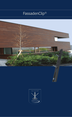 FassadenClip® FassadenClip® Najlepszy optycznie sposób mocowania fasad! FassadenClip® umieszcza się wygodnie ogranicznikiem na spodzie deski fasadowej i mocuje znajdującymi się w zestawie śrubami BohrFix®. Rozwiązane nie uszkadza górnej oraz bocznej powierzchni deski fasadowej! Powtórzyć czynność na każdym następnym drewnianym elemencie fasadowym, przestawionym bocznie. Konstrukcja wsporcza wymaga szerokości minimalnej 50 mm. Odstęp boczny wynika z szerokości konstrukcji listew. Teraz wystarczy ułożyć deskę fasadową i połączyć ją od góry śrubami z konstrukcją nośną/łatą. Dobra wentylacja fasady! Drewno ma dobre warunki do schnięcia, co zdecydowanie wydłuża trwałość fasady. Dzięki czarnej powierzchni FassadenClip® nie jest widoczny w szczelinie! Równe szczeliny – to bardzo proste! Odstęp szczelinowy jest regulowany automatycznie przy pomocy główki znajdującej się w zestawie śruby BohrFix®. W celu uzyskania dowolnie ustalonego, indywidualnie dopasowanego wymiaru fug dostarczony w dostawie wkręt systemowy wkręcony zostanie jedynie do górnego otworu FassadenClip®. L B H Type FCS Wysokość [mm] min. maks. 115 x 17 115 15 5,5 57 68 130 x 17 130 15 5,5 69 80 145 x 17 145 15 5,5 81 95 115 x 22 115 15 5,5 57 68 130 x 22 130 15 5,5 69 80 145 x 22 145 15 5,5 81 95 115 x 28 115 15 5,5 57 68 130 x 28 130 15 5,5 69 80 145 x 28 145 15 5,5 81 95 H Wymiar profilu fasadowego Grubość [mm] Ø 4,5 x 29 B Ø 4,2 x 17 lub Ø 4,2 x 22 lub Ø 4,2 x 28 Co najmniej 19 24 Wysokość FassadenClip® Wymiary [mm] L Wymiar 30 Obliczenie ilości = m² : odstęp konstrukcji wsporczej : (wysokość profilu fasadowego + fuga) Grubość 1 2 3 4 5 6 8 Art.Nr. 39152_2013 7 9 10 11 12 13 14 15 16 17 18 19 20 21 22 23 24 www.sihga.com Najbliższy przedstawiciel systemowy SIHGA®: 25 26