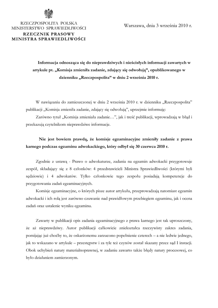 RZECZPOSPOLITA POLSKA MINISTERSTWO SPRAWIEDLIWOŚCI RZECZNIK PRASOWY MINISTRA SPRAWIEDLIWOŚCI Warszawa, dnia 3 września 2010 r. Informacja odnosząca się do nieprawdziwych i nieścisłych informacji zawartych w artykule pt. „Komisja zmieniła zadanie, zdający się odwołują”, opublikowanego w dzienniku „Rzeczpospolita” w dniu 2 września 2010 r. W nawiązaniu do zamieszczonej w dniu 2 września 2010 r. w dzienniku „Rzeczpospolita” publikacji „Komisja zmieniła zadanie, zdający się odwołują”, uprzejmie informuję: Zarówno tytuł „Komisja zmieniała zadanie…”, jak i treść publikacji, wprowadzają w błąd i przekazują czytelnikom nieprawdziwe informacje. Nie jest bowiem prawdą, Ŝe komisje egzaminacyjne zmieniły zadanie z prawa karnego podczas egzaminu adwokackiego, który odbył się 30 czerwca 2010 r. Zgodnie z ustawą - Prawo o adwokaturze, zadania na egzamin adwokacki przygotowuje zespół, składający się z 8 członków: 4 przedstawicieli Ministra Sprawiedliwości (którymi byli sędziowie) i 4 adwokatów. Tylko członkowie tego zespołu posiadają kompetencje do przygotowania zadań egzaminacyjnych. Komisje egzaminacyjne, o których pisze autor artykułu, przeprowadzają natomiast egzamin adwokacki i ich rolą jest zarówno czuwanie nad prawidłowym przebiegiem egzaminu, jak i ocena zadań oraz ustalenie wyniku egzaminu. Zawarty w publikacji opis zadania egzaminacyjnego z prawa karnego jest tak uproszczony, Ŝe aŜ nieprawdziwy. Autor publikacji całkowicie zniekształca rzeczywisty zakres zadania, pomijając juŜ choćby to, Ŝe oskarŜonemu zarzucono popełnienie czterech – a nie ledwie jednego, jak to wskazano w artykule – przestępstw i za tyle teŜ czynów został skazany przez sąd I instacji. Obok uchybień natury materialnoprawnej, w zadaniu zawarto takŜe błędy natury procesowej, co było działaniem zamierzonym. 2 NaleŜy podkreślić, Ŝe akta sprawy zostały opracowane w taki sposób, by zawarte w nich problemy prawne i wadliwości orzeczenia sądu pozwalały na przygotowanie apelacji – na korzyść oskarŜonego. PoniewaŜ w praktyce zdarza się, Ŝe orzeczenia sądowe dotknięte są róŜnorakimi uchybieniami, stąd bezspornym winno być, iŜ takie uchybienia lub niejednoznaczności mogą równieŜ znaleźć się w zadaniu, specjalnie opracowywanym na potrzeby egzaminu. Z tej przyczyny do treści zadań celowo wprowadzane były róŜnego rodzaju wady, umoŜliwiające zdającym konstruowanie zarzutów apelacyjnych. Taką zasadą kierowali się teŜ twórcy zadania egzaminacyjnego z prawa karnego. Zdaniem zespołu opracowującego ww. zadanie, istotnymi problemami prawnymi, występującymi w tym zadaniu, które winni byli dostrzec zdający, były: 1.błędna kwalifikacja prawna pierwszego z przypisanych oskarŜonemu czynów w sytuacji, gdy zachowanie oskarŜonego wyczerpało znamiona wykroczenia z art. 127 § 1 kw, nie zaś przypisanego mu przestępstwa z art. 289 § 1 kk; 2.błędne uznanie, Ŝe oskarŜony prowadząc samochód w stanie nietrzeźwości oraz wbrew orzeczonemu uprzednio zakazowi prowadzenia pojazdów mechanicznych popełnił dwa przestępstwa – jedno z art. 178a § 1 k.k. i drugie z art. 244 k.k., w sytuacji, gdy zachowania takie stanowią jedno przestępstwo, podlegające kumulatywnej kwalifikacji prawnej (art. 11 § 2 k.k.); 3.błędne przypisanie oskarŜonemu popełnienia przestępstwa z art. 178 a § 1 k.k. w warunkach recydywy, w sytuacji, gdy uprzednie skazanie dotyczyło wypadku drogowego z art. 177 § 2 k.k., a zatem przestępstwa nieumyślnego; 4.obraza art. 186 § 1 k.p.k. i art. 391 § 1 k.p.k. poprzez odczytanie na rozprawie złoŜonych w dochodzeniu zeznań zięcia oskarŜonego, który jako osoba najbliŜsza, skorzystał z prawa do odmowy zeznań, a następnie poprzez ich dowodowe wykorzystanie, wbrew zakazowi wynikającemu z art. 186 § 1 k.p.k.; 5.niesłuszne skazanie oskarŜonego za przestępstwo z art. 284 § 1 k.k., w sytuacji, gdy jedynym dowodem wskazującym na sprawstwo oskarŜonego w tym zakresie, były zeznania jego zięcia, których w opisanej wyŜej sytuacji procesowej sąd nie mógł wykorzystać; 6.obraza art. 86 § 1 k.k. poprzez orzeczenie kary łącznej w rozmiarze przekraczającym sumę kar jednostkowych; 7.ewentualnie raŜąca niewspółmierność kar wymierzonych oskarŜonemu. 3 To były najistotniejsze problemy do rozstrzygnięcia w sprawie. W świetle powyŜszego, oczywistym jest więc, Ŝe opis zadania egzaminacyjnego z prawa karnego, zawarty w ww. publikacji prasowej, stanowi w istocie zaledwie bardzo wąski jego wycinek. Problem poruszony w tej publikacji stanowił jedną z wielu kwestii i z pewnością nie najwaŜniejszą. To, Ŝe w trakcie egzaminu poinformowano zdających o tym, Ŝe zakaz prowadzenia pojazdów mechanicznych orzeczony był na 2 lata, miało wyłącznie charakter porządkowy i w Ŝaden sposób nie zmieniło ani nie utrudniło zadania. Okres, na który orzeczono ten środek, był bowiem wskazany w aktach sprawy, i to kilkakrotnie, w szczególności w protokole przesłuchania podejrzanego (k.16), uzasadnieniu aktu oskarŜenia (k.20) i uzasadnieniu wyroku sądu I instancji (k.29). Łatwo to sprawdzić w treści zadania z prawa karnego, opublikowanego na stronach internetowych Ministerstwa Sprawiedliwości (www.ms.gov.pl). Dlatego teŜ nie powtarzano tej informacji w kaŜdym miejscu, kiedy była mowa o wcześniejszym skazaniu oskarŜonego, co wydaje się zrozumiałe. Niemniej, skoro w trakcie egzaminu, jeden ze zdających chciał się upewnić co do tej kwestii, postanowiono przekazać stosowną informację wszystkim zdającym, choć w Ŝaden sposób nie zmieniało to merytorycznej oceny sprawy. Przewrotność argumentacji zawartej w artykule wynika z tego, Ŝe nawet gdyby załoŜyć, Ŝe w zadaniu nie wskazano 2-letniego okresu obowiązywania zakazu prowadzenia pojazdów mechanicznych, to rozwiązanie zadania byłoby takie samo. Wystarczające byłoby bowiem 