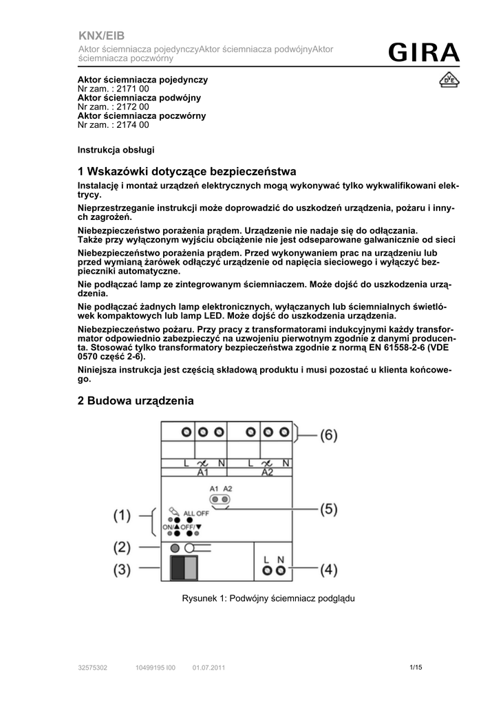 KNX/EIB Aktor ściemniacza pojedynczyAktor ściemniacza podwójnyAktor ściemniacza poczwórny Aktor ściemniacza pojedynczy Nr zam. : 2171 00 Aktor ściemniacza podwójny Nr zam. : 2172 00 Aktor ściemniacza poczwórny Nr zam. : 2174 00 Instrukcja obsługi 1 Wskazówki dotyczące bezpieczeństwa Instalację i montaż urządzeń elektrycznych mogą wykonywać tylko wykwalifikowani elektrycy. Nieprzestrzeganie instrukcji może doprowadzić do uszkodzeń urządzenia, pożaru i innych zagrożeń. Niebezpieczeństwo porażenia prądem. Urządzenie nie nadaje się do odłączania. Także przy wyłączonym wyjściu obciążenie nie jest odseparowane galwanicznie od sieci Niebezpieczeństwo porażenia prądem. Przed wykonywaniem prac na urządzeniu lub przed wymianą żarówek odłączyć urządzenie od napięcia sieciowego i wyłączyć bezpieczniki automatyczne. Nie podłączać lamp ze zintegrowanym ściemniaczem. Może dojść do uszkodzenia urządzenia. Nie podłączać żadnych lamp elektronicznych, wyłączanych lub ściemnialnych świetlówek kompaktowych lub lamp LED. Może dojść do uszkodzenia urządzenia. Niebezpieczeństwo pożaru. Przy pracy z transformatorami indukcyjnymi każdy transformator odpowiednio zabezpieczyć na uzwojeniu pierwotnym zgodnie z danymi producenta. Stosować tylko transformatory bezpieczeństwa zgodnie z normą EN 61558-2-6 (VDE 0570 część 2-6). Niniejsza instrukcja jest częścią składową produktu i musi pozostać u klienta końcowego. 2 Budowa urządzenia Rysunek 1: Podwójny ściemniacz podglądu 32575302 10499195 I00 01.07.2011 1/15 KNX/EIB Aktor ściemniacza pojedynczyAktor ściemniacza podwójnyAktor ściemniacza poczwórny Rysunek 2: Poczwórny ściemniacz podglądu (1) (2) (3) (4) (5) (6) Klawiatura do obsługi ręcznej Przycisk programowania i dioda LED Przyłącze KNX Przyłącze sieciowe Dioda LED statusu Wyjścia zacisków przyłącza 3 Działanie Informacja o systemie Niniejsze urządzenie jest produktem systemu KNX i spełnia dyrektywy standardu KNX. Zakłada się, że użytkownik odbył szkolenia dotyczące standardu KNX i dysponuje odpowiednią wiedzą fachową w tym zakresie. Działanie urządzenia jest zależne od oprogramowania. Szczegółowe informacje o wersjach oprogramowania i danych zakresach funkcji jak również o samym oprogramowaniu zawarte są w bazie danych produktu u producenta. Projektowanie, instalacja i uruchomienie urządzenia odbywa się przy pomocy oprogramowania z certyfikatem KNX. Baza danych produktu jak również opisy techniczne znajdują się aktualnie na naszej stronie Internetowej. Zastosowanie zgodne z przeznaczeniem Włączanie i przyciemnianie żarówek HV, lamp halogenowych HV, jak również lamp halogenowych HV z transformatorem indukcyjnym Montaż na szynie montażowej zgodnie z DIN EN 60715 w rozdzielnicy Dotyczy tylko pojedynczego ściemniacza oświetlenia: Regulator obrotów dla silników jednofazowych takich jak silniki indukcyjne, synchroniczne, lub uniwersalne Właściwości produktu automatyczny lub ręczny wybór zasady przyciemniania pasującego do obciążenia Zabezpieczenie przed pracą jałową, zwarciem i zbyt wysoką temperaturą Komunikat w razie spięcia Wyjścia obsługiwane ręcznie Komunikat zwrotny o stanie załączenia i wartości ściemnienia Parametryzacja załączania i ściemniania Funkcje czasowe: opóźnienie włączania i wyłączania, przełącznik schodowy z funkcją wstępnego ostrzegania Praca w trybie scen świetlnych Blokady poszczególnych wyjść ręcznie lub przez magistralę Kontrolka LED statusu 32575302 10499195 I00 01.07.2011 2/15 KNX/EIB Aktor ściemniacza pojedynczyAktor ściemniacza podwójnyAktor ściemniacza poczwórny - Licznik godzin pracy Zanik napięcia sieciowego na dłużej niż ok. 5 s. prowadzi do wyłączenia ściemniającego organu wykonawczego. W zależności od paramterów ustawienia podłączone obciążenie jest wyliczane na nowo Dotyczy tylko poczwórnego ściemniacza oświetlenia: Zwiększenie mocy wyjściowej możliwe jest poprzez podłączenie równoległe wielu wyjść i Stan fabryczny: zarządzanie placem budowy, obsługa wyjść za pomocą pola przycisków Stan fabryczny: ściemniacz pojedynczy: tryb ściemniania i Podłączone urządzenia oświetleniowe mogą migotać z powodu spadku obciążenia poniżej określonego minimum bądź wpływu sygnałów sterowania generowanych przez elektrownie. Takie działanie urządzenia nie jest wadliwe. 4 Obsługa Elementy obsługowe Rysunek 3: Elementy obsługowe (5) Wyjścia statusu LED (7) Przycisk c – obsługa ręczna (8) Dioda LED c – zał: ciągły tryb ręczny (9) Przycisk ON/n: Włączanie/ściemnianie w mniejszym stopniu (10) LED ON/n – włączenie: włączenie wybranego wyjścia, 1...100% (11) Przycisk OFF/o: Wyłączanie/ściemnianie w większym stopniu (12) LED OFF/o – włączenie: wyłączenie wybranego wyjścia (13) Przycisk ALL OFF: Wyłączenie wszystkich wyjść Wskazanie statusu Diody LED statusu A1... (5) wskazują statusy wyjść. wył: wyjście wyłączone zał:wyjście włączone miga powoli: wyjście w trybie ręcznym miga szybko: wyjście poprzez ciągły tryb ręczny zablokowane Tryby pracy Tryb magistralowy: obsługa poprzez czujniki dotykowe lub inne urządzenia na magistrali Krótkotrwały tryb ręczny: ręczna obsługa na miejscu przy pomocy klawiatury, automatyczny powrót do trybu magistralowego Permanentny tryb ręczny: wyłącznie ręczna obsługa urządzenia i W trybie ręcznym nie możliwy jest tryb magistralowy. i W przypadku awarii magistrali możliwy jest tryb ręczny. i Po awarii i późniejszym przywróceniu funkcji magistrali urządzenie przełącza się na tryb magistralowy. 32575302 10499195 I00 01.07.2011 3/15 KNX/EIB Aktor ściemniacza pojedynczyAktor ściemniacza podwójnyAktor ściemniacza poczwórny i Po awarii i późniejszym przywróceniu zasilania sieciowego urządzenia przełącza się na tryb magistralowy. i Tryb ręczny można zablokowa