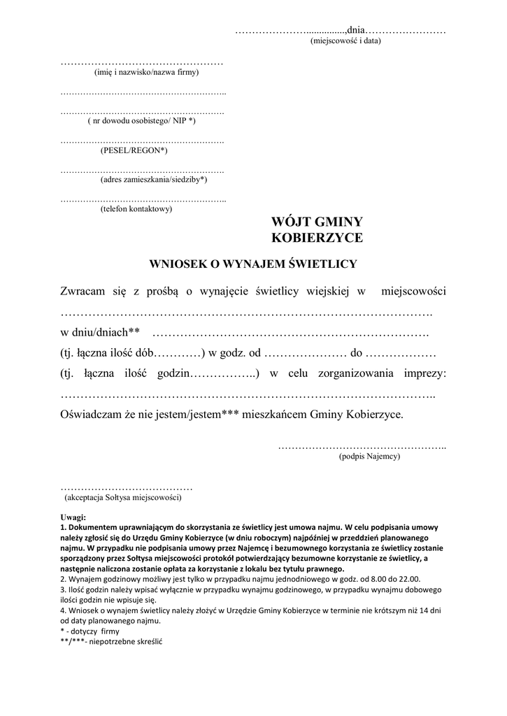 …………………...............,dnia…………………… (miejscowość i data) ………………………………………… (imię i nazwisko/nazwa firmy) ………………………………………………….. …………………………………………………. ( nr dowodu osobistego/ NIP *) …………………………………………………. (PESEL/REGON*) …………………………………………………. (adres zamieszkania/siedziby*) ………………………………………………….. (telefon kontaktowy) WÓJT GMINY KOBIERZYCE WNIOSEK O WYNAJEM ŚWIETLICY Zwracam się z prośbą o wynajęcie świetlicy wiejskiej w miejscowości …………………………………………………………………………………. w dniu/dniach** ……………………………………………………………. (tj. łączna ilość dób…………) w godz. od ………………… do ……………… (tj. łączna ilość godzin……………..) w celu zorganizowania imprezy: ………………………………………………………………………………….. Oświadczam że nie jestem/jestem*** mieszkańcem Gminy Kobierzyce. ………………………………………….. (podpis Najemcy) ………………………………… (akceptacja Sołtysa miejscowości) Uwagi: 1. Dokumentem uprawniającym do skorzystania ze świetlicy jest umowa najmu. W celu podpisania umowy należy zgłosid się do Urzędu Gminy Kobierzyce (w dniu roboczym) najpóźniej w przeddzieo planowanego najmu. W przypadku nie podpisania umowy przez Najemcę i bezumownego korzystania ze świetlicy zostanie sporządzony przez Sołtysa miejscowości protokół potwierdzający bezumowne korzystanie ze świetlicy, a następnie naliczona zostanie opłata za korzystanie z lokalu bez tytułu prawnego. 2. Wynajem godzinowy możliwy jest tylko w przypadku najmu jednodniowego w godz. od 8.00 do 22.00. 3. Ilośd godzin należy wpisad wyłącznie w przypadku wynajmu godzinowego, w przypadku wynajmu dobowego ilości godzin nie wpisuje się. 4. Wniosek o wynajem świetlicy należy złożyd w Urzędzie Gminy Kobierzyce w terminie nie krótszym niż 14 dni od daty planowanego najmu. * - dotyczy firmy **/***- niepotrzebne skreślid