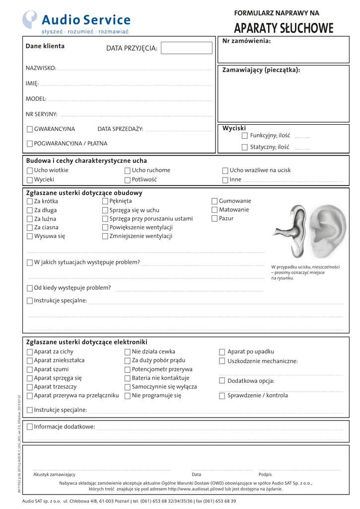 FORMULARZ NAPRAWY NA APARATY SŁUCHOWE Dane klienta Nr zamówienia: DATA PRZYJĘCIA: NAZWISKO: Zamawiający (pieczątka): IMIĘ: MODEL: NR SERYJNY: GWARANCYJNA Wyciski DATA SPRZEDAŻY: POGWARANCYJNA / PŁATNA Funkcyjny; ilość Statyczny; ilość Budowa i cechy charakterystyczne ucha Ucho wiotkie Ucho ruchome Ucho wrażliwe na ucisk Wycieki Potliwość Inne Zgłaszane usterki dotyczące obudowy Za krótka Za długa Za luźna Za ciasna Wysuwa się Pęknięta Sprzęga się w uchu Sprzęga przy poruszaniu ustami Powiększenie wentylacji Zmniejszenie wentylacji Gumowanie Matowanie Pazur W jakich sytuacjach występuje problem? W przypadku ucisku, nieszczelności – prosimy oznaczyć miejsce na rysunku. Od kiedy występuje problem? Instrukcje specjalne: JM 71552 || 06.2013 || AUD-PL-F_LOG_003, ver 3.0, Effective: 2013-07-01 Zgłaszane usterki dotyczące elektroniki Aparat za cichy Aparat zniekształca Aparat szumi Aparat sprzęga się Aparat trzeszczy Aparat przerywa na przełączniku Nie działa cewka Za duży pobór prądu Potencjometr przerywa Bateria nie kontaktuje Samoczynnie się wyłącza Nie programuje się Aparat po upadku Uszkodzenie mechaniczne: Dodatkowa opcja: Sprawdzenie / kontrola Instrukcje specjalne: Informacje dodatkowe: Akustyk zamawiający Data Podpis Nabywca składając zamówienie akceptuje aktualne Ogólne Warunki Dostaw (OWD) obowiązujące w spółce Audio SAT Sp. z o.o., których treść znajduje się pod adresem http://www.audiosat.pl/owd lub jest dostępna na żądanie. Audio SAT sp. z o.o. ul. Chlebowa 4/8, 61-003 Poznań | tel. (061) 653 68 32/34/35/36 | fax (061) 653 68 39