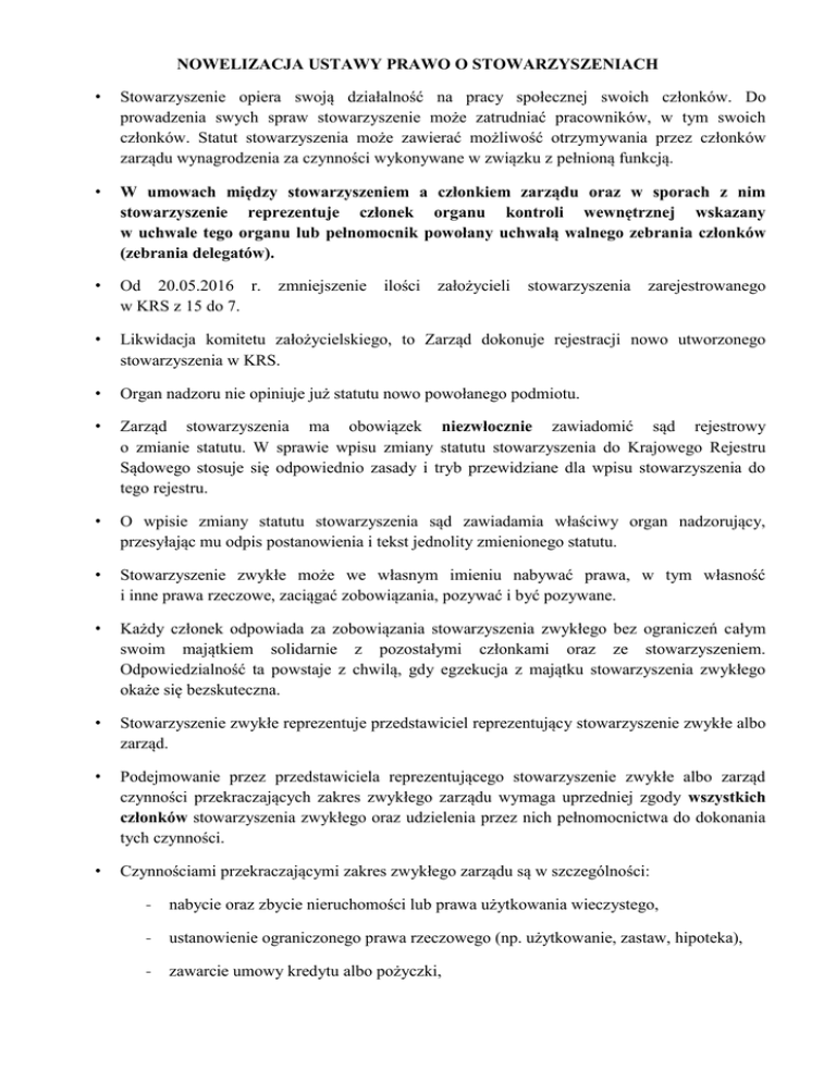 NOWELIZACJA USTAWY PRAWO O STOWARZYSZENIACH • Stowarzyszenie opiera swoją działalność na pracy społecznej swoich członków. Do prowadzenia swych spraw stowarzyszenie może zatrudniać pracowników, w tym swoich członków. Statut stowarzyszenia może zawierać możliwość otrzymywania przez członków zarządu wynagrodzenia za czynności wykonywane w związku z pełnioną funkcją. • W umowach między stowarzyszeniem a członkiem zarządu oraz w sporach z nim stowarzyszenie reprezentuje członek organu kontroli wewnętrznej wskazany w uchwale tego organu lub pełnomocnik powołany uchwałą walnego zebrania członków (zebrania delegatów). • Od 20.05.2016 r. w KRS z 15 do 7. • Likwidacja komitetu założycielskiego, to Zarząd dokonuje rejestracji nowo utworzonego stowarzyszenia w KRS. • Organ nadzoru nie opiniuje już statutu nowo powołanego podmiotu. • Zarząd stowarzyszenia ma obowiązek niezwłocznie zawiadomić sąd rejestrowy o zmianie statutu. W sprawie wpisu zmiany statutu stowarzyszenia do Krajowego Rejestru Sądowego stosuje się odpowiednio zasady i tryb przewidziane dla wpisu stowarzyszenia do tego rejestru. • O wpisie zmiany statutu stowarzyszenia sąd zawiadamia właściwy organ nadzorujący, przesyłając mu odpis postanowienia i tekst jednolity zmienionego statutu. • Stowarzyszenie zwykłe może we własnym imieniu nabywać prawa, w tym własność i inne prawa rzeczowe, zaciągać zobowiązania, pozywać i być pozywane. • Każdy członek odpowiada za zobowiązania stowarzyszenia zwykłego bez ograniczeń całym swoim majątkiem solidarnie z pozostałymi członkami oraz ze stowarzyszeniem. Odpowiedzialność ta powstaje z chwilą, gdy egzekucja z majątku stowarzyszenia zwykłego okaże się bezskuteczna. • Stowarzyszenie zwykłe reprezentuje przedstawiciel reprezentujący stowarzyszenie zwykłe albo zarząd. • Podejmowanie przez przedstawiciela reprezentującego stowarzyszenie zwykłe albo zarząd czynności przekraczających zakres zwykłego zarządu wymaga uprzedniej zgody wszystkich członków stowarzyszenia zwykłego oraz udzielenia przez nich pełnomocnictwa do dokonania tych czynności. • Czynnościami przekraczającymi zakres zwykłego zarządu są w szczególności: zmniejszenie ilości założycieli stowarzyszenia zarejestrowanego - nabycie oraz zbycie nieruchomości lub prawa użytkowania wieczystego, - ustanowienie ograniczonego prawa rzeczowego (np. użytkowanie, zastaw, hipoteka), - zawarcie umowy kredytu albo pożyczki, • - przejęcie długu, uznanie długu, zwolnienie z długu, przystąpienie do długu, zawarcie umowy poręczenia lub zawarcie innej podobnej umowy, - zaciągnięcie innych zobowiązań przekraczających wartość 10 000 zł. Stowarzyszenie zwykłe nie może: - powoływać terenowych jednostek organizacyjnych, - zrzeszać osób prawnych, - prowadzić działalności gospodarczej, - prowadzić odpłatnej działalności pożytku publicznego. • Stowarzyszenie zwykłe uzyskuje środki na działalność ze składek członkowskich, darowizn, spadków, zapisów, dochodów z majątku stowarzyszenia oraz ofiarności publicznej. Może otrzymywać dotacje na zasadach określonych w odrębnych przepisach. • Zasady tworzenia stowarzyszeń zwykłych: • • - Osoby w liczbie co najmniej trzech, zamierzające założyć stowarzyszenie zwykłe: - uchwalają regulamin działalności, - określający w szczególności nazwę stowarzyszenia zwykłego, - cel lub cele, - teren i środki działania, - siedzibę, - przedstawiciela reprezentującego stowarzyszenie zwykłe albo zarząd, - zasady dokonywania zmian regulaminu działalności, sposób nabycia i utraty członkostwa, a także sposób rozwiązania stowarzyszenia zwykłego Organy w stowarzyszeniu zwykłym - Stowarzyszenie zwykłe, które zamierza posiadać zarząd, określa w regulaminie działalności tryb jego wyboru oraz uzupełniania składu, kompetencje, warunki ważności jego uchwał oraz sposób reprezentowania stowarzyszenia zwykłego, w szczególności zaciągania zobowiązań majątkowych. - Stowarzyszenie zwykłe, które zamierza posiadać organ kontroli wewnętrznej, określa w regulaminie działalności tryb jego wyboru, uzupełniania składu oraz jego kompetencje. Rejestracja stowarzyszenia zwykłego - Przedstawiciel reprezentujący stowarzyszenie zwykłe albo zarząd składają na piśmie organowi nadzorującemu właściwemu ze względu na siedzibę stowarzyszenia zwykłego wniosek o wpis do ewidencji stowarzyszeń zwykłych dołączając: - • 1) regulamin działalności, • 2) listę założycieli stowarzyszenia zwykłego, zawierającą ich imiona i nazwiska, datę i miejsce urodzenia, miejsce zamieszkania oraz własnoręczne podpisy założycieli, • 3) imię i nazwisko, adres zamieszkania oraz numer PESEL przedstawiciela reprezentującego stowarzyszenie zwykłe albo członków zarządu, • 4) imię i nazwisko, adres zamieszkania oraz numer PESEL członków organu kontroli wewnętrznej, o ile regulamin działalności przewiduje ten organ, • 5) adres siedziby stowarzyszenia zwykłego. Jeżeli wniosek o wpis składa zarząd, podpisują go wszyscy członkowie zarządu. Stowarzyszenie zwykłe powstaje i może rozpocząć działalność z chwilą wpisu do ewidencji. • Sąd rejestrowy, na wniosek organu nadzorującego lub prokuratora, może zakazać założenia stowarzyszenia zwykłego, jeżeli nie spełnia ono warunków określonych w przepisach prawa. • Wpis do ewidencji stowarzyszeń zwykłych - Organ nadzorujący dokonuje wpisu do ewidencji w terminie 7 dni od dnia: • wpływu wniosku o wpis, jeżeli nie został złożony wniosek, o zakazanie działalności, • uprawomocnienia się orzeczenia odrzucającego albo oddalającego wniosek • Organ nadzorujący informuje niezwłocznie przedstawiciela reprezentującego stowarzyszenie zwykłe albo zarząd o dokonaniu wpisu do ewidencji albo bezskuteczności wniosku o wpis. • Stowarzyszenie zwyk