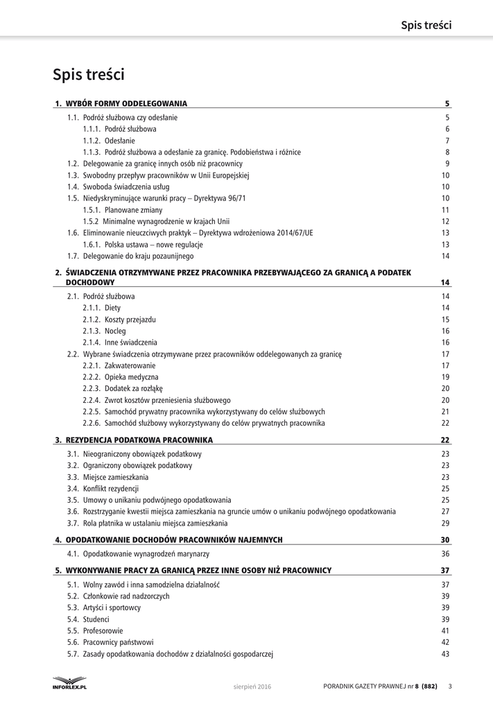 Spis treści Spis treści 1. Wybór formy oddelegowania 5 1.1. Podróż służbowa czy odesłanie 1.1.1. Podróż służbowa 1.1.2. Odesłanie 1.1.3. Podróż służbowa a odesłanie za granicę. Podobieństwa i różnice 1.2. Delegowanie za granicę innych osób niż pracownicy 1.3. Swobodny przepływ pracowników w Unii Europejskiej 1.4. Swoboda świadczenia usług 1.5. Niedyskryminujące warunki pracy – Dyrektywa 96/71 1.5.1. Planowane zmiany 1.5.2 Minimalne wynagrodzenie w krajach Unii 1.6. Eliminowanie nieuczciwych praktyk – Dyrektywa wdrożeniowa 2014/67/UE 1.6.1. Polska ustawa – nowe regulacje 1.7. Delegowanie do kraju pozaunijnego 5 6 7 8 9 10 10 10 11 12 13 13 14 2. Świadczenia otrzymywane przez pracownika przebywającego za granicą a podatek dochodowy 2.1. Podróż służbowa 2.1.1. Diety 2.1.2. Koszty przejazdu 2.1.3. Nocleg 2.1.4. Inne świadczenia 2.2. Wybrane świadczenia otrzymywane przez pracowników oddelegowanych za granicę 2.2.1. Zakwaterowanie 2.2.2. Opieka medyczna 2.2.3. Dodatek za rozłąkę 2.2.4. Zwrot kosztów przeniesienia służbowego 2.2.5. Samochód prywatny pracownika wykorzystywany do celów służbowych 2.2.6. Samochód służbowy wykorzystywany do celów prywatnych pracownika 3. Rezydencja podatkowa pracownika 14 14 14 15 16 16 17 17 19 20 20 21 22 22 3.1. Nieograniczony obowiązek podatkowy 3.2. Ograniczony obowiązek podatkowy 3.3. Miejsce zamieszkania 3.4. Konflikt rezydencji 3.5. Umowy o unikaniu podwójnego opodatkowania 3.6. Rozstrzyganie kwestii miejsca zamieszkania na gruncie umów o unikaniu podwójnego opodatkowania 3.7. Rola płatnika w ustalaniu miejsca zamieszkania 4. Opodatkowanie dochodów pracowników najemnych 23 23 23 25 25 27 29 30 4.1. Opodatkowanie wynagrodzeń marynarzy 36 5. Wykonywanie pracy za granicą przez inne osoby niż pracownicy 5.1. Wolny zawód i inna samodzielna działalność 5.2. Członkowie rad nadzorczych 5.3. Artyści i sportowcy 5.4. Studenci 5.5. Profesorowie 5.6. Pracownicy państwowi 5.7. Zasady opodatkowania dochodów z działalności gospodarczej sierpień 2016 37 37 39 39 39 41 42 43 Poradnik Gazety Prawnej nr 8 (882) 3 Spis treści 6. Unikanie podwójnego opodatkowania 44 6.1. Metoda wyłączenia z progresją 6.2. Metoda odliczenia proporcjonalnego 6.3. Ulga abolicyjna 6.4. Rozliczenie podatkowe przychodów osiągniętych w Polsce oraz kilku krajach posiadających odmienne metody rozliczania podatku 6.5. Rozliczenie podatkowe przychodów osiągniętych wyłącznie za granicą (cały rok przepracowany za granicą) 6.6. Odliczenie zagranicznych składek ubezpieczeniowych 6.7. Przeliczanie dochodów zagranicznych i podatku zapłaconego za granicą na złote 6.7.1. Koszty uzyskania przychodu 6.8. Zeznania roczne składane przez osoby delegowane do pracy za granicą 6.8.1. Wyliczenie kwoty „ulgi abolicyjnej” 7. Ubezpieczenia społeczne pracowników pracujących za granicą 7.1. Zasada jednego ustawodawstwa 7.2. Zasada równego traktowania 7.3. Zasada sumowania okresów ubezpieczenia, zatrudnienia i zamieszkania 7.3.1. Sumowanie okresów przy ustaleniu prawa do świadczeń polskich 7.3.2. Sumowanie okresów przy ustalaniu prawa do świadczeń przysługujących w innym państwie 7.4. Zasada zachowania praw nabytych 7.5. Umowy z państwami trzecimi 7.5.1. Obowiązujące umowy o zabezpieczeniu społecznym 8. Ustalenie właściwego ustawodawstwa w zakresie ubezpieczeń w przypadku delegowania pracowników do krajów UE 8.1. Pracownicy delegowani 8.2. Formularz A1 8.3. Zawieranie porozumień szczególnych 8.4. Zakończenie oddelegowania 8.5. Pracownicy transportu międzynarodowego 56 64 64 64 64 65 67 68 68 69 70 70 71 71 72 72 73 73 74 79 80 80 9. Ustalenie właściwego ustawodawstwa ubezpieczeniowego w stosunku do pracowników wykonujących pracę jednocześnie na terenie kilku państw 9.1. Normalne wykonywanie pracy w dwóch lub kilku państwach członkowskich 9.2. Praca o charakterze marginalnym 9.3. Znaczna część pracy 9.4. Niewykonywanie znacznej części pracy w kraju a właściwe ustawodawstwo 9.5. Obowiązki płatników 9.5.1. Podstawa wymiaru składek dla pracowników pracujących za granicą, a podlegających ubezpieczeniom w Polsce 9.6. Podleganie przez nierezydentów ubezpieczeniom w Polsce 9.7. Obywatele państw trzecich (rozporządzenie 1231/2010) 10. Obowiązki pracodawców delegujących pracowników za granicę 10.1. Obowiązki płatników 10.2. Odliczenie składek na ubezpieczenie społeczne 10.2.1. Odliczenie składek na ubezpieczenie społeczne i zdrowotne od dochodu uzyskanego za granicą płaconych do ZUS 10.2.2. Odliczenie zagranicznych składek na ubezpieczenie społeczne i zdrowotne 10.3. Przygotowanie informacji PIT-11 o dochodach uzyskanych z pracy za granicą 10.4. Przeliczanie dochodów zagranicznych i podatku zapłaconego za granicą na złote Podsumowanie 4 45 49 50 80 82 82 83 84 87 87 89 89 90 90 92 92 95 95 97 97 www.pgp.infor.pl
