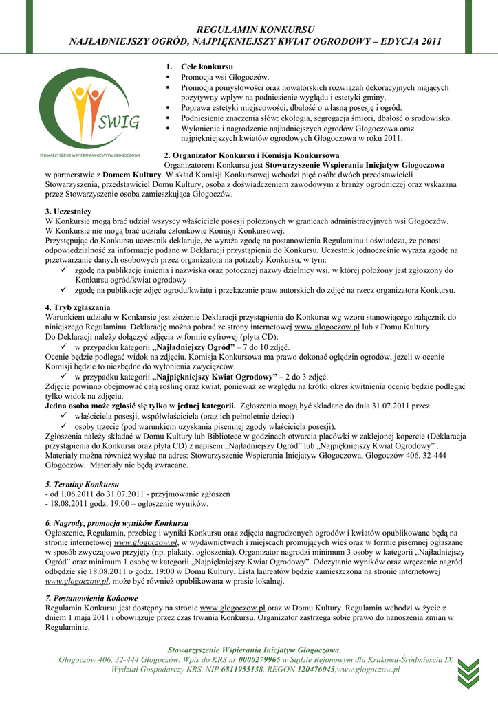 REGULAMIN KONKURSU NAJŁADNIEJSZY OGRÓD, NAJPIĘKNIEJSZY KWIAT OGRODOWY – EDYCJA 2011 1. Cele konkursu Promocja wsi Głogoczów. Promocja pomysłowości oraz nowatorskich rozwiązań dekoracyjnych mających pozytywny wpływ na podniesienie wyglądu i estetyki gminy. Poprawa estetyki miejscowości, dbałość o własną posesję i ogród. Podniesienie znaczenia słów: ekologia, segregacja śmieci, dbałość o środowisko. Wyłonienie i nagrodzenie najładniejszych ogrodów Głogoczowa oraz najpiękniejszych kwiatów ogrodowych Głogoczowa w roku 2011. 2. Organizator Konkursu i Komisja Konkursowa Organizatorem Konkursu jest Stowarzyszenie Wspierania Inicjatyw Głogoczowa w partnerstwie z Domem Kultury. W skład Komisji Konkursowej wchodzi pięć osób: dwóch przedstawicieli Stowarzyszenia, przedstawiciel Domu Kultury, osoba z doświadczeniem zawodowym z branży ogrodniczej oraz wskazana przez Stowarzyszenie osoba zamieszkująca Głogoczów. 3. Uczestnicy W Konkursie mogą brać udział wszyscy właściciele posesji położonych w granicach administracyjnych wsi Głogoczów. W Konkursie nie mogą brać udziału członkowie Komisji Konkursowej. Przystępując do Konkursu uczestnik deklaruje, że wyraża zgodę na postanowienia Regulaminu i oświadcza, że ponosi odpowiedzialność za informacje podane w Deklaracji przystąpienia do Konkursu. Uczestnik jednocześnie wyraża zgodę na przetwarzanie danych osobowych przez organizatora na potrzeby Konkursu, w tym: zgodę na publikację imienia i nazwiska oraz potocznej nazwy dzielnicy wsi, w której położony jest zgłoszony do Konkursu ogród/kwiat ogrodowy zgodę na publikację zdjęć ogrodu/kwiatu i przekazanie praw autorskich do zdjęć na rzecz organizatora Konkursu. 4. Tryb zgłaszania Warunkiem udziału w Konkursie jest złożenie Deklaracji przystąpienia do Konkursu wg wzoru stanowiącego załącznik do niniejszego Regulaminu. Deklarację można pobrać ze strony internetowej www.glogoczow.pl lub z Domu Kultury. Do Deklaracji należy dołączyć zdjęcia w formie cyfrowej (płyta CD): w przypadku kategorii „Najładniejszy Ogród” – 7 do 10 zdjęć. Ocenie będzie podlegać widok na zdjęciu. Komisja Konkursowa ma prawo dokonać oględzin ogrodów, jeżeli w ocenie Komisji będzie to niezbędne do wyłonienia zwycięzców. w przypadku kategorii „Najpiękniejszy Kwiat Ogrodowy” – 2 do 3 zdjęć. Zdjęcie powinno obejmować całą roślinę oraz kwiat, ponieważ ze względu na krótki okres kwitnienia ocenie będzie podlegać tylko widok na zdjęciu. Jedna osoba może zgłosić się tylko w jednej kategorii. Zgłoszenia mogą być składane do dnia 31.07.2011 przez: właściciela posesji, współwłaściciela (oraz ich pełnoletnie dzieci) osoby trzecie (pod warunkiem uzyskania pisemnej zgody właściciela posesji). Zgłoszenia należy składać w Domu Kultury lub Bibliotece w godzinach otwarcia placówki w zaklejonej kopercie (Deklaracja przystąpienia do Konkursu oraz płyta CD) z napisem „Najładniejszy Ogród” lub „Najpiękniejszy Kwiat Ogrodowy” . Materiały można również wysłać na adres: Stowarzyszenie Wspierania Inicjatyw Głogoczowa, Głogoczów 406, 32-444 Głogoczów. Materiały nie będą zwracane. 5. Terminy Konkursu - od 1.06.2011 do 31.07.2011 - przyjmowanie zgłoszeń - 18.08.2011 godz. 19:00 – ogłoszenie wyników. 6. Nagrody, promocja wyników Konkursu Ogłoszenie, Regulamin, przebieg i wyniki Konkursu oraz zdjęcia nagrodzonych ogrodów i kwiatów opublikowane będą na stronie internetowej www.glogoczow.pl, w wydawnictwach i miejscach promujących wieś oraz w formie pisemnej ogłaszane w sposób zwyczajowo przyjęty (np. plakaty, ogłoszenia). Organizator nagrodzi minimum 3 osoby w kategorii „Najładniejszy Ogród” oraz minimum 1 osobę w kategorii „Najpiękniejszy Kwiat Ogrodowy”. Odczytanie wyników oraz wręczenie nagród odbędzie się 18.08.2011 o godz. 19:00 w Domu Kultury. Lista laureatów będzie zamieszczona na stronie internetowej www.glogoczow.pl, może być również opublikowana w prasie lokalnej. 7. Postanowienia Końcowe Regulamin Konkursu jest dostępny na stronie www.glogoczow.pl oraz w Domu Kultury. Regulamin wchodzi w życie z dniem 1 maja 2011 i obowiązuje przez czas trwania Konkursu. Organizator zastrzega sobie prawo do nanoszenia zmian w Regulaminie. Stowarzyszenie Wspierania Inicjatyw Głogoczowa, Głogoczów 406, 32-444 Głogoczów. Wpis do KRS nr 0000279965 w Sądzie Rejonowym dla Krakowa-Śródmieścia IX Wydział Gospodarczy KRS, NIP 6811955138, REGON 120476043,www.glogoczow.pl