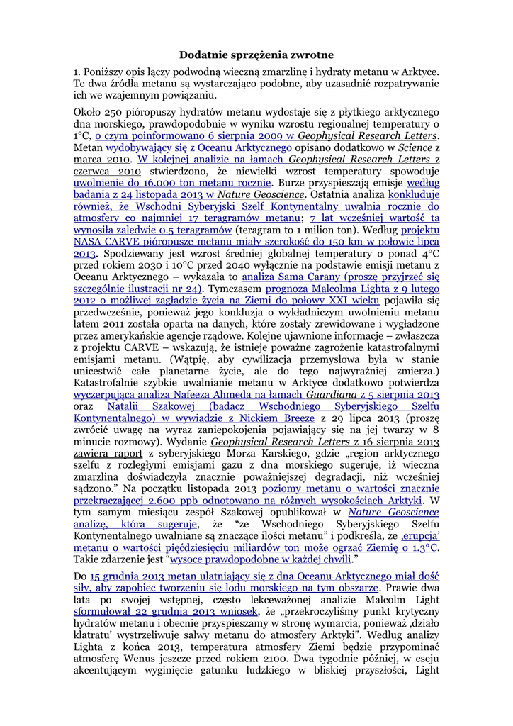 Dodatnie sprzężenia zwrotne 1. Poniższy opis łączy podwodną wieczną zmarzlinę i hydraty metanu w Arktyce. Te dwa źródła metanu są wystarczająco podobne, aby uzasadnić rozpatrywanie ich we wzajemnym powiązaniu. Około 250 pióropuszy hydratów metanu wydostaje się z płytkiego arktycznego dna morskiego, prawdopodobnie w wyniku wzrostu regionalnej temperatury o 1°C, o czym poinformowano 6 sierpnia 2009 w Geophysical Research Letters. Metan wydobywający się z Oceanu Arktycznego opisano dodatkowo w Science z marca 2010. W kolejnej analizie na łamach Geophysical Research Letters z czerwca 2010 stwierdzono, że niewielki wzrost temperatury spowoduje uwolnienie do 16.000 ton metanu rocznie. Burze przyspieszają emisje według badania z 24 listopada 2013 w Nature Geoscience. Ostatnia analiza konkluduje również, że Wschodni Syberyjski Szelf Kontynentalny uwalnia rocznie do atmosfery co najmniej 17 teragramów metanu; 7 lat wcześniej wartość ta wynosiła zaledwie 0.5 teragramów (teragram to 1 milion ton). Według projektu NASA CARVE pióropusze metanu miały szerokość do 150 km w połowie lipca 2013. Spodziewany jest wzrost średniej globalnej temperatury o ponad 4°C przed rokiem 2030 i 10°C przed 2040 wyłącznie na podstawie emisji metanu z Oceanu Arktycznego – wykazała to analiza Sama Carany (proszę przyjrzeć się szczególnie ilustracji nr 24). Tymczasem prognoza Malcolma Lighta z 9 lutego 2012 o możliwej zagładzie życia na Ziemi do połowy XXI wieku pojawiła się przedwcześnie, ponieważ jego konkluzja o wykładniczym uwolnieniu metanu latem 2011 została oparta na danych, które zostały zrewidowane i wygładzone przez amerykańskie agencje rządowe. Kolejne ujawnione informacje – zwłaszcza z projektu CARVE – wskazują, że istnieje poważne zagrożenie katastrofalnymi emisjami metanu. (Wątpię, aby cywilizacja przemysłowa była w stanie unicestwić całe planetarne życie, ale do tego najwyraźniej zmierza.) Katastrofalnie szybkie uwalnianie metanu w Arktyce dodatkowo potwierdza wyczerpująca analiza Nafeeza Ahmeda na łamach Guardiana z 5 sierpnia 2013 oraz Natalii Szakowej (badacz Wschodniego Syberyjskiego Szelfu Kontynentalnego) w wywiadzie z Nickiem Breeze z 29 lipca 2013 (proszę zwrócić uwagę na wyraz zaniepokojenia pojawiający się na jej twarzy w 8 minucie rozmowy). Wydanie Geophysical Research Letters z 16 sierpnia 2013 zawiera raport z syberyjskiego Morza Karskiego, gdzie „region arktycznego szelfu z rozległymi emisjami gazu z dna morskiego sugeruje, iż wieczna zmarzlina doświadczyła znacznie poważniejszej degradacji, niż wcześniej sądzono.” Na początku listopada 2013 poziomy metanu o wartości znacznie przekraczającej 2.600 ppb odnotowano na różnych wysokościach Arktyki. W tym samym miesiącu zespół Szakowej opublikował w Nature Geoscience analizę, która sugeruje, że “ze Wschodniego Syberyjskiego Szelfu Kontynentalnego uwalniane są znaczące ilości metanu” i podkreśla, że ‚erupcja’ metanu o wartości pięćdziesięciu miliardów ton może ogrzać Ziemię o 1.3° C. Takie zdarzenie jest “wysoce prawdopodobne w każdej chwili.” Do 15 grudnia 2013 metan ulatniający się z dna Oceanu Arktycznego miał dość siły, aby zapobiec tworzeniu się lodu morskiego na tym obszarze. Prawie dwa lata po swojej wstępnej, często lekceważonej analizie Malcolm Light sformułował 22 grudnia 2013 wniosek, że „przekroczyliśmy punkt krytyczny hydratów metanu i obecnie przyspieszamy w stronę wymarcia, ponieważ ‚działo klatratu’ wystrzeliwuje salwy metanu do atmosfery Arktyki”. Według analizy Lighta z końca 2013, temperatura atmosfery Ziemi będzie przypominać atmosferę Wenus jeszcze przed rokiem 2100. Dwa tygodnie później, w eseju akcentującym wyginięcie gatunku ludzkiego w bliskiej przyszłości, Light stwierdza: „Tempo przenoszenia prądu zatokowego uruchomiło w Arktyce ‚działo klatratu metanu’ w 2007 roku, kiedy jego energia/rok przekroczyła 10 milionów razy ilość energii/rok niezbędnej do dysocjacji arktycznych hydratów metanu.” Nic dziwnego, że nastąpiło to w 2007 roku, kiedy zasięg arktycznego lodu morskiego osiągnął punkt krytyczny. Uruchomienie ‚działa klatratu metanu’ potwierdza również Örjan Gustafsson z Uniwersytetu w Sztokholmie, który w dniu 23 lipca 2014 podzielił się raportem z rejsu po Morzu Łaptiewów: „Wyniki wstępnych analiz próbek wody morskiej wykazały poziom rozpuszczonego metanu, który jest od 10 do 50 razy wyższy niż poziom tła.” [Glacjolog] Jason Box odpowiada na tę wiadomość w zachowawczy sposób – niczego innego nie spodziewam się po naukowcach akademickich – w dniu 27 lipca 2014 roku: „Jakie znaczenie ma według mnie ta wiadomość? Podwyższony poziom atmosferycznego węgla ze spalania paliw kopalnych jest mechanizmem spustowym szturchającym klimatycznego smoka. Trajektoria, którą zdążamy prowadzi do obudzenia niekontrolowanego ogrzania klimatu, które zdewastuje globalne systemy rolne, powodując masowy głód i konflikty. W porównaniu z nimi wzrost poziomu morza będzie drobnostką.” Później, podczas wywiadu z Vice opublikowanego 1 sierpnia 2014, Box nieco się rozluźnił mówiąc, „Nawet jeśli niewielki ułamek arktycznego węgla został uwolniony do atmosfery, mamy przesrane.” Zaufaj mi Jason, jest po wszystkim. Równolegle z misją na Morzu Łaptiewów na Syberii odkryto kilka ogromnych dziur. Wstępna reakcja w literaturze naukowej, analiza opublikowana 31 lipca 2014 w Nature, wskazuje na poziom atmosferycznego metanu 50.000 razy wyższy od normalnego. Artykuł z 4 sierpnia 2014 w TruthOut rozważa kwestię kraterów: „Jeśli kiedykolwiek zastanawialiście się, czy może zobaczycie koniec znanego nam świata za swojego życia, prawdopodobnie nie powinniście czytać tego artykułu, studiować wykresów, ani patrzeć na zdjęcia utworzonych przez metan kraterów zwanych smoczym od