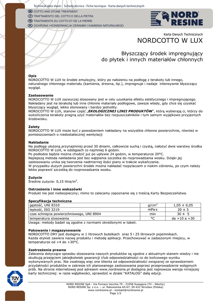 Technical data sheet - Scheda tecnica - Fiche tecnique - Karta danych technicznych COTTO AND STONE TREATMENT TRATTAMENTO DEL COTTO E DELLA PIETRA TRAITEMENTS DU COTTO ET DE LA PIERRE OCHRONA I KONSERWACJA CERAMIKI I KAMIENIA NATURALNEGO Karta Danych Technicznych NORDCOTTO W LUX Błyszczący środek impregnujący do płytek i innych materiałów chłonnych Opis NORDCOTTO W LUX to środek emulsyjny, który po nałożeniu na podłogę z terakoty lub innego, naturalnego chłonnego materiału (kamienia, drewna, itp.), impregnuje i nadaje intensywnie błyszczący wygląd. Zastosowanie NORDCOTTO W LUX zazwyczaj stosowany jest w celu uzyskania efektu estetycznego i impregnującego. Nakładany jest na terakotę lub inne chłonne materiały podłogowe, zawsze wtedy, gdy chce się uzyskać błyszczący wygląd, lekko stonowany i bardzo jednolity. NORDCOTTO W LUX, stanowi część „EKOLOGICZNEJ LINII PRODUKTÓW”, którą wybierają ci, którzy do wykończenia terakoty pragną użyć materiałów bez rozpuszczalników i tym samym wyjątkowo przyjaznych środowisku. Zalety NORDCOTTO W LUX może być z powodzeniem nakładany na wszystkie chłonne powierzchnie, również w pomieszczeniach o niedostatecznej wentylacji Nakładanie Na podłogę ułożoną przynajmniej przed 30 dniami, całkowicie suchą i czystą, nałożyć dwie warstwy środka NORDCOTTO W LUX, w odstępach co najmniej 6 godzin. Po podłodze będzie można chodzić już po upływie 24 godzin, w temperaturze 20°C. Najlepszą metoda nakładania jest bez wątpienia szczotka do rozprowadzania wosku. Dzięki jej zastosowaniu unika się tworzenia nadmiernej ilości piany w trakcie wykańczania. W przypadku dużych powierzchni środek można nakładać rozpylaczem o niskim ciśnieniu, po czym należy lekko poprawić szczotką do rozprowadzania wosku. Zużycie Średnie zużycie: 0,15 litra/m2. Ostrzeżenia i inne wskazówki Produkt nie jest niebezpieczny; mimo to zalecamy zapoznanie się z treścią Karty Bezpieczeństwa. Specyfikacja techniczna gęstość, UNI 8310 lepkość, ISO 3219 czas schnięcia powierzchniowego, UNI 8904 temperatura stosowania Uwaga: metody badań są zgodne z normami określonymi w tabeli. g/cm3 mPa⋅s min °C 1,05 ± 0,05 20 ± 5 30 ± 5 da +10 a +30 Pakowanie i magazynowanie NORDCOTTO DRY jest dostępny w 1 litrowych butelkach oraz 5 i 25 litrowych pojemnikach. Każda etykiet zawiera nazwę produktu i metodę aplikacji. Przechowywać w zadaszonym miejscu, w temperaturze od +4 do +30°C. Zastrzeżenia prawne Zalecenia dotyczące sposobu stosowania naszych produktów są zgodne z aktualnym stanem wiedzy i nie skutkują przejęciem jakiejkolwiek gwarancji i/lub odpowiedzialności co do końcowego wyniku wykonywanych prac. Nie zwalniają więc one klienta od odpowiedzialności związanej ze sprawdzeniem przydatności produktów w zakresie ich planowanego zastosowania poprzez przeprowadzenie wstępnych prób. Na stronie internetowej pod adresem www.nordresine.pl dostępna jest najnowsza wersja niniejszej karty technicznej: w razie wątpliwości, sprawdzić w dziale “KATALOG” datę edycji. NORD RESINE SpA - Via Fornace Vecchia 79 - 31058 Susegana (TV - Włochy) NORD RESINE Sp. z o.o. – ul. Rakowiecka 65-67, 50-422 Wrocław (Polska) www.nordresine.pl - [email protected] Page 1/2 Technical data sheet - Scheda tecnica - Fiche tecnique - Karta danych technicznych COTTO AND STONE TREATMENT TRATTAMENTO DEL COTTO E DELLA PIETRA TRAITEMENTS DU COTTO ET DE LA PIERRE OCHRONA I KONSERWACJA CERAMIKI I KAMIENIA NATURALNEGO Karta Danych Technicznych NORDCOTTO W LUX Błyszczący środek impregnujący do płytek i innych materiałów chłonnych Edycja 28.09.2012 NORD RESINE SpA - Via Fornace Vecchia 79 - 31058 Susegana (TV - Włochy) NORD RESINE Sp. z o.o. – ul. Rakowiecka 65-67, 50-422 Wrocław (Polska) www.nordresine.pl - [email protected] Page 2/2