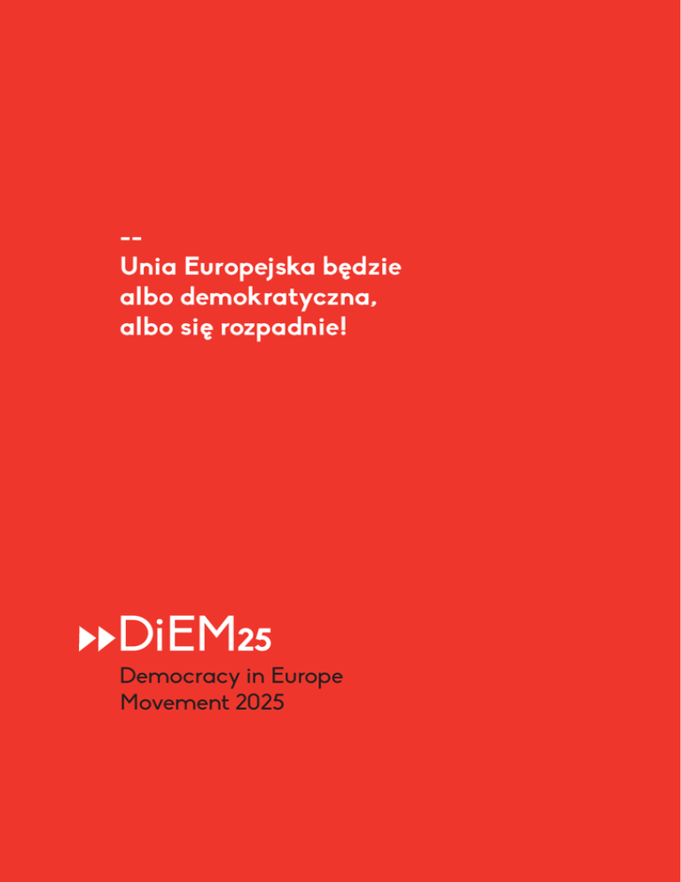 DiEM25 - Unia Europejska będzie albo demokratyczna, albo się rozpadnie! -Unia Europejska będzie albo demokratyczna, albo się rozpadnie! DiEM25 Democracy in Europe Movement 2025 DiEM25 - Unia Europejska będzie albo demokratyczna, albo się rozpadnie! MANIFEST DEMOKRATYZACJI EUROPY Ze wszystkich kłopotów z globalną konkurencją, migracją i terroryzmem, potęgi Europy przeraża tak naprawdę tylko jedna perspektywa: demokracja! Mówią w jej imieniu, ale tylko po to, aby jej przeczyć, egzorcyzmować ją i uciskać w praktyce. Próbują ją rozmyć i skorumpować, unikać jej i ją fingować, uzurpować i manipulować, aby wyssać z niej energię i do reszty ją obezwładnić. Bo rządy ludów Europy, władza w rękach demosu z prawdziwego zdarzenia, to wspólny koszmar: ● brukselskiej biurokracji (i ponad 10 000 jej lobbystów); ● skrytobójczych inspektoratów i Troiki, którą ci biurokraci uformowali wespół z innymi, niewybranymi przez nikogo technokratami z europejskich i międzynarodowych instytucji; ● potężnej Eurogrupy, nieumocowanej w żadnym prawie ani traktacie międzynarodowym; ● ratowanych przed bankructwem bankierów, dyrektorów funduszy inwestycyjnych i niezniszczalnych oligarchii, zawsze pogardliwych wobec mas i organizacji społecznych; ● partii politycznych, które odwołują się do liberalizmu, demokracji, wolności i solidarności, by potem u władzy zdradzać najbardziej podstawowe zasady; ● rządów, które podsycają okrutne nierówności społeczne poprzez prowadzenie samobójczej polityki austerity; ● medialnych magnatów, którzy z siania paniki uczynili sztukę i wspaniałe źródło dochodu oraz władzy; ● korporacji w spółce z tajnymi agencjami państwowymi, które inwestują w ludzki strach, ten sam, który pozwala wprowadzać niejawność i kulturę nadzoru, naginać opinię publiczną do ich woli. Unia Europejska była osiągnięciem wyjątkowym. Zgromadziła w pokoju mówiące różnymi językami i zanurzone w różnych kulturach społeczeństwa Europy. Udowodniła, że potrafimy stworzyć wspólne ramy praw człowieka dla całego kontynentu; kontynentu, który nie tak dawno temu był ojczyzną morderczego szowinizmu, rasizmu i barbarzyństwa. Unia Europejska miała szansę świecić w ciemnościach i wskazywać drogę, udowadniać, że pokój i solidarność można wyrwać ze szczęk konfliktu i bigoterii. Niestety, wspólne urzędy i wspólna waluta dzielą dziś Europejczyków i Europejki – ludzi jednoczących się dopiero od niedawna, pomimo różnych języków i kultur. Komitywa krótkowzrocznych polityków, ekonomicznie naiwnych urzędników i niekompetentnych finansowo „ekspertów” niewolniczo podporządkowuje się zarządzeniom finansowych i przemysłowych konglomeratów, pozbawiając tym Europę godności i wywołując groźne antyeuropejskie reakcje. Dumne społeczeństwa nastawia się przeciw sobie. Nacjonalizm, ekstremizm i rasizm znów budzą się do życia. DiEM25 - Unia Europejska będzie albo demokratyczna, albo się rozpadnie! W samym centrum naszej rozkładającej się Unii leży kłamstwo: jej mętny, odgórny tryb podejmowania decyzji przedstawiany jest jako „apolityczny”, „techniczny”, „proceduralny” i „neutralny”. Jego celem jest powstrzymanie większość Europejek i Europejczyków od sprawowania demokratycznej kontroli nad pieniądzem i finansami, warunkami pracy i ochroną środowiska. Ceną tego kłamstwa jest nie tylko koniec samej demokracji, ale i niewydolna polityka gospodarcza: ● jedna po drugiej, gospodarki strefy euro spychane są z urwiska rozpędzającej się austerity. Prowadzi to do wiecznej recesji w krajach słabszych gospodarczo i niskiego poziomu inwestycji w krajach starej Unii; ● jednocześnie wyklucza się kraje członkowskie pozostające poza unią walutową, zmuszając je do szukania partnerów i inspiracji gdzie indziej – tam, gdzie najprawdopodobniej czekają mętne, podważające suwerenność traktaty handlowe na poddańczych warunkach; ● po Europie rozpleniają się niespotykane od dawna: nierówności, mizantropia i beznadzieja. Dominują dwie przerażające możliwości: ● wycofać się do kokonów swoich państw narodowych; ● poddać się Brukseli – strefie wolnej od demokracji. Przecież musi być inna droga. I jest! Właśnie ta, której urzędowa „Europa” opiera się wszystkimi siłami swej autorytarnej mentalności. Fala demokracji! Nasz ruch, DiEM25, chce właśnie ją wywołać. Owa prosta, radykalna idea jest siłą sprawczą DiEM25: Zdemokratyzujmy UE! Bo Europa będzie albo demokratyczna, albo się rozpadnie! Nasz cel, zdemokratyzowanie Europy, jest jak najbardziej realistyczny. A na pewno nie jest bardziej utopijny od samego powstania Unii Europejskiej. W rzeczy samej, jest wręcz mniej utopijny od próby utrzymania przy życiu obecnej, antydemokratycznej, rozpadającej się Unii Europejskiej. Nasz cel, by zdemokratyzować Europę, jest paląco pilny. Demokratyzacja UE powinna zacząć się bezzwłocznie. Bez sprawnego działania nie uda się przebić przez zinstytucjonalizowany opór w rozsądnym czasie. Trzeba działać, nim Europa znajdzie się w sytuacji bez wyjścia. Dajemy sobie dekadę, a więc do roku 2025. Jeśli do tego czasu nie uda nam się uczynić Europy demokratyczną, jeśli jej autokratyczne siły skutecznie tę rodzącą się demokrację zduszą, wówczas Unia Europejska runie pod ciężarem swej własnej pychy; rozpadnie się na kawałeczki, a jej upadek pociągnie za sobą niewyobrażalne trudności – w Europie i poza nią. DiEM25 - Unia Europejska będzie albo demokratyczna, albo się rozpadnie! DLACZEGO EUROPA TRACI JEDNOŚĆ I DUSZĘ? W latach powojennych, gdy powstawał pierwszy projekt europejski, kultury narodowe odnawiano w duchu międzynarodowości, znikających granic, wspólnego dobrobytu i coraz wyższych standardów, które znów połączyły Europejczyków i Europejki. Lecz w samym sercu t
