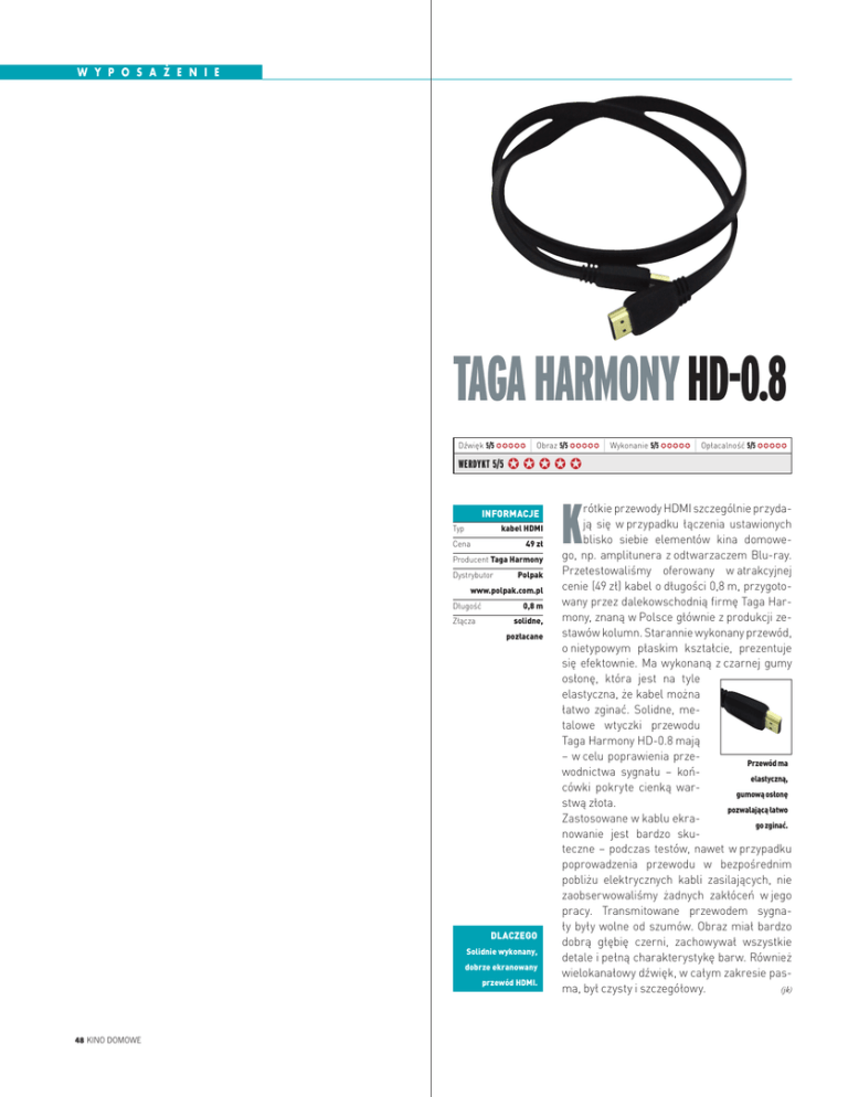 w y p o s a ż e n i e Taga Harmony HD-0.8 Dźwięk 5/5 Werdykt 5/5 ı Obraz 5/5 informacje kabel HDMI Typ 49 zł Cena Producent Taga Harmony Dystrybutor Polpak www.polpak.com.pl Długość Złącza 0,8 m solidne, pozłacane Dlaczego Solidnie wykonany, dobrze ekranowany przewód HDMI. 48 Kino Domowe K ı Wykonanie 5/5 ı Opłacalność 5/5 rótkie przewody HDMI szczególnie przydają się w przypadku łączenia ustawionych blisko siebie elementów kina domowego, np. amplitunera z odtwarzaczem Blu-ray. Przetestowaliśmy oferowany w atrakcyjnej cenie (49 zł) kabel o długości 0,8 m, przygotowany przez dalekowschodnią firmę Taga Harmony, znaną w Polsce głównie z produkcji zestawów kolumn. Starannie wykonany przewód, o nietypowym płaskim kształcie, prezentuje się efektownie. Ma wykonaną z czarnej gumy osłonę, która jest na tyle elastyczna, że kabel można łatwo zginać. Solidne, metalowe wtyczki przewodu Taga Harmony HD-0.8 mają – w celu poprawienia przePrzewód ma wodnictwa sygnału – końelastyczną, cówki pokryte cienką wargumową osłonę stwą złota. pozwalającą łatwo Zastosowane w kablu ekrago zginać. nowanie jest bardzo skuteczne – podczas testów, nawet w przypadku poprowadzenia przewodu w bezpośrednim pobliżu elektrycznych kabli zasilających, nie zaobserwowaliśmy żadnych zakłóceń w jego pracy. Transmitowane przewodem sygnały były wolne od szumów. Obraz miał bardzo dobrą głębię czerni, zachowywał wszystkie detale i pełną charakterystykę barw. Również wielokanałowy dźwięk, w całym zakresie pasma, był czysty i szczegółowy. (jk)
