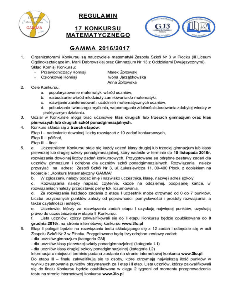 REGULAMIN 17 KONKURSU MATEMAT YCZ NEGO GAMMA 2016/2017 1. 2. 3. 4. 5. 6. Organizatorami Konkursu są nauczyciele matematyki Zespołu Szkół Nr 3 w Płocku (III Liceum Ogólnokształcące im. Marii Dąbrowskiej oraz Gimnazjum Nr 13 z Oddziałami Dwujęzycznymi). Skład Komisji Konkursu: - Przewodniczący Komisji Marek Żółtowski - Członkowie Komisji Iwona Jarząbkowska Anna Żółtowska Cele Konkursu: a. popularyzowanie matematyki wśród uczniów, b. rozbudzanie wśród młodzieży zamiłowania do matematyki, c. rozwijanie zainteresowań i uzdolnień matematycznych uczniów, d. pobudzanie twórczego myślenia, wspomaganie zdolności stosowania zdobytej wiedzy w praktycznym działaniu. Udział w Konkursie mogą brać uczniowie klas drugich lub trzecich gimnazjum oraz klas pierwszych lub drugich szkół ponadgimnazjalnych. Konkurs składa się z trzech etapów: Etap I – nadesłanie dowolnej liczby rozwiązań z 10 zadań konkursowych, Etap II – półfinał, Etap III – finał. a. Uczestnikiem Konkursu staje się każdy uczeń klasy drugiej lub trzeciej gimnazjum lub klasy pierwszej lub drugiej szkoły ponadgimnazjalnej, który nadeśle w terminie do 15 listopada 2016r. rozwiązania dowolnej liczby zadań konkursowych. Przygotowane są odrębne zestawy zadań dla uczniów gimnazjum i odrębne dla uczniów szkół ponadgimnazjalnych. Rozwiązania należy przysyłać na adres: Zespół Szkół Nr 3, ul. Łukasiewicza 11, 09-400 Płock, z dopiskiem na kopercie : „Konkurs Matematyczny GAMMA” b. W zgłoszeniu należy podać imię i nazwisko uczestnika, klasę, nazwę i adres szkoły. c. Rozwiązania należy napisać czytelnie, każde na oddzielnej, podpisanej kartce, w rozwiązaniach należy przedstawić pełny tok rozumowania. d. Za rozwiązanie każdego zadania z etapu I uczestnik może otrzymać od 0 do 7 punktów. Liczba przyznanych punktów zależy od poprawności, pomysłowości i prostoty rozwiązania, a także czytelności i estetyki. e. Uczniowie, którzy za rozwiązania zadań etapu I uzyskają najwięcej punktów, uzyskają prawo do uczestniczenia w etapie II Konkursu. f. Lista uczniów, którzy zakwalifikowali się do II etapu Konkursu będzie opublikowana do 8 grudnia 2016r. na stronie internetowej konkursu www.3lo.pl Etap II polegał będzie na rozwiązaniu testu składającego się z 12 zadań i odbędzie się w auli Zespołu Szkół Nr 3 w Płocku. Przygotowane będą trzy odrębne zestawy zadań: - dla uczniów gimnazjum (kategoria GM) - dla uczniów klasy pierwszej szkoły ponadgimnazjalnej (kategoria L1) - dla uczniów klasy drugiej szkoły ponadgimnazjalnej (kategoria L2) Informacja o miejscu i terminie podana zostanie na stronie internetowej konkursu www.3lo.pl Do etapu III – finału zakwalifikują się te osoby, które otrzymają największą ilość punktów w wyniku zsumowania punktów otrzymanych za I etap i II etap. Lista uczniów, którzy zakwalifikowali się do finału Konkursu będzie opublikowana w ciągu 2 tygodni od momentu przeprowadzenia testu na stronie internetowej konkursu www.3lo.pl 7. 8. 9. 10. 11. 12. Etap III będzie polegał na rozwiązaniu 5 zadań otwartych i odbędzie się w auli Zespołu Szkół Nr 3 w Płocku. Przygotowane będą trzy odrębne zestawy zadań: - dla uczniów gimnazjum (kategoria GM) - dla uczniów klasy pierwszej szkoły ponadgimnazjalnej (kategoria L1) - dla uczniów klasy drugiej szkoły ponadgimnazjalnej (kategoria L2) Zostaną zsumowane punkty zgromadzone przez uczestników Konkursu w trzech etapach i w ten sposób zostanie wyłoniona ostateczna lista laureatów i finalistów. Dla wszystkich finalistów przewidziane są dyplomy a dla najlepszych nagrody. Wręczenie nagród odbędzie się w Zespole Szkół Nr 3 w Płocku. O dokładnym terminie uczestnicy zostaną poinformowani. W II i III etapie dozwolone jest korzystanie z kalkulatorów, zabrania się korzystania z telefonów komórkowych. Dane osobowe podane przez Uczestnika przetwarzane będą wyłącznie na potrzeby organizacji Konkursu i nie będą udostępniane osobom trzecim. Wszystkie sporne kwestie rozstrzyga komisja Konkursu. Literatura: - M. Grabowski – Zbiór zadań dla uczniów uzdolnionych matematycznie, WSiP, - M. Grabowski, K. Szymański – Zbiór zadań dla uczniów szkół średnich o zainteresowaniach matematycznych, WSiP, - Z. Kracewicz – Zbiór zadań dla uczniów zainteresowanych matematyką, WSiP, - Z. Krawcewicz – Zadania dla uczniów klas V-VIII uzdolnionych matematycznie, WSiP, - K. Dworecka, Z.Kochanowski – Konkursy matematyczne, WSiP, - T. Gardiner – Matematyczne potyczki, Nowa Era - H.Pawłowski – Zadania z olimpiad matematycznych z całego świata, Tutor, - D. Pyrek, L. Kuczyńska – Zawody matematyczne – wybór, zestawy i propozycje zadań, WOM Kielce, - A. Cewe, M. Pawłowicz, H. Pawłowski – Kangur Europejski i inne międzynarodowe konkursy z matematyki, Podkowa, - P. Butrym – Matematyka w zadaniach praktycznych, Omega, - Sz. Jeleński – Śladami Pitagorasa, WsiP; Lilavati, WSiP - R. Rutkowski – Ciekawe zadania z algebry, WSiP, - R. Rutkowski – Ciekawe zadania z arytmetyki, WSiP, - W. Bednarek – Zadania dla uczniów lubiących matematykę, GWO, - Z. Bobiński, P. Nodzyński, M. Uscki – Koło matematyczne w gimnazjum, - K. Kamiński – Od ciekawostek do konkursu matematycznego, - Z. Narojczyk, J. Sterczewska, B. Kot – Konkursy matematyczne dla gimnazjum. 2