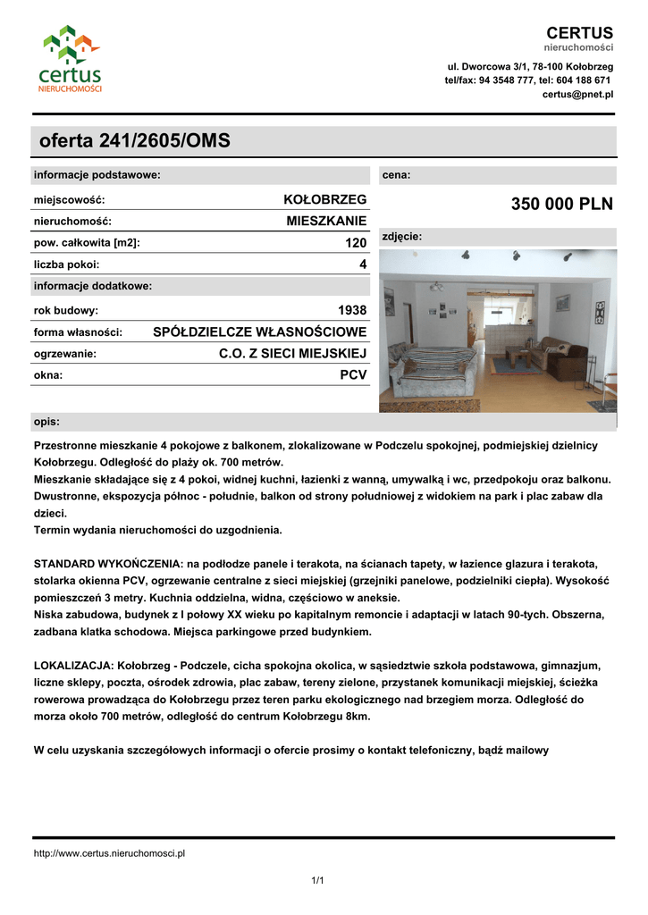 CERTUS nieruchomości ul. Dworcowa 3/1, 78-100 Kołobrzeg tel/fax: 94 3548 777, tel: 604 188 671 [email protected] oferta 241/2605/OMS informacje podstawowe: cena: miejscowość: KOŁOBRZEG nieruchomość: MIESZKANIE 120 pow. całkowita [m2]: 350 000 PLN zdjęcie: 4 liczba pokoi: informacje dodatkowe: 1938 rok budowy: forma własności: SPÓŁDZIELCZE WŁASNOŚCIOWE ogrzewanie: C.O. Z SIECI MIEJSKIEJ PCV okna: opis: Przestronne mieszkanie 4 pokojowe z balkonem, zlokalizowane w Podczelu spokojnej, podmiejskiej dzielnicy Kołobrzegu. Odległość do plaży ok. 700 metrów. Mieszkanie składające się z 4 pokoi, widnej kuchni, łazienki z wanną, umywalką i wc, przedpokoju oraz balkonu. Dwustronne, ekspozycja północ - południe, balkon od strony południowej z widokiem na park i plac zabaw dla dzieci. Termin wydania nieruchomości do uzgodnienia. STANDARD WYKOŃCZENIA: na podłodze panele i terakota, na ścianach tapety, w łazience glazura i terakota, stolarka okienna PCV, ogrzewanie centralne z sieci miejskiej (grzejniki panelowe, podzielniki ciepła). Wysokość pomieszczeń 3 metry. Kuchnia oddzielna, widna, częściowo w aneksie. Niska zabudowa, budynek z I połowy XX wieku po kapitalnym remoncie i adaptacji w latach 90-tych. Obszerna, zadbana klatka schodowa. Miejsca parkingowe przed budynkiem. LOKALIZACJA: Kołobrzeg - Podczele, cicha spokojna okolica, w sąsiedztwie szkoła podstawowa, gimnazjum, liczne sklepy, poczta, ośrodek zdrowia, plac zabaw, tereny zielone, przystanek komunikacji miejskiej, ścieżka rowerowa prowadząca do Kołobrzegu przez teren parku ekologicznego nad brzegiem morza. Odległość do morza około 700 metrów, odległość do centrum Kołobrzegu 8km. W celu uzyskania szczegółowych informacji o ofercie prosimy o kontakt telefoniczny, bądź mailowy http://www.certus.nieruchomosci.pl 1/1