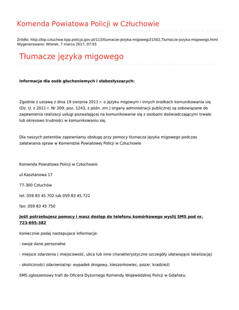 Komenda Powiatowa Policji w Człuchowie Źródło: http://bip.czluchow.kpp.policja.gov.pl/113/tlumacze-jezyka-migoweg/21502,Tlumacze-jezyka-migowego.html Wygenerowano: Wtorek, 7 marca 2017, 07:55 Tłumacze języka migowego Informacja dla osób głuchoniemych i słabosłyszących: Zgodnie z ustawą z dnia 19 sierpnia 2011 r. o języku migowym i innych środkach komunikowania się (Dz. U. z 2011 r. Nr 209, poz. 1243, z późn. zm.) organy administracji publicznej są zobowiązane do zapewnienia realizacji usługi pozwalającej na komunikowanie się z osobami doświadczającymi trwale lub okresowo trudności w komunikowaniu się. Dla naszych petentów zapewniamy obsługę przy pomocy tłumacza języka migowego podczas załatwiania spraw w Komendzie Powiatowej Policji w Człuchowie Komenda Powiatowa Policji w Człuchowie ul.Kasztanowa 17 77-300 Człuchów tel. 059 83 45 702 lub 059 83 45 722 fax: 059 83 45 750 Jeśli potrzebujesz pomocy i masz dostęp do telefonu komórkowego wyslij SMS pod nr. 723-695-382 koniecznie podaj nastepujace informacje: - swoje dane personalne - miejsce zdarzenia ( miejscowość, ulica lub inne charakterystyczne szczegóły ułatwiające lokalizację) - okoliczności zdarzenia(np: wypadek drogowy, kieszonkowiec, pozar, kradzież) SMS zgłoszeniowy trafi do Oficera Dyżurnego Komendy Wojewódzkiej Policji w Gdańsku. Osoby doświadczające trwale lub okresowo trudności w komunikowaniu się mają również możliwość nawiązania kontaktu z Policją poprzez skorzystanie z przesłania zgłoszenia przy pomocy poczty elektronicznej na adres mailowy Komendy Wojewódzkiej Policji w Gdańsku: [email protected], oraz na fax: 058 301 79 10. Zgodnie z art. 12 ust. 1 Ustawy o języku migowym i innych środkach komunikowania się, osoba uprawniona, która wyraża chęć skontaktowania się z komendą (w sprawach, dla których właściwa jest Policja), proszona jest o zgłoszenie tego faktu co najmniej na 3 dni robocze przed dniem skorzystania ze świadczenia (z wyłączeniem sytuacji nagłych). Świadczenie jest bezpłatne dla osoby uprawnionej, będącej osobą niepełnosprawną w rozumieniu ustawy z dnia 27 sierpnia 1997 r. o rehabilitacji zawodowej i społecznej oraz zatrudnianiu osób niepełnosprawnych (Dz. U. z 2011 r. Nr 127, poz. 721 i Nr 171, poz. 1016). Rejestr tłumaczy polskiego języka migowego (PJM), systemu językowo-migowego (SJM) i sposobu komunikowania się osób głuchoniewidomych (SKOGN) województwa pomorskiego dostępny jest na stronie Pomorskiego Urzędu Wojewódzkiego w Gdańsku. Metryczka Data publikacji 11.09.2015 Data modyfikacji 22.09.2015 Rejestr zmian Podmiot udostępniający informację: Biuletyn Informacji Publicznej Osoba wytwarzająca/odpowiadająca za informację: st.asp. Sławomir Gradek Osoba udostępniająca informację: st.asp. Sławomir Gradek Jednoosobowe Stanowisko ds. Prasowo-Informacyjnych Osoba modyfikująca informację: st.asp. Sławomir Gradek