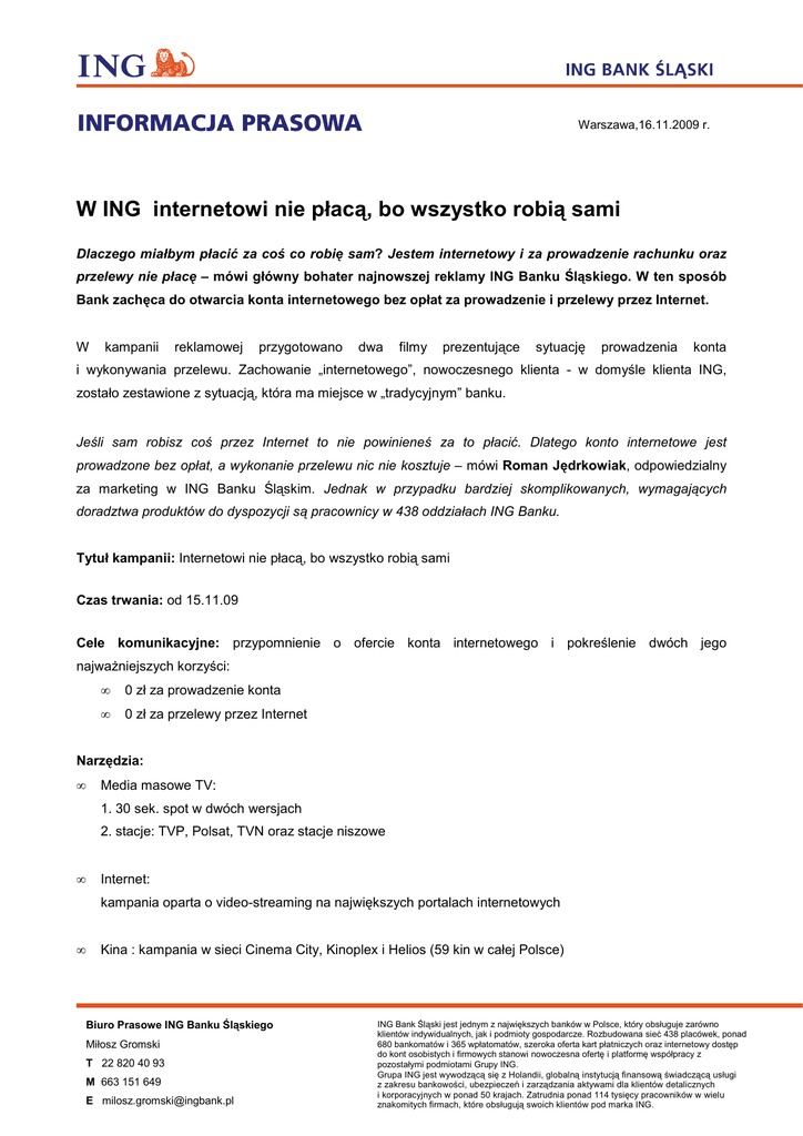Warszawa,16.11.2009 r. W ING internetowi nie płacą, bo wszystko robią sami Dlaczego miałbym płacić za coś co robię sam? Jestem internetowy i za prowadzenie rachunku oraz przelewy nie płacę – mówi główny bohater najnowszej reklamy ING Banku Śląskiego. W ten sposób Bank zachęca do otwarcia konta internetowego bez opłat za prowadzenie i przelewy przez Internet. W kampanii reklamowej przygotowano dwa filmy prezentujące sytuację prowadzenia konta i wykonywania przelewu. Zachowanie „internetowego”, nowoczesnego klienta - w domyśle klienta ING, zostało zestawione z sytuacją, która ma miejsce w „tradycyjnym” banku. Jeśli sam robisz coś przez Internet to nie powinieneś za to płacić. Dlatego konto internetowe jest prowadzone bez opłat, a wykonanie przelewu nic nie kosztuje – mówi Roman Jędrkowiak, odpowiedzialny za marketing w ING Banku Śląskim. Jednak w przypadku bardziej skomplikowanych, wymagających doradztwa produktów do dyspozycji są pracownicy w 438 oddziałach ING Banku. Tytuł kampanii: Internetowi nie płacą, bo wszystko robią sami Czas trwania: od 15.11.09 Cele komunikacyjne: przypomnienie o ofercie konta internetowego i pokreślenie dwóch jego najwaŜniejszych korzyści: • 0 zł za prowadzenie konta • 0 zł za przelewy przez Internet Narzędzia: • Media masowe TV: 1. 30 sek. spot w dwóch wersjach 2. stacje: TVP, Polsat, TVN oraz stacje niszowe • Internet: kampania oparta o video-streaming na największych portalach internetowych • Kina : kampania w sieci Cinema City, Kinoplex i Helios (59 kin w całej Polsce) Biuro Prasowe ING Banku Śląskiego Miłosz Gromski T 22 820 40 93 M 663 151 649 E [email protected] ING Bank Śląski jest jednym z największych banków w Polsce, który obsługuje zarówno klientów indywidualnych, jak i podmioty gospodarcze. Rozbudowana sieć 438 placówek, ponad 680 bankomatów i 365 wpłatomatów, szeroka oferta kart płatniczych oraz internetowy dostęp do kont osobistych i firmowych stanowi nowoczesna ofertę i platformę współpracy z pozostałymi podmiotami Grupy ING. Grupa ING jest wywodzącą się z Holandii, globalną instytucją finansową świadczącą usługi z zakresu bankowości, ubezpieczeń i zarządzania aktywami dla klientów detalicznych i korporacyjnych w ponad 50 krajach. Zatrudnia ponad 114 tysięcy pracowników w wielu znakomitych firmach, które obsługują swoich klientów pod marka ING. Konto Direct jest dostępne dla klientów indywidualnych oraz małych firm. W przypadku klientów indywidualnych bank nie pobiera opłat za transakcje przeprowadzane przez internet, telefon i bankomat/wpłatomat, zakładanie i prowadzenie konta, transakcje elektroniczne (przelewy 0 zł), wypłaty z bankomatów Euronetu i ING Banku Śląskiego, a takŜe za wpłaty we wpłatomatach. Opłaty za transakcje w oddziale – 9 zł za przelew, wpłatę/wypłatę pieniędzy. Zwolnienie z miesięcznej opłaty za kartę (2-3 zł) w przypadku transakcji bezgotówkowych w wysokości minimum 100 zł. W przypadku małych firm bank nie pobiera opłat za zakładanie i prowadzenie konta, wypłaty z bankomatów Euronetu i ING Banku Śląskiego. Opłata za przelew elektroniczny wynosi 1 zł, natomiast za przelew i wpłatę/wypłatę pieniędzy oddziale 10 zł Biuro Prasowe ING Banku Śląskiego Miłosz Gromski T 22 820 40 93 M 663 151 649 E [email protected] ING Bank Śląski jest jednym z największych banków w Polsce, który obsługuje zarówno klientów indywidualnych, jak i podmioty gospodarcze. Rozbudowana sieć 438 placówek, ponad 680 bankomatów i 365 wpłatomatów, szeroka oferta kart płatniczych oraz internetowy dostęp do kont osobistych i firmowych stanowi nowoczesna ofertę i platformę współpracy z pozostałymi podmiotami Grupy ING. Grupa ING jest wywodzącą się z Holandii, globalną instytucją finansową świadczącą usługi z zakresu bankowości, ubezpieczeń i zarządzania aktywami dla klientów detalicznych i korporacyjnych w ponad 50 krajach. Zatrudnia ponad 114 tysięcy pracowników w wielu znakomitych firmach, które obsługują swoich klientów pod marka ING.