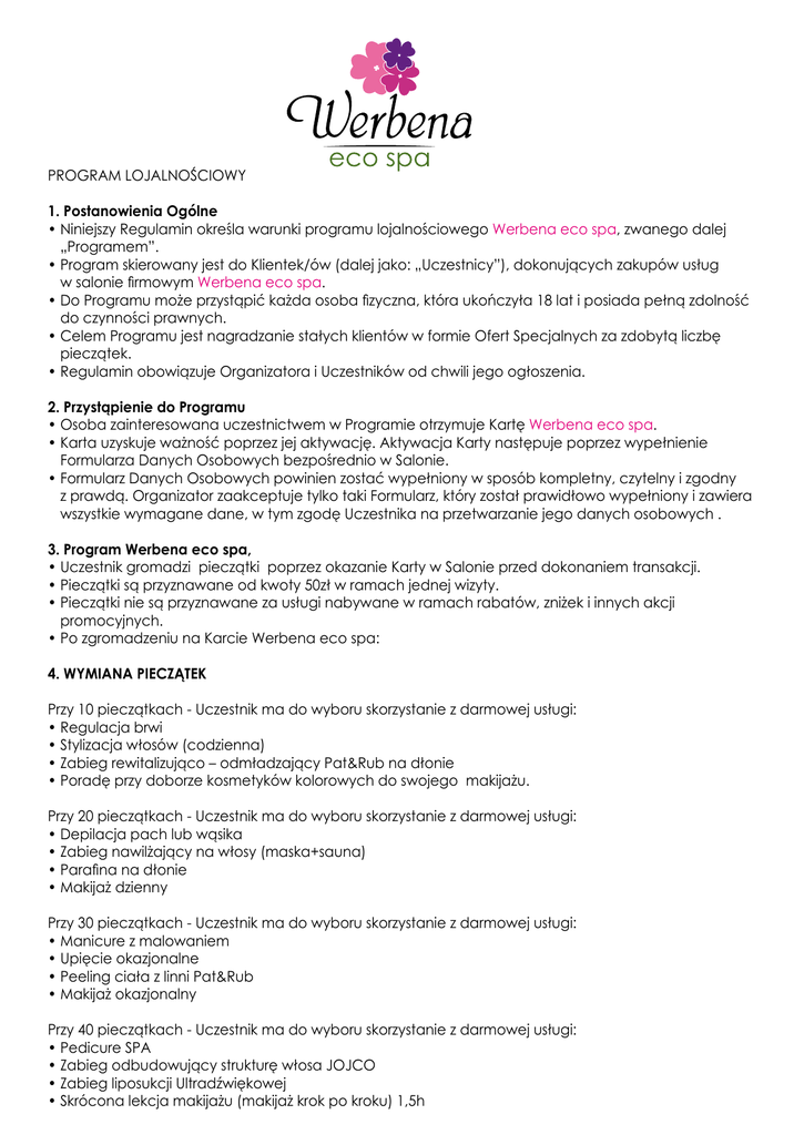 Program Lojalnościowy 1. Postanowienia Ogólne • Niniejszy Regulamin określa warunki programu lojalnościowego Werbena eco spa, zwanego dalej „Programem”. • Program skierowany jest do Klientek/ów (dalej jako: „Uczestnicy”), dokonujących zakupów usług w salonie firmowym Werbena eco spa. • Do Programu może przystąpić każda osoba fizyczna, która ukończyła 18 lat i posiada pełną zdolność do czynności prawnych. •Celem Programu jest nagradzanie stałych klientów w formie Ofert Specjalnych za zdobytą liczbę pieczątek. •Regulamin obowiązuje Organizatora i Uczestników od chwili jego ogłoszenia. 2. Przystąpienie do Programu • Osoba zainteresowana uczestnictwem w Programie otrzymuje Kartę Werbena eco spa. • Karta uzyskuje ważność poprzez jej aktywację. Aktywacja Karty następuje poprzez wypełnienie Formularza Danych Osobowych bezpośrednio w Salonie. • Formularz Danych Osobowych powinien zostać wypełniony w sposób kompletny, czytelny i zgodny z prawdą. Organizator zaakceptuje tylko taki Formularz, który został prawidłowo wypełniony i zawiera wszystkie wymagane dane, w tym zgodę Uczestnika na przetwarzanie jego danych osobowych . 3. Program Werbena eco spa, • Uczestnik gromadzi pieczątki poprzez okazanie Karty w Salonie przed dokonaniem transakcji. • Pieczątki są przyznawane od kwoty 50zł w ramach jednej wizyty. • Pieczątki nie są przyznawane za usługi nabywane w ramach rabatów, zniżek i innych akcji promocyjnych. • Po zgromadzeniu na Karcie Werbena eco spa: 4. WYMIANA PIECZĄTEK Przy 10 pieczątkach - Uczestnik ma do wyboru skorzystanie z darmowej usługi: • Regulacja brwi • Stylizacja włosów (codzienna) • Zabieg rewitalizująco – odmładzający Pat&Rub na dłonie • Poradę przy doborze kosmetyków kolorowych do swojego makijażu. Przy 20 pieczątkach - Uczestnik ma do wyboru skorzystanie z darmowej usługi: • Depilacja pach lub wąsika • Zabieg nawilżający na włosy (maska+sauna) • Parafina na dłonie • Makijaż dzienny Przy 30 pieczątkach - Uczestnik ma do wyboru skorzystanie z darmowej usługi: • Manicure z malowaniem • Upięcie okazjonalne • Peeling ciała z linni Pat&Rub • Makijaż okazjonalny Przy 40 pieczątkach - Uczestnik ma do wyboru skorzystanie z darmowej usługi: • Pedicure SPA • Zabieg odbudowujący strukturę włosa JOJCO • Zabieg liposukcji Ultradźwiękowej • Skrócona lekcja makijażu (makijaż krok po kroku) 1,5h 5. Karta Uczestnika • Karta ma charakter osobisty i nie może być użyczana bądź odstępowana innym osobom. • Pieczątki uzyskane przez Uczestnika w ramach Programu: (i) nie mogą być sprzedawane, przenoszone ani inaczej zbywane przez Uczestnika na rzecz innych osób, w tym pomiędzy kartami wydanymi przez Organizatora, (ii) nie mogą być wymieniane na gotówkę ani być przedmiotem innych czynności, z wyjątkiem tych określonych w niniejszym Regulaminie. 6. Utrata statusu Uczestnika Programu • Organizator może wykluczyć Uczestnika z Programu ze skutkiem natychmiastowym, jeżeli: Uczestnik nie przestrzega Regulaminu lub Uczestnik dostarczył nieprawdziwe dane lub podał się za inną osobę wobec Organizatora lub Uczestnik zażądał zaprzestania przetwarzania danych osobowych lub zgłosił sprzeciw w zakresie ich przetwarzania. 7. Zakończenie Programu • Organizator zastrzega sobie prawo zawieszenia lub zakończenia Programu w każdym momencie. W takim przypadku Organizator zobowiązany jest do umieszczenia odpowiedniej informacji w Salonie. Dodatkowo, w przypadku zawieszenia lub zakończenia Programu, Uczestnik otrzyma odpowiednią informację pocztą elektroniczną jeśli w formularzu Uczestnika znajdują się stosowne dane. • W przypadku zawieszenia lub zakończenia Programu Uczestnik będzie uprawniony do wymiany zebranych pieczątek na korzyści dostępne na podstawie niniejszego Regulaminu, na określonych w nim zasadach. • Fakt zawieszenia lub zakończenia Programu nie stanowi przesłanki dla wniesienia odwołania przez Uczestnika do Organizatora. 8. Zmiana Regulaminu Programu • Organizator uprawniony jest do wprowadzania zmian do Regulaminu w każdym momencie w czasie trwania Programu. • W przypadku wprowadzenia zmian do Regulaminu, Organizator udostępni ujednolicony tekst zmienionego Regulaminu w Salonie. Zmiana zasad Programu nie uprawnia Uczestnika do ubiegania się o odszkodowanie lub zadośćuczynienie w formie innej, niż wyraźnie przewidziana w Regulaminie. 9. Ochrona Danych Osobowych • W Formularzu Danych Osobowych Uczestnik wyraża dobrowolną zgodę na przetwarzanie swoich danych osobowych przez Organizatora w celach związanych z Programem. Zgoda zostaje udzielona poprzez podpisanie Formularza Zgłoszeniowego. Dane osobowe podlegają ochronie przewidzianej w Ustawie z dnia 29 sierpnia 1997 r. o ochronie danych osobowych i Polityce Ochrony Danych Osobowych Programu. 10. Akceptacja i realizacja Regulaminu • Niniejszy Regulamin będzie uznany za zaakceptowany przez Uczestnika poprzez złożenie własnoręcznego podpisu na Formularzu Danych • Organizator zwolniony jest z wszelkiej odpowiedzialności za jakiekolwiek konsekwencje, pośrednie lub bezpośrednie, ewentualnych nieprawidłowości w działaniu Programu. Organizator dołoży jednak wszelkich starań, aby Uczestnik, w razie nieprawidłowości w działaniu Programu, mógł skorzystać ze zgromadzonych Pieczątek.