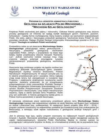 PROGRAM DLA JEDNOSTEK ADMINISTRACJI PUBLICZNEJ GEOLOGIA NA SZLAKACH POLSKI WSCHODNIEJ – "WSCHODNI SZLAK GEOLOGICZNY" Krajobraz Polski wschodniej jest piękny i róŜnorodny. Ciekawa historia geologiczna oraz złoŜone procesy geologiczne od milionów lat nadają kształt dzisiejszym górom, równinom, jeziorom, torfowiskom – kaŜdej formie morfologicznej, którą moŜemy znaleźć we wschodnich województwach Polski. Dla wielu, piękno i fascynująca przeszłość geologiczna "wschodniej ściany Polski" do dziś pozostaje nieodkryta. Dlatego Wydział Geologii Uniwersytetu Warszawskiego powołał w 2013 roku Program "Geologia na szlakach Polski wschodniej". Postawiliśmy sobie za cel stworzenie Wschodniego Szlaku Geologicznego pokazującego walory geoturystyczne i fascynującą przeszłość geologiczną wschodnich województw Polski. Jednym z przystanków na trasie tego Szlaku będzie projektowany obecnie Geopark "Kamienny Las". Jednak wschodnie rubieŜe naszego kraju mają znacznie większy potencjał przyciągania turystów zainteresowanych przeszłością geologiczną wschodniej Polski. Stworzenie tego ambitnego projektu nie będzie moŜliwe bez współpracy jednostek samorządowych [gmin, powiatów, Regionalnych Dyrekcji Ochrony Środowiska, Parków Narodowych i Krajobrazowych]. W naszym zamyśle jest, by to właśnie przedstawiciele gmin i powiatów, którzy najlepiej znają swoje tereny byli zaangaŜowani w rozwijanie tego Programu i zwiększanie atrakcyjności turystycznej swoich regionów. Jesteśmy przekonani, Ŝe po przygotowaniu przeprowadzonym przez pracowników Wydziału Geologii i Wydziału Zarządzania Uniwersytetu Warszawskiego m.in. w ramach Studiów Podyplomowych Zarządzanie Zasobami Przyrodniczymi i Geoturystyka, i przy stałym merytorycznym wsparciu, będą w stanie sprostać temu Projektowi. Warto przy tym podkreślić, iŜ historię geologiczną kaŜdej gminy w Polsce moŜna opowiedzieć w sposób fascynujący. W pierwszej, pilotaŜowej edycji zamierzamy przedstawić główne ramy Wschodniego Szlaku Geologicznego tnącego całe województwo lubelskie od okolic Mielnika nad Bugiem [woj. podlaskie] po obszar Lubaczowa [woj. podkarpackie]. W następnych fazach projektu [lata 2014 – 2016] – program zostanie rozszerzony na województwo podlaskie [po Suwalszczyznę] oraz podkarpackie [po Bieszczady], a istniejący szlak będzie rozbudowany o geologiczne atrakcje kolejnych gmin i powiatów. Jest to pierwszy tego typu, spójny program wzorowany na najlepszych trasach geologicznych Ameryki i Australii. Stworzenie jednolitego projektu turystycznego będzie niewątpliwie szansą dla, często niedoinwestowanych, obszarów Polski Wschodniej. Będzie to równieŜ szansa na przyciągnięcie i zatrzymanie turystów na dłuŜej, co w konsekwencji przełoŜy się na poprawienie bazy turystycznej, zwiększenie dochodów gmin i powiatów oraz zmniejszenie bezrobocia. Z takiego modelu turystycznego, opartego o walory przyrody nieoŜywionej, juŜ dziś z powodzeniem korzysta np. woj. Świętokrzyskie. Jesteśmy przekonani, Ŝe Wschodni Szlak Geologiczny stanie się wizytówką przyciągającą rzesze turystów. Na 2015 rok, planowana jest konferencja dla przedstawicieli wszystkich gmin, które włączą się w realizację Programu "Geologia na szlakach Polski Wschodniej", oraz gmin pragnących włączyć się w rozbudowę Wschodniego Szlaku Geologicznego. Będzie to doskonała platforma do wymiany doświadczeń, wstępnych podsumowań i zaplanowania działań na przyszłość. Finalnym efektem będzie wydanie przewodnika – "Wschodni Szlak Geologiczny", opisującego najciekawsze miejsca pod względem geoturystyki i georóŜnorodności. Zwracamy się z prośbą do władz wojewódzkich o aktywne włączenie się w realizację Projektu "Geologia na szlakach Polski Wschodniej", poprzez szerokie rozpropagowanie tej inicjatywy, głównie u pracowników gmin i powiatów [więcej informacji – http://www.geo.uw.edu.pl/studiapodyplomowe]. Tylko z Waszą pomocą udźwigniemy zakres tak ambitnego projektu. Prodziekan ds. studenckich Dr hab. prof. UW Anna Wysocka Więcej informacji: Wschodni Szlak Geologiczny [WSG]: Wydział Geologii, Uniwersytet Warszawski tel: (22) 55-40-400 [sekretariat] http://www.geo.uw.edu.pl/studia-podyplomowe Koordynator Projektu WSG: dr Zbigniew Remin [email protected] tel kom: 605-600-792 Koordynator projektu Wschodni Szlak Geologiczny dr Zbigniew Remin