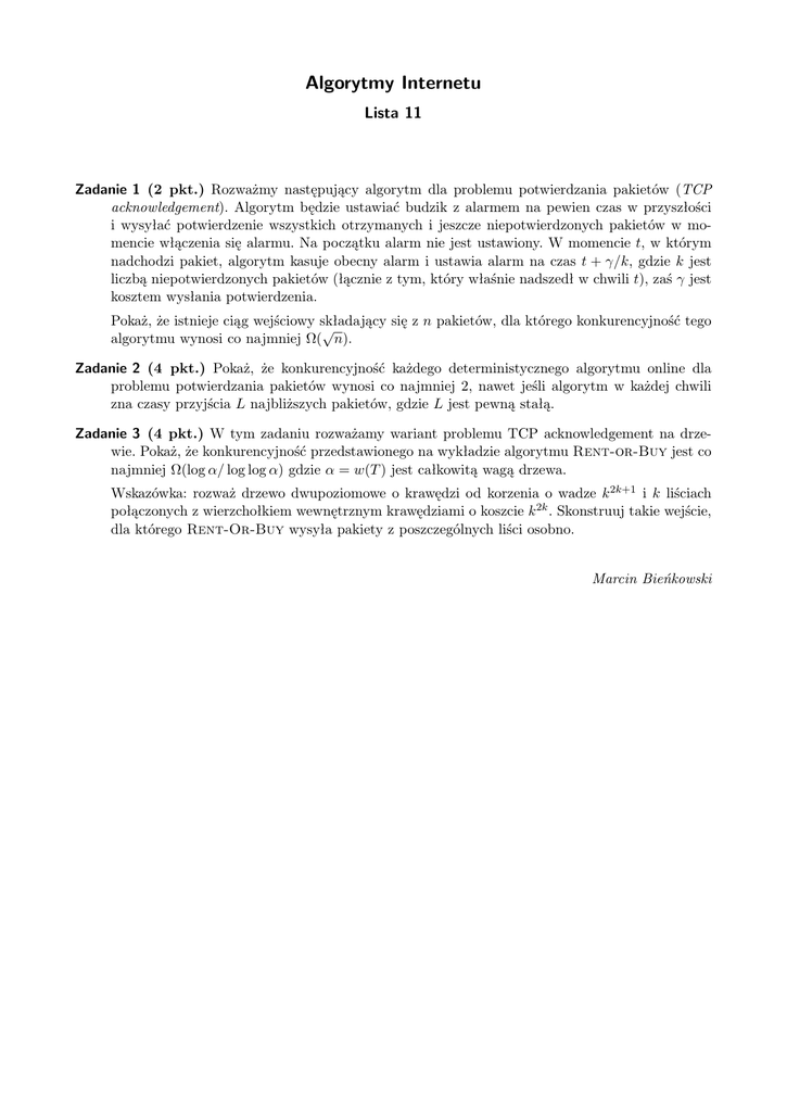 Algorytmy Internetu Lista 11 Zadanie 1 (2 pkt.) Rozważmy następujący algorytm dla problemu potwierdzania pakietów (TCP acknowledgement). Algorytm będzie ustawiać budzik z alarmem na pewien czas w przyszłości i wysyłać potwierdzenie wszystkich otrzymanych i jeszcze niepotwierdzonych pakietów w momencie włączenia się alarmu. Na początku alarm nie jest ustawiony. W momencie t, w którym nadchodzi pakiet, algorytm kasuje obecny alarm i ustawia alarm na czas t + γ/k, gdzie k jest liczbą niepotwierdzonych pakietów (łącznie z tym, który właśnie nadszedł w chwili t), zaś γ jest kosztem wysłania potwierdzenia. Pokaż, że istnieje ciąg wejściowy składający się z n pakietów, dla którego konkurencyjność tego √ algorytmu wynosi co najmniej Ω( n). Zadanie 2 (4 pkt.) Pokaż, że konkurencyjność każdego deterministycznego algorytmu online dla problemu potwierdzania pakietów wynosi co najmniej 2, nawet jeśli algorytm w każdej chwili zna czasy przyjścia L najbliższych pakietów, gdzie L jest pewną stałą. Zadanie 3 (4 pkt.) W tym zadaniu rozważamy wariant problemu TCP acknowledgement na drzewie. Pokaż, że konkurencyjność przedstawionego na wykładzie algorytmu Rent-or-Buy jest co najmniej Ω(log α/ log log α) gdzie α = w(T ) jest całkowitą wagą drzewa. Wskazówka: rozważ drzewo dwupoziomowe o krawędzi od korzenia o wadze k 2k+1 i k liściach połączonych z wierzchołkiem wewnętrznym krawędziami o koszcie k 2k . Skonstruuj takie wejście, dla którego Rent-Or-Buy wysyła pakiety z poszczególnych liści osobno. Marcin Bieńkowski