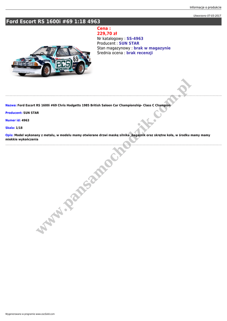 Informacje o produkcie Utworzono 07-03-2017 Ford Escort RS 1600i #69 1:18 4963 Cena : 229,70 zł om .p l Nr katalogowy : SS-4963 Producent : SUN STAR Stan magazynowy : brak w magazynie Średnia ocena : brak recenzji Nazwa: Ford Escort RS 1600i #69 Chris Hodgetts 1985 British Saloon Car Championship- Class C Champion .c Producent: SUN STAR dz ik Numer id: 4963 Skala: 1/18 w w w .p an sa m oc ho Opis: Model wykonany z metalu, w modelu mamy otwierane drzwi maskę silnika ,bagaznik oraz skrętne koła, w środku mamy mamy miekkie wykończenia Wygenerowano w programie www.oscGold.com
