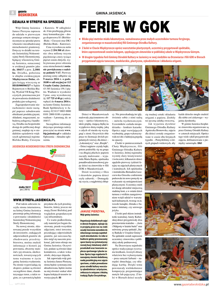 gazeta 8 BESKIDZKA GMINA JASIENICA Działka w Strefie na sprzedaż Wójt Gminy Jasienica Janusz Pierzyna zaprasza do udziału w pierwszym przetargu ustnym nieograniczonym na sprzedaż prawa własności niezabudowanej nieruchomości gruntowej. Dotyczy to działki na terenie Jasienickiej Niskoemisyjnej Strefy Ekonomicznej, będącej własnością Gminy Jasienica, oznaczonej w ewidencji gruntów jako dz. 104/17 o pow. 2,1801 ha. Działka, położona w obrębie ewidencyjnym Międzyrzecze Dolne, objęta księgą wieczystą nr BB1B/00050652/7 w Sądzie Rejonowym w Bielsku-Białej, Wydział VII Ksiąg Wieczystych, przeznaczona jest do prowadzenia działalności produkcyjno-usługowej. Zagospodarowanie nieruchomości może nastąpić poprzez zabudowanie obiektami produkcyjnymi, składami, magazynami, zabudową usługową i handlową. Działka ma bezpośredni dostęp do publicznej drogi gminnej, znajduje się w niedalekim sąsiedztwie większych aglomeracji regionu: Bielska-Białej, Cieszyna i Katowic. W odległości ok. 6 km przebiegają główne trasy komunikacyjne – droga ekspresowa S1 (Bielsko-Biała – Cieszyn) oraz DK1 (Bielsko-Biała – Katowice). Cena wywoławcza netto wynosi 2 354 508 zł (słownie: dwa miliony trzysta pięćdziesiąt cztery tysiące pięćset osiem złotych), wylicytowana przez oferenta cena nieruchomości zostanie powiększona o należny podatek VAT. Pierwszy przetarg ustny odbędzie się 9 marca 2016 r. o godz. 10.00 w sali sesyjnej nr 113 Urzędu Gminy Jasienica, 43-385 Jasienica 159, I piętro. Wadium w wysokości 5 proc. ceny wywoławczej (tj. 117 725 zł 40 gr.) należy wpłacić do 4 marca 2016 r. na konto Gminy Jasienica: Bank Spółdzielczy w Jasienicy 82 8117 0003 0000 0101 2000 0100 z tytułem: wadium – I przetarg, dz. nr 104/17. Szczegółowe informacje dotyczące przetargu należy przeczytać na stronie www. bip.jasienica.pl w zakładce Ogłoszenia – Aktualne ogłoszenia. Jasienicka Niskoemiosyjna strefa ekonomiczna Ferie w GOK ▶ Blisko pięć metrów miała lokomotywa, namalowana przez małych uczestników turnusu feryjnego, zorganizowanego w mazańcowickiej filii Gminnego Ośrodka Kultury. ▶ Z kolei w Chacie Międzyrzecze oprócz warsztatów plastycznych, uczestnicy przygotowali spektakle, które zaprezentowali swoim kolegom, spędzającym zimowisko w pobliskiej szkole w Międzyrzeczu Górnym. ▶ W drugim tygodniu ferii Gminny Ośrodek Kultury w Jasienicy w swej siedzibie na Drzewiarzu i filii GOK w Bierach przygotował zajęcia taneczne, modelarskie, plastyczne, rękodzielnicze i składania origami. Dzieci w Mazańcowicach malowały pięciometrowe obrazy – oprócz lokomotywy, także grupkę, mającą chętkę na wyjątkowo dużą rzepkę, jaką z całych sił starała się wyciągnąć z ziemi. Oczywiście obie prace to ilustracje dwóch popularnych wierszy dla dzieci – „Lokomotywy” oraz „Rzepki”. – Dzieci najpierw czytały bajki, potem podzieliły się na grupy i na długiej płachcie papieru zaczęły malowanie – wyjaśniła Maria Rajska, opiekunka ponaddwudziestoosobowej grupy dzieci na zimowisku w filii GOK w Mazańcowicach. Dzień wcześniej z filcu i skrawków papieru dzieci szyły zabawki. – Domagały się szycia, a najgłośniej chłop- działka 104/17 pow. 2,1801 ha www.strefa.jasienica.pl Pod takim adresem ruszyła strona internetowa, na której Gmina Jasienica prezentuje pełną informację o powstaniu i działalności Jasienickiej Niskoemisyjnej Strefy Ekonomicznej. Na nowej stronie, skierowanej przede wszystkim do inwestorów, szukających odpowiednich gruntów do zbudowania przedsiębiorstwa, można znaleźć informacje o historii jej powstania, obszerny materiał z jej otwarcia, okolicznościach, towarzyszących temu ważnemu w życiu gminy Jasienica wydarzeniu. Na stronie wypowiadają się eksperci, podane są również szczegółowe dane, charakteryzujące teren, a także region, co z pewnością będzie LUTY 2016 przydatne dla tych przedsiębiorców, którzy jeszcze nie znają Ziemi Bielskiej pod względem gospodarczym i jej infrastruktury. Co warte podkreślenia, cały materiał jest bogato ilustrowany, przede wszystkim zdjęciami, toteż inwestor, poszukujący odpowiednich gruntów, już zawczasu będzie mógł się naocznie przekonać, jaki teren oferuje mu Gmina Jasienica. Oczywiście, podane są również dane kontaktowe, a także wskazówki, dotyczące dojazdu. Jak zapowiada wójt gminy Jasienica Janusz Pierzyna, strona będzie systematycznie aktualizowana, będzie można na niej również szukać ofert kupna kolejnych terenów inwestycyjnych. (R) Janusz Pierzyna, Wójt gminy Jasienica: Organizacja dodatkowych zajęć w okresie feryjnym, wpisuje się w przyjętą przez nas na stałe zasadę tworzenia warunków do właściwego rozwoju najmłodszych mieszkańców. Co roku w budżecie gminy przeznaczamy spore kwoty na systematyczny rozwój bazy lokalowej szkół i przedszkoli oraz tworzenie zaplecza sportowego i placów zabaw. Oprócz tego regularnie finansujemy również dodatkową naukę pozalekcyjną oraz zajęcia sportowe, a także prowadzone przez ośrodki kultury warsztaty rękodzielnicze i artystyczne, zwłaszcza te związane z lokalną tradycją Śląska Cieszyńskiego. cy. Nie przeszkadzają im igły, świetnie sobie z nimi radzą – mówiła wychowawczyni. Uczestników czekała niespodzianka – konkurs karaoke. Oprócz zajęć rozwijających wyobraźnię, grupa wykorzystywała też dni z ładniejszą pogodą na spacery. Z kolei w pomieszczeniach Chaty Międzyrzecze, filii Gminnego Ośrodka Kultury w Jasienicy, której regionalny wystrój służy kreatywności i twórczości, kilkanaście dzieci spędziło pierwszy tydzień feryjny na zajęciach plastycznych i teatralnych. Ich opiekunka i instruktorka Bernadeta Łuszczewska-Gruszka codziennie podsuwała im nowe pomysły na wykazanie się umiejętnościami plastycznymi. Uczestnicy mieli też okazję odwiedzić miejscową stadninę koni, a w os