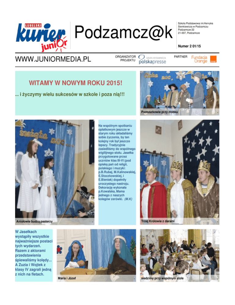Szkoła Podstawowa im.Henryka Sienkiewicza w Podzamczu Podzamcze 22 21-007, Podzamcze Podzamcz@k Numer 2 01/15 WWW.JUNIORMEDIA.PL ORGANIZATOR PROJEKTU PARTNER WITAMY W NOWYM ROKU 2015! ... i życzymy wielu sukcesów w szkole i poza nią!!! Pastuszkowie przy żłóbku . Trzej Królowie z darami . siedzimy przy wspólnym stole . Na wspólnym spotkaniu opłatkowym jeszcze w starym roku składaliśmy sobie życzenia, by ten kolejny rok był jeszcze lepszy. Tradycyjnie zasiedliśmy do wspólnego wigilijnego stołu. Jasełka przygotowane przez uczniów klas III-VI (pod opieką pań od religii, polskiego i muzyki: p.B.Rubaj, M.Kalinowskiej, E.Stoczkowskiej, i E.Bieniek) dopełniły uroczystego nastroju. Dekorację wykonała p.Kowalska, Mama jednego z naszych kolegów zerówki. (M.K) . Aniołowie budzą pasterzy W Jasełkach wystąpiły wszystkie najważniejsze postaci tych wydarzeń. Razem z aktorami przedstawienia śpiewaliśmy kolędy... A Zuzia i Wojtek z klasy IV zagrali jedną z nich na fletach. Maria i Józef . Kurier Lubelski | Numer 2 01/2015 | Strona 2 www.kurierlubelski.pl Podzamcz@k WWW.JUNIORMEDIA.PL NA SPORTOWO czyli: SPORT W SZKOLE I POZA SZKOŁĄ ZAWODY MIKOŁAJKOWE W TENISA STOŁOWEGO …są już szkolną tradycją i odbywają się w grudniu, a głównym trofeum jest Puchar Dyrektora szkoły. Organizatorem zawodów jest p. Michał Chyliński. Dziewczęta rywalizowały w jednej grupie: każda z każdą. Bezkonkurencyjna była Maja Pawłowska, wygrywając 3 z czterech meczy i zdobywając 9 pkt. Walka była bardzo wyrównana, bo o zdobyciu drugiego miejsca zdecydowały tzw. małe punkty, gdyż aż 3 zawodniczki miały za sobą dwa wygrane mecze: Jowita Wójtowicz, Zuzia Celejewska i Ola Serafin (w takiej też kolejności zakończyły rywalizację). Piąte miejsce zdobyła Weronika Serafin (z 3pkt i jednym wygranym pojedynkiem). Chłopcy rozgrywali mecze systemem pucharowym i w pierwszej rundzie mogli wylosować wolny los. Do półfinałów dotarli Patryk Bogacki i Dominik Dyzma, w drugim półfinale spotkali się Łukasz Pawlak i Karol Gałgan. W kolejnej rundzie mecz o 3 miejsce rozegrali Dominik i Karol - który wygrał ten pojedynek. W finale zmierzyli się Łukasz z Patrykiem, lepszym okazał się Łukasz Pawlak i to on zdobył Puchar Dyrektora szkoły. Dla wszystkich uczestników zawodów przygotowane były słodkie upominki. Trzy pierwsze miejsca nagrodzono pucharami i dyplomami, które zostały zawodnikom wręczone przez panią Dyrektor. (M.Ch) Maja . . Łukasz NA LODOWISKU Nasze sprawozdanie: Odbyliśmy lekcję w-f na lodowisku, a na języku polskim doskonaliliśmy formę wypowiedzi pisemnej sprawozdanie; jako, że stale ćwiczymy się w pisaniu (przed nieuchronnie zbliżającym się Sprawdzianem). Oto, co napisaliśmy: We wtorek 13 stycznia nasza klasa pojechała z wychowawczynią p. Barbarą Pać do Lublina. Celem wyjazdu była lekcja jazdy na łyżwach na lodowisku ICEMANIA. Środkiem transportu był pociąg, dalej ze stacji szliśmy pieszo. Na miejscu część z nas pożyczyła łyżwy, inni mieli swoje. Po zapłaceniu za bilety udaliśmy się do szatni, a następnie całą grupą weszliśmy na lód. Przez półtorej godziny doskonaliliśmy swoje umiejętności łyżwiarskie. Choć nie był to nasz pierwszy raz na łyżwach, nikt nie uniknął upadku na lód, a niektórzy zaliczyli ich kilka. Po skończonej lekcji udaliśmy się do szatni i oddaliśmy wypożyczony sprzęt. Potem spacerkiem przeszliśmy do centrum handlowego Plaza. Tam wyjechaliśmy windą na ostatnie piętro, żeby pójść do KFC na obiad. Spożycie posiłku zajęło nam ok. 45 minut. Następnie ruszyliśmy w kierunku stacji kolejowej. Nasza droga wiodła przez park. Pociąg, którym mieliśmy wrócić do domu odjechał planowo o 13.33. Podróż trwała 20 minut. Na stacji w Podzamczu pożegnaliśmy się w panią i każdy poszedł w swoją stronę. Wyjazd na lodowisko był udany, gdyż nie tylko mogliśmy doskonalić nasze sportowe umiejętności, ale i miło spędzić czas ze sobą poza szkołą. (klasa VI) www.kurierlubelski.pl Kurier Lubelski | Numer 2 01/2015 | Strona 3 Podzamcz@k WWW.JUNIORMEDIA.PL Nasi uczniowie pięknie recytują... Jest nauka, są sukcesy... NAUKOWY SUKCES SZKOŁY! Łukasz Pawlak uczeń kl. VI zakwalifikował się do etapu wojewódzkiego kuratoryjnego konkursu z historii, do którego przygotował się pod kierunkiem p.Anny Ciechan. Przypomnijmy, że w tym roku mieliśmy 3 uczniów w etapach okręgowych konkursów przedmiotowych: 1 w ortograficznym i 2 w historycznym. Łukasz brał udział w obu. Teraz trzymamy kciuki za sukces w III etapie! . Ola i Andżelika Pod koniec listopada nasze uczennice jako wzięły udział w Powiatowym Konkursie Recytatorskim Poezji Anny Kamieńskiej, jaki co roku odbywa się w świdnickiej Bibliotece Powiatowej jej imienia. Ola Pawłowska zajęła III miejsce, Andżelika Gałgan i Maja Pawłowska - otrzymały wyróżnienia w swoich kategoriach. Do konkursu przygotowała je p.Anna Wilczyńska. . Maja, Ola, Andżelika Ciekawe lekcje muzyki Od wielu lat nasza szkoła współpracuje z Filharmonią Lubelską. Kilka razy do roku przyjeżdżają do nas filharmonicy z interesującymi zajęciami muzycznymi; poznajemy instrumenty, poszerzamy wiedzę o sławnych kompozytorach i epokach, w jakich żyli. Aktywnie włączamy się w te lekcje... dziecięcy akompaniament . aktywnie słychamy... . Kurier Lubelski | Numer 2 01/2015 | Strona 4 www.kurierlubelski.pl Podzamcz@k WWW.JUNIORMEDIA.PL P O M A G A M Y PRZED FERIAMI.. . Logo akcji "Pomóż dzieciom przetrwać zimę" Każdego roku bierzemy w niej udział i to coraz efektywniej. Tym razem prawie 90 kg darów zebraliśmy w akcji. Okazją do . . . . przekazania prezentów potrzebującym stała się dyskoteka andrzejkowa, gdzie biletem ŚWIĘTO BABCI I DZIADKA wstępu były słodycze. Samorząd Uczniowski Na naszych drogich gości zawsze w tym dniu zorganizował loterię fantową. Za uzyskane czekają wnuki z pięk