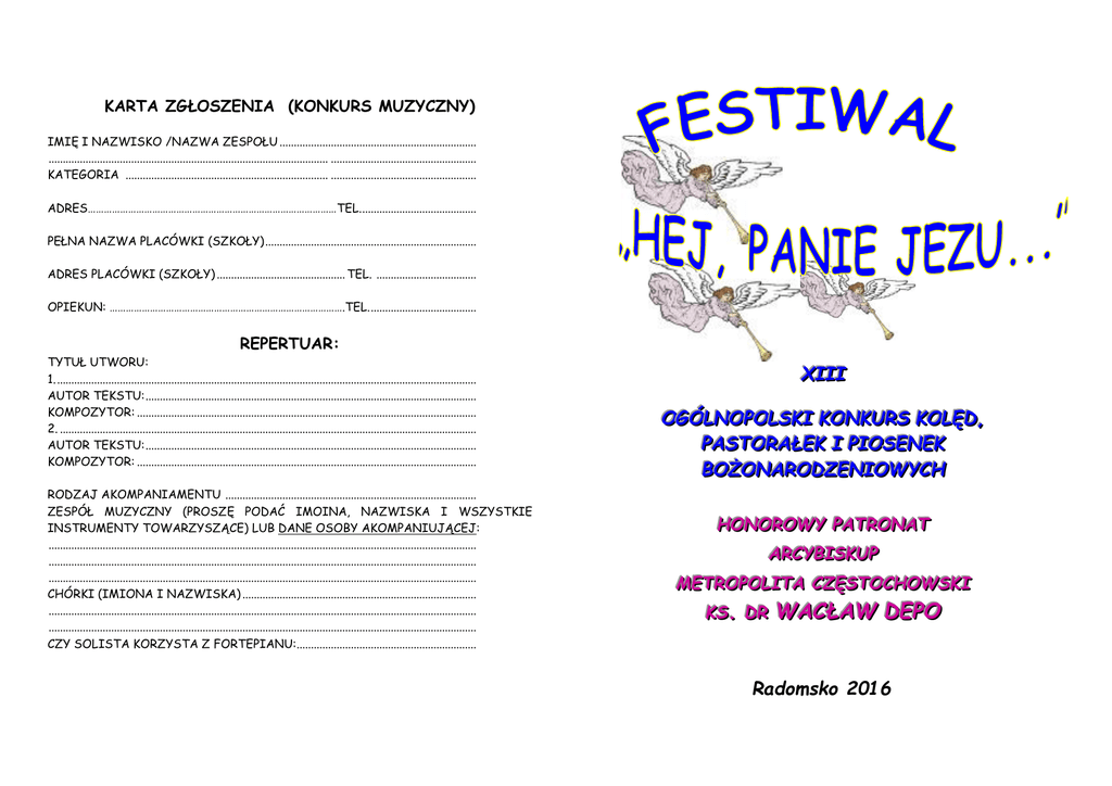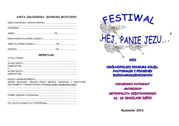 KARTA ZGŁOSZENIA (KONKURS MUZYCZNY) IMIĘ I NAZWISKO /NAZWA ZESPOŁU ..................................................................... .................................................................................................. ................................................... KATEGORIA ....................................................................... ................................................... ADRES…………………………………………………………………………………TEL......................................... PEŁNA NAZWA PLACÓWKI (SZKOŁY) .......................................................................... ADRES PLACÓWKI (SZKOŁY) ............................................. TEL. ................................... OPIEKUN: …………………………………………………………………………….TEL. ..................................... REPERTUAR: TYTUŁ UTWORU: 1. ................................................................................................................................................... AUTOR TEKSTU: .................................................................................................................... KOMPOZYTOR: ....................................................................................................................... 2. .................................................................................................................................................. AUTOR TEKSTU: .................................................................................................................... KOMPOZYTOR: ....................................................................................................................... RODZAJ AKOMPANIAMENTU ........................................................................................ ZESPÓŁ MUZYCZNY (PROSZĘ PODAĆ IMOINA, NAZWISKA I WSZYSTKIE INSTRUMENTY TOWARZYSZĄCE) LUB DANE OSOBY AKOMPANIUJĄCEJ: ...................................................................................................................................................... ...................................................................................................................................................... ...................................................................................................................................................... CHÓRKI (IMIONA I NAZWISKA) .................................................................................. ...................................................................................................................................................... ...................................................................................................................................................... CZY SOLISTA KORZYSTA Z FORTEPIANU:............................................................... X XIIIIII O OG GÓ ÓLLN NO OPPO OLLS SKKII KKO ON NKKU UR RS S KKO OLLĘĘD D,, PPA AS ST TO OR RA AŁŁEEKK II PPIIO OS SEEN NEEKK BBO OŻ ŻO ON NA AR RO OD DZ ZEEN NIIO OW WYYCCH H H HO ON NO ORRO OW WYY PPA AT TRRO ON NA AT T A ARRCCYYBBIIS SKKU UPP M MEET TRRO OPPO OLLIIT TA A CCZ ZĘĘS ST TO OCCH HO OW WS SKKII KKS S.. D DRR W WA ACCŁ ŁA AW WD DE EPPO O Radomsko 2016 6. Przy zgłoszeniu należy podać skład zespołu towarzyszącego i wokalnego (chórki) oraz instrumenty. 7. Uczestnicy przyjeżdżają na koszt własny. 8. Każda placówka może zgłosić maksymalnie trzech uczestników, w danej kategorii. 9. Wykonawców oceniać będzie jury powołane przez organizatorów. 10. Oceniając solistów jury bierze pod uwagę: walory wokalne, intonację głosu, dykcję, prezentację sceniczną, 1akompaniament, choreografię. 11. Organizatorzy zapewniają sprzęt nagłaśniający oraz fortepian. 12. Przesłuchania konkursowe rozpoczną się 25 stycznia 2016r. o godz. 9.00 w Miejskim Domu Kultury w Radomsku. Ogłoszenie wyników konkursu, rozdanie nagród i koncert laureatów odbędzie się 31 stycznia (niedziela) 2016r. po Mszy św. o. godz. 11.30 w Kolegiacie p.w. Św. Lamberta w Radomsku. ORGANIZATORZY: Publiczna Szkoła Podstawowa nr 3 w Radomsku, Zespół Szkolno-Gimnazjalny nr 1 w Radomsku, Zespół Szkolno – Gimnazjalny nr 2 w Radomsku, Zespół Szkolno-Gimnazjalny nr 7 w Radomsku, Miejski Dom Kultury w Radomsku, Kolegiata św. Lamberta w Radomsku CELE: Zachęcanie do wspólnego kolędowania; Rozbudzanie zainteresowań muzycznych; Integracja dzieci i młodzieży poprzez wspólne kolędowanie; Wpływ na rozwój zdolności muzycznych dzieci i młodzieży. REGULAMIN KONKURSU: 1. Uczestnicy konkursu przygotowują dwa utwory z repertuaru: kolęd, pastorałek i piosenek Bożonarodzeniowych. Podczas konkursu prezentowany jest jeden utwór wybrany przez wykonawców. Na ewentualne życzenie jury, wykonawca prezentuje drugi utwór. 2. Czas prezentacji nie może przekroczyć sześć minut. 3. Uczestnicy konkursu oceniani będą w kategoriach: soliści 6 – 9 lat (klasy O – III szkoły podstawowej), soliści 10 –12 lat (klasy IV- VI szkoły podstawowej), soliści 13 – 15 lat (klasy I – III gimnazjum) Zespoły – kategoria „OPEN” 4 .Uczestnicy konkursu mogą wystąpić z towarzyszeniem własnego zespołu muzycznego lub akompaniatora (np. uczeń, nauczyciel). 5. W kategorii „zespoły” nie można korzystać z półplaybacku. ZGŁOSZENIA NALEŻY SKŁADAĆ DO 29 grudnia 2015 r. na adres: [email protected] lub do Sekretariatu Zespołu Szkolno Gimnazjalnego nr 1 w Radomsku Bliższych informacji udzielają:: Zofia Chybalska (tel. 692223205) i Arkadiusz Chybalski (tel. 509534297). Po zgłoszeniu uczestników proszę czekać na potwierdzenie. 1 Promowany jest akompaniament wykonywany na żywo