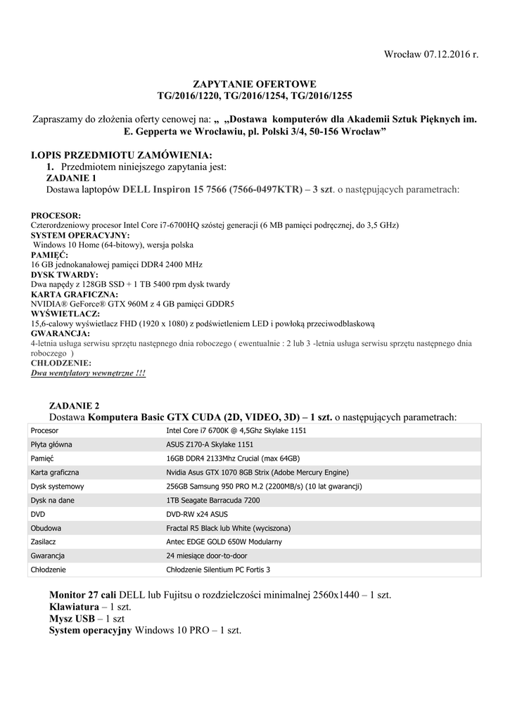 Wrocław 07.12.2016 r. ZAPYTANIE OFERTOWE TG/2016/1220, TG/2016/1254, TG/2016/1255 Zapraszamy do złożenia oferty cenowej na: „ ,,Dostawa komputerów dla Akademii Sztuk Pięknych im. E. Gepperta we Wrocławiu, pl. Polski 3/4, 50-156 Wrocław” I.OPIS PRZEDMIOTU ZAMÓWIENIA: 1. Przedmiotem niniejszego zapytania jest: ZADANIE 1 Dostawa laptopów DELL Inspiron 15 7566 (7566-0497KTR) – 3 szt. o następujących parametrach: PROCESOR: Czterordzeniowy procesor Intel Core i7-6700HQ szóstej generacji (6 MB pamięci podręcznej, do 3,5 GHz) SYSTEM OPERACYJNY: Windows 10 Home (64-bitowy), wersja polska PAMIĘĆ: 16 GB jednokanałowej pamięci DDR4 2400 MHz DYSK TWARDY: Dwa napędy z 128GB SSD + 1 TB 5400 rpm dysk twardy KARTA GRAFICZNA: NVIDIA® GeForce® GTX 960M z 4 GB pamięci GDDR5 WYŚWIETLACZ: 15,6-calowy wyświetlacz FHD (1920 x 1080) z podświetleniem LED i powłoką przeciwodblaskową GWARANCJA: 4-letnia usługa serwisu sprzętu następnego dnia roboczego ( ewentualnie : 2 lub 3 -letnia usługa serwisu sprzętu następnego dnia roboczego ) CHŁODZENIE: Dwa wentylatory wewnętrzne !!! ZADANIE 2 Dostawa Komputera Basic GTX CUDA (2D, VIDEO, 3D) – 1 szt. o następujących parametrach: Procesor Intel Core i7 6700K @ 4,5Ghz Skylake 1151 Płyta główna ASUS Z170-A Skylake 1151 Pamięć 16GB DDR4 2133Mhz Crucial (max 64GB) Karta graficzna Nvidia Asus GTX 1070 8GB Strix (Adobe Mercury Engine) Dysk systemowy 256GB Samsung 950 PRO M.2 (2200MB/s) (10 lat gwarancji) Dysk na dane 1TB Seagate Barracuda 7200 DVD DVD-RW x24 ASUS Obudowa Fractal R5 Black lub White (wyciszona) Zasilacz Antec EDGE GOLD 650W Modularny Gwarancja 24 miesiące door-to-door Chłodzenie Chłodzenie Silentium PC Fortis 3 Monitor 27 cali DELL lub Fujitsu o rozdzielczości minimalnej 2560x1440 – 1 szt. Klawiatura – 1 szt. Mysz USB – 1 szt System operacyjny Windows 10 PRO – 1 szt. ZADANIE 3 Dostawa komputera Lenovo Lenovo Z51-70 (80K601BUPB) Biało-srebrny – 1 szt. o następujących parametrach: Gwarancja: 2 lata w serwisie zewnętrznym przekątna ekranu LCD 15.6 cali nominalna rozdzielczość LCD 1920 x 1080 pikseli powłoka ekranu antyrefleksyjna procesor Intel® Core™ i7 model procesora i7-5500U (2.4 GHz, 3.0 GHz Turbo, 4 MB Cache) ilość rdzeni 2 szt. wielkość pamięci RAM 8 GB typ zastosowanej pamięci RAM DDR3 (1600 MHz) pamięć RAM rozszerzalna do 16 GB rodzaj dysku twardego hybrydowy (magnetyczny + flash) ilość pamięci flash dysku hybrydowego 8 GB pojemność dysku magnetycznego 1000 GB napęd optyczny DVD+/-RW DL dedykowana grafika tak karta graficzna AMD Radeon R9 M375 pamięć karty graficznej 4096 MB ocena wydajności chipsetu karty graficznej 370 pkt typ akumulatora 4-komorowy karta dźwiękowa stereo łączna moc wbudowanych głośników 3 W (2x 1.5W JBL) SD SDHC czytnik kart pamięci MMC SDXC LAN 1 Gbps WiFi IEEE 802.11b/g/n/ac komunikacja Bluetooth Intel WiDi 1 x USB interfejsy 2 x USB 3.0 dodatkowe wyposażenie/funkcjonalność kamera HD zainstalowany system operacyjny Windows 10 Home szerokość 384 mm głębokość 265 mm wysokość 24.6 mm waga 2.3 kg materiał obudowy tworzywo sztuczne srebrny kolor obudowy biały stylistyka pokrywy biała kolor ramki wyświetlacza LCD srebrny kolor klawiatury czarny kolor wokół klawiatury srebrny podświetlana klawiatura tak MYSZY bezprzewodowej - 2 Szt. Nazwa MODECOM Mysz komputerowa MC-WM7 (M-MC0WM7-100) Sensor : Optyczny Rozdzielczość: (DPI)800/1600 DPI Interfejs: USB Odbiornik typu Nano Wymiary (D*S*W):92.7*58.4*34mm Zasilanie 2x bateria AAA (3V@15mA) Obsługiwane systemy operacyjne: Windows:2000/XP/Win7-8/Vista; Linux Mac OS X Torba na laptopa czarna - kompatybilna z laptopami z 15- 16 ", zalecany rozmiar to 15,6".Uchwyt wytrzymały, pasek na ramię z możliwością regulacji - 1 szt. 2. Warunkiem złożenia oferty jest możliwość wystawienia przez Wykonawcę faktury VAT. 3. Dopuszczamy składanie ofert częściowych tylko na ZADANIE 1 lub ZADANIE 2 lub ZADANIE 3 4. Wykonawcy podają ceny z uwzględnieniem podatku VAT, a po przekazaniu przez Zamawiającego dokumentów wymaganych w art. 83 ust. 14 pkt. 1 ustawy z dnia 11 marca 2004 r. o podatki od towarów i usług (Dz. U. z dn. 5.04.2004r.), Wykonawca nalicza 0% stawki podatku VAT. 5. Wykonawca jest zobowiązany do pozyskania wszelkich informacji, które są niezbędne do przygotowania oferty. Koszty z tym związane ponosi Wykonawca. 6. Termin realizacji 10 dni od dnia podpisania umowy II. OPIS WARUNKÓW UDZIAŁU W POSTĘPOWANIU O udzielenie zamówienia może ubiegać się Wykonawca: - posiadający niezbędne kwalifikacje i możliwości konieczne do prawidłowego wykonania zamówienia - który złoży ofertę na formularzu oferty stanowiącym załącznik do niniejszego zapytania ofertowego wraz z dokumentem dopuszczającym do obrotu prawnego, zgodną ze wszystkimi wymogami oraz który te wymogi akceptuje. Ocena spełniania przez Wykonawców w/w warunków dokonana będzie zgodnie z formułą spełnia/nie spełnia na podstawie złożonych przez Wykonawcę dokumentów. III. WARUNKI PŁATNOŚCI Płatność za dostawę sprzętu nastąpi w ciągu 14 dni roboczych licząc od dnia doręczenia prawidłowo wystawionej faktury po odbiorze towaru. IV. KRYTERIA OCENY OFERT 1. Zamawiający zastosuje następujące kryteria wyboru oferty: Cena – 100% Zamawiający udzieli zamówienia Wykonawcy, które spełni wszystkie wymogi Zamawiającego opisane w niniejszym zapytaniu ofertowym i przedstawi najniższą cenę. V. SPOSÓB ZŁOŻENIA OFERTY: 1. Pisemną ofertę należy złożyć na : załączonym formularzu oferty (załącznik nr 1 do zapytania ofertowego) wraz z dokumentem dopuszczającym do obrotu prawnego CEDIG lub KRS 2. Cenę podaną w ofercie (brutto z VAT), należy określić z dokładnością do dwóch miejsc po przecinku w PLN. 3. Ceny podane w ofercie muszą obejmować wszystkie koszty związane z realizacją zamówienia. 4. Termin związania ofertą wynosi 21 dni. 5. Ofertę należy złożyć w 