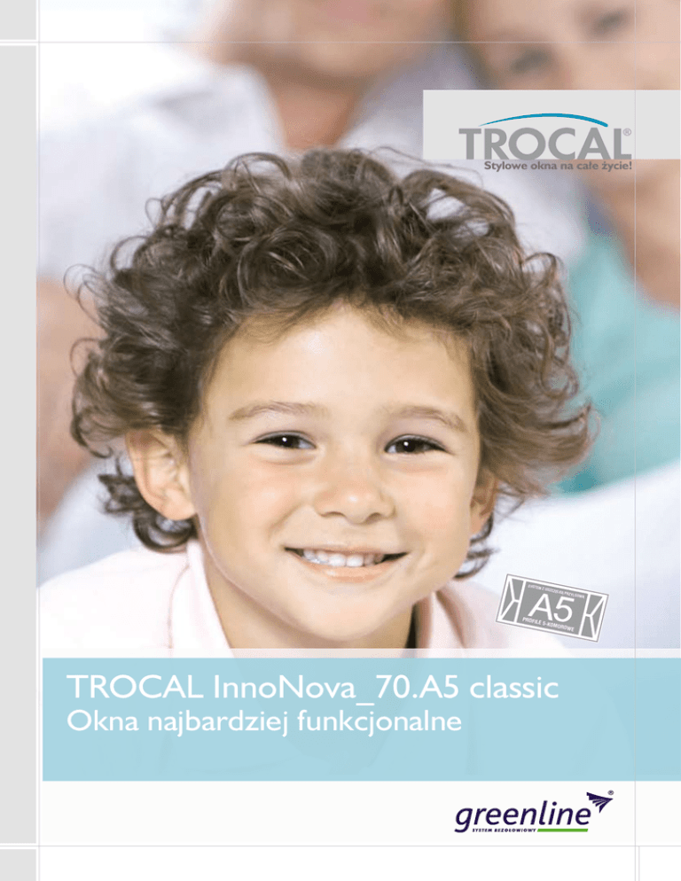 Stylowe okna na całe życie! SYSTEM PROF Z USZC ZELKĄ ILE 5-K OWĄ OMOR TROCAL InnoNova_70.A5 classic Okna najbardziej funkcjonalne PRZYLG OWE TROCAL InnoNova_70.A5 classic: Okna z uszczelką przylgową. Rozwiązania dla każdego stylu architektonicznego. Dzięki układowi niezlicowanych powierzchni ram i skrzydeł oraz atrakcyjnie małej szerokości widocznej TROCAL InnoNova_70.A5 classic stwarza możliwości dowolnej i wyjątkowej aranżacji fasad. System ten potrafi sobie zjednać klientów nie tylko przez swój wygląd: W/(m Kolory i wzory Podwyższona sztywność System 5-komorowy Podwyższona izolacja cieplna System z uszczelką przylgową wyróżnia się zastosowaniem wewnętrznej i zewnętrznej uszczelki o zwiększonej powierzchni przylegania. Dzięki zastosowaniu nowoczesnych systemów przewietrzania, okna są wentylowane tam gdzie powinny (aprobata techniczna AT-15-6179/2006). Elastyczne uszczelki o długotrwałej żywotności gwarantują perfekcyjną ochronę przestrzeni między skrzydłem a ościeżnicą okna. Wyjątkowy w swoim rodzaju kształt komór, wzorowany na najlepszych rozwiązaniach natury, przypominający plastry miodu. Rozwiązanie to zapewnia wysoką stabilność okna i niedopuszcza do odkształcenia się profili. Stylowe okna na całe życie! Profile okienne występują w bogatej palecie kolorów. Powlekane jedno-, jak i dwustronnie okleiną o strukturze drewna lub o strukturze uniwesalnej z fakturą gładką lub wytłaczaną. Zaostrzone wymogi, określone normami w zakresie ochrony energii cieplnej są spełnione z dużą nadwyżką. Uzyskujemy to dzięki głębokości budowlanej równej 70 mm i ilości komór powietrznych wewnątrz kształtowników okiennych. Zastosowanie tego rozwiązania pozwala na osiągnięcie jednego z najlepszych w tej klasie współczynnika przenikania ciepła Uf rzędu 1,3 W/m2K. Profine Polska Sp. z o. o. TROCAL Profilsysteme ul.Strachowicka 40 54-512 Wrocław Tel: +48 71 347 11 60 - 64 Fax: +48 71 354 71 62 e-mail: [email protected] www.oknagreenline.pl www.trocal.com.pl to nowa generacja profili stabilizowanych bezołowiowo Profine Polska 1,3²K) Podwyższona szczelność Zmiany techniczne zastrzeżone! Numer zamówienia: 61003572 Uf